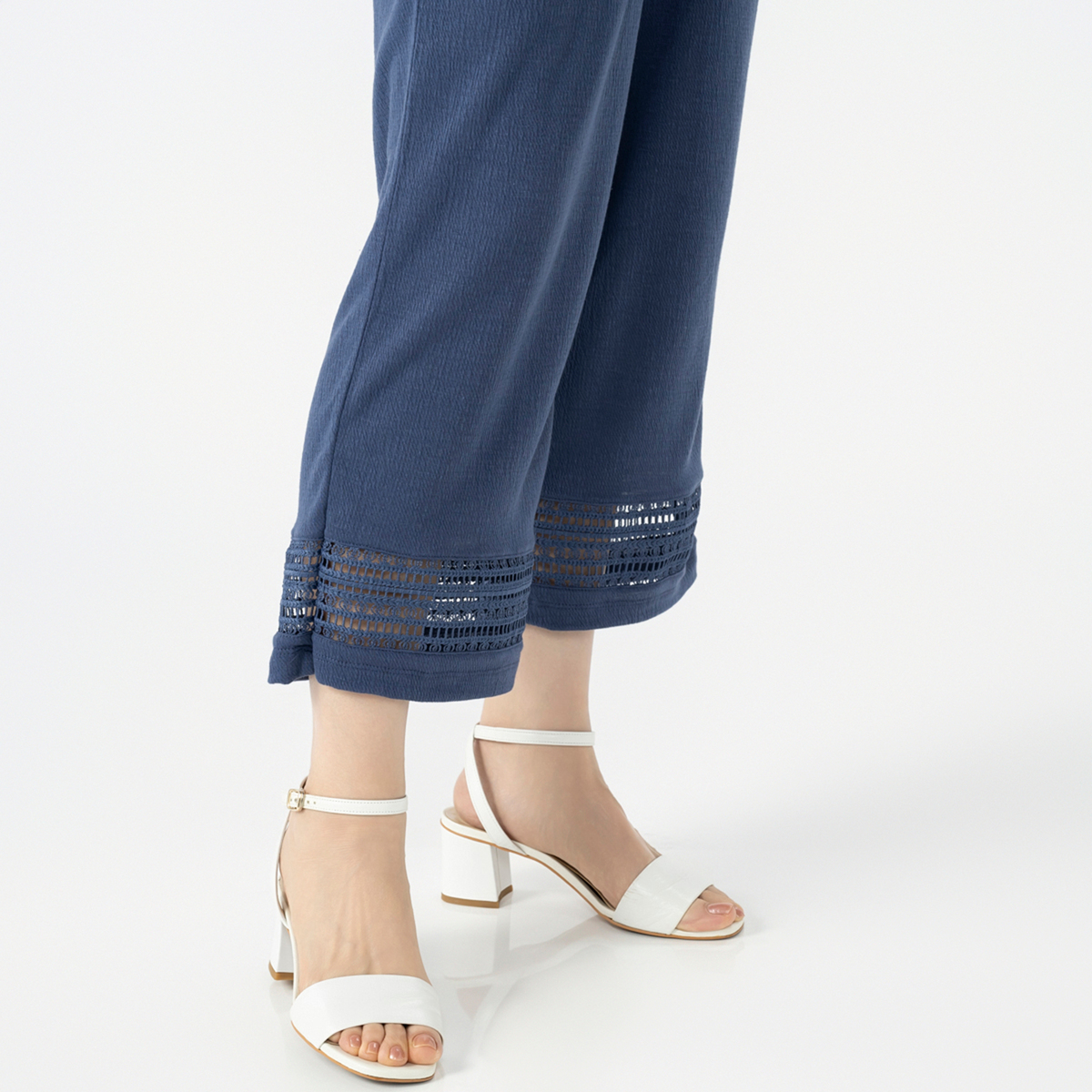カットソーガーゼ素材に、同色レースを裾へあしらったデザインパンツ。ウエストは全体がゴムのプルオン仕様で着脱も楽な穿き心地です。前左右にポケットを備え、洗濯機で手軽に扱えるのも嬉しいポイントです