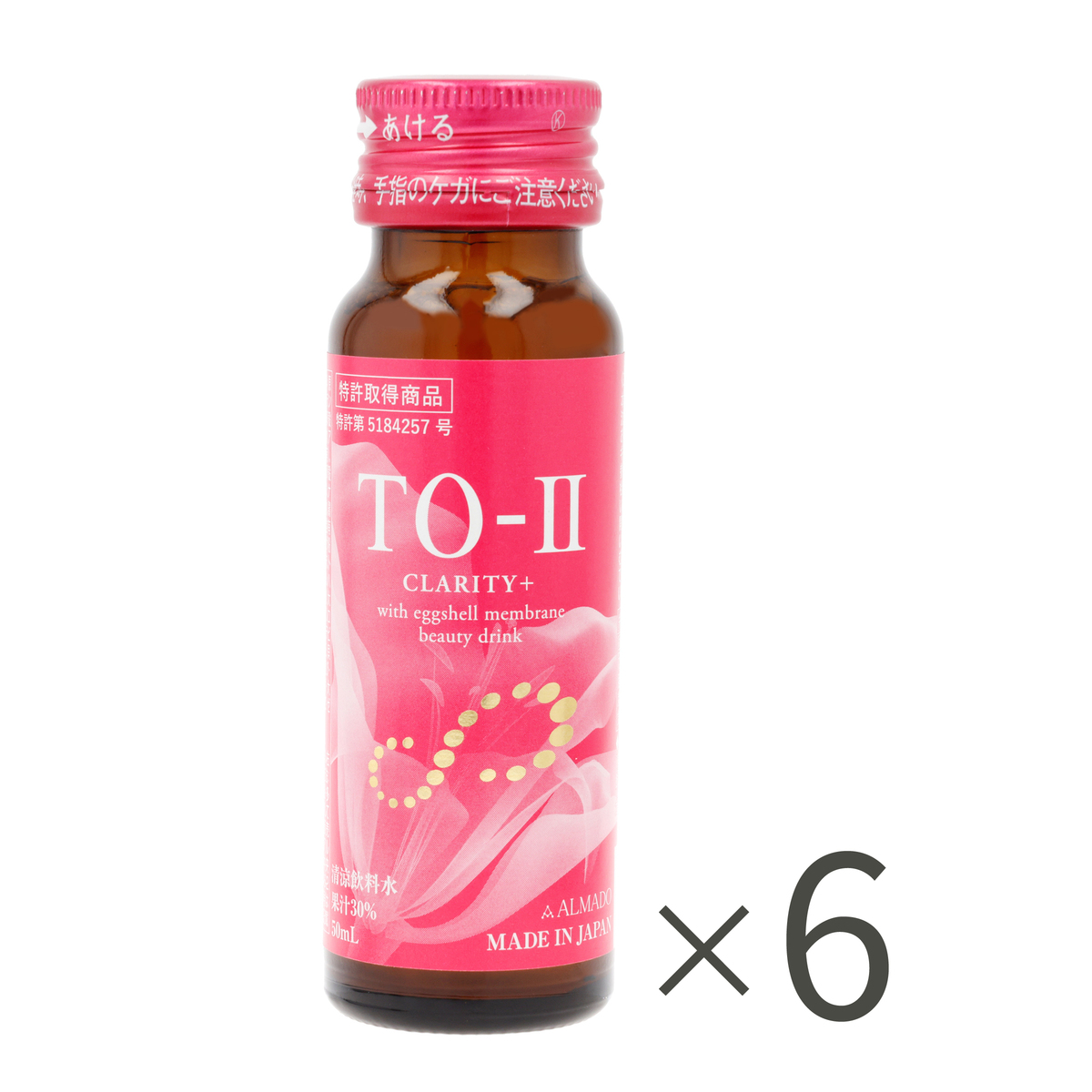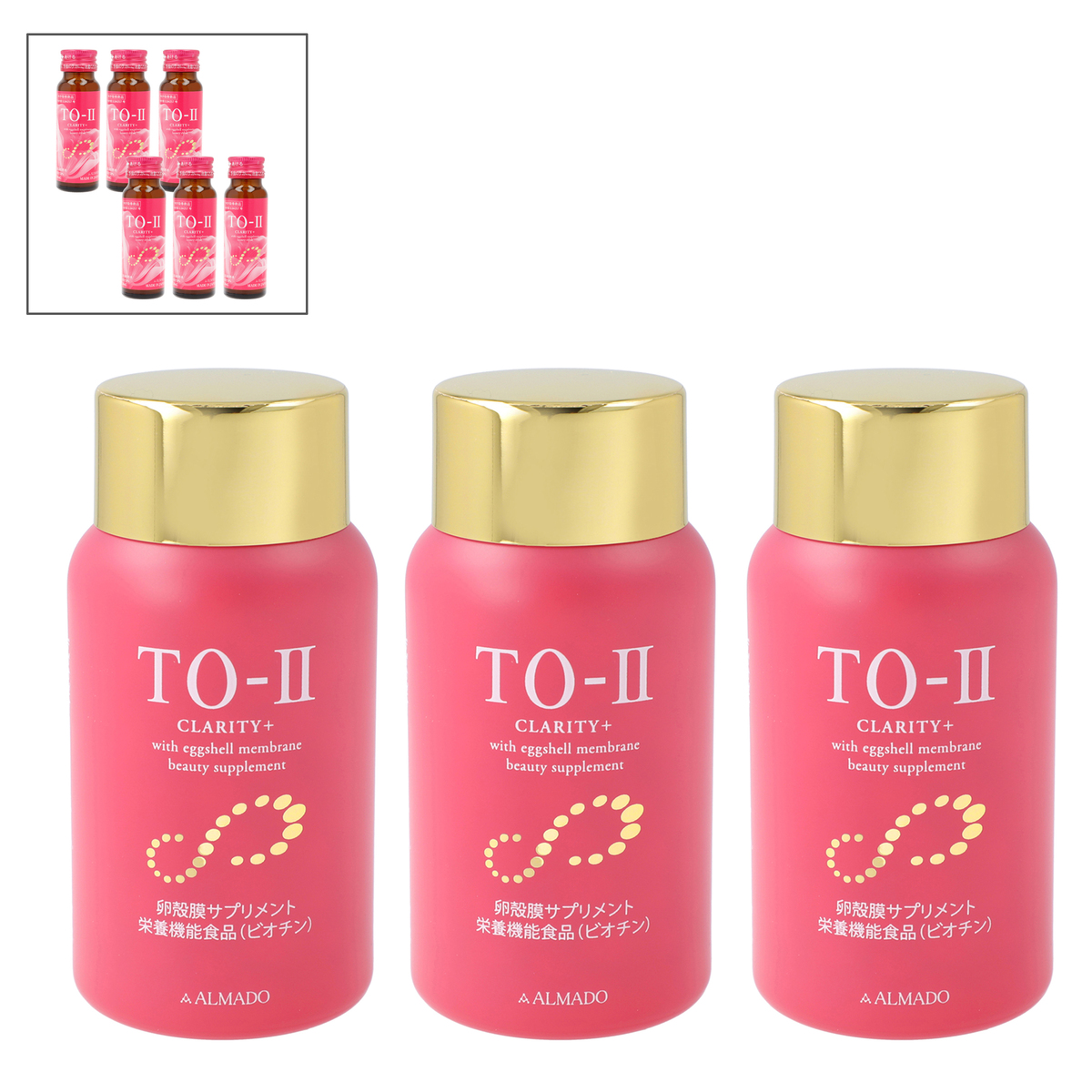 [アレルギー物質特定原材料8品目] 卵、乳、えび、かに [セット内容] ・TOーII CLARITY+ 270粒×3 ・TOーII ビューティードリンク CLARITY+ (50mL×3本)×2※プレゼント <TOーII CLARITY+> [目安量] 1日2〜3粒 [お召し上がり方] 1日2〜3粒を目安にそのまま水などと一緒にお召し上がりください [栄養成分表示]2粒〜3粒(1,080mg〜1,620mg)当たり エネルギー3.3kcal〜5.0kcal たんぱく質0.415g〜0.622g 脂質0.014g〜0.021g 炭水化物0.384g〜0.577g 食塩相当量0.027g〜0.041g ビオチン17.3μg〜25.9μg 1日当たりの摂取目安量に含まれる当該栄養成分の量が栄養素等表示基準値(対象年齢18歳以上、基準熱量2200kcal)に占める割合 (栄養素等表示基準値2015)ビオチン 34%〜51% [保存方法] ・乳幼児の手の届かないところに置いてください ・直射日光と高温多湿を避けて保存してください。また、開封後はキャップをしっかりお閉めください ・本品はガラス容器を使用しておりますので取扱いにはご注意ください [注意事項] ※本品は、多量摂取により疾患が治癒したり、より健康が増進するものではありません。1日の摂取目安量を守ってください ※本品は、特定保健用食品と異なり、消費者庁長官による個別審査を受けたものではありません ※食生活は、主食、主菜、副菜を基本に、食事のバランスを ※開封後はなるべく早めにお召し上がりください ※体質・体調などによりまれに合わない場合は使用を中止してください ■栄養機能食品:ビオチン ビオチンは皮膚や粘膜の健康維持を助ける栄養素です [原料原産地] 卵殻膜粉末(国内製造) [原産国] 日本 <TOーII+ビューティードリンク CLARITY+> [目安量] 1日〜3日に1本 [お召し上がり方] 1日〜3日に1本を目安にお飲みください [栄養成分表示]1本(50ml)あたり エネルギー19.5kcal たんぱく質0.45g 脂質0g 炭水化物4.6g 食塩相当量0.05g [保存方法] 直射日光、高温・多湿を避けて保存してください [原料原産地] りんご果汁(ニュージーランド製造) [原産国] 日本 [注意事項] ※本製品の底部に卵殻膜粉末が沈殿しております。よく振ってお飲みください ※食物アレルギーのある方は原材料名をご参照の上お飲みください ※開栓時はキャップで手を切らないようにお気をつけください ※開栓後はすぐにお飲みください ※お体に合わない場合は飲む量を控えるか、飲用を中止してください ※加熱、冷凍はしないでください [原材料] <TOーII CLARITY+> 卵殻膜粉末(国内製造)、水解卵殻膜粉末、還元麦芽糖、乳糖、難消化性デキストリン、デキストリン、鶏胸肉抽出物(アンセリン・カルノシン15%含有)、卵白カラザ粉末、エラスチンペプチド、卵白ペプチド、乾燥ローヤルゼリー、プロテオグリカン含有サケ鼻軟骨抽出物/卵殻カルシウム、結晶セルロース、シェラック、トウモロコシたん白、 ゼラチン、増粘剤(アラビアガム)、ステアリン酸カルシウム、ヒアルロン酸、ビオチン、カルナウバロウ、クチナシ色素、(一部に卵・乳成分・さけ・鶏肉・豚肉・ゼラチンを含む) <TOーII+ビューティードリンク CLARITY+> りんご果汁(ニュージーランド製造)、フラクトオリゴ糖、水解卵殻膜粉末、玄米黒酢、鶏胸肉抽出物(アンセリン・カルノシン15%含有)、フィッシュコラーゲンペプチド、卵殻膜粉末、N-アセチルグルコサミン、ナツメ抽出物、キダチアロエ抽出物、鶏軟骨エキス、プロテオグリカン含有サケ鼻軟骨抽出物、卵白カラザ粉末、ローヤルゼリー、アセロラ粉末、トウモロコシ胚芽抽出粉末/トレハロース、乳酸、香料、 V.C、安定剤(大豆多糖類)、ユッカ抽出物、ヒアルロン酸、甘味料(スクラロース、ステビア)、クエン酸鉄Na、V.B2、V.E、貝Ca、(一部にえび・かに・卵・さけ・大豆・鶏肉・りんご・ゼラチンを含む)