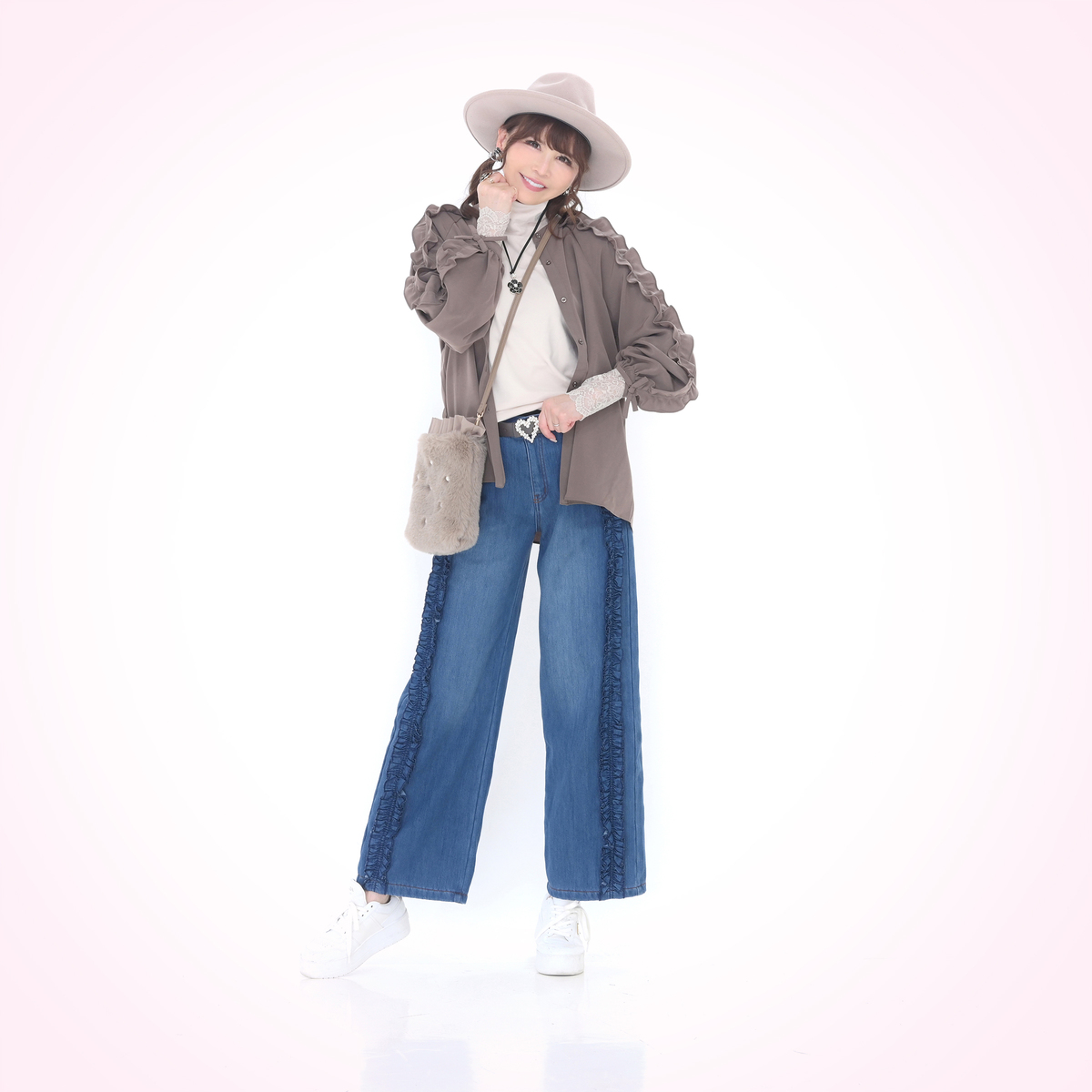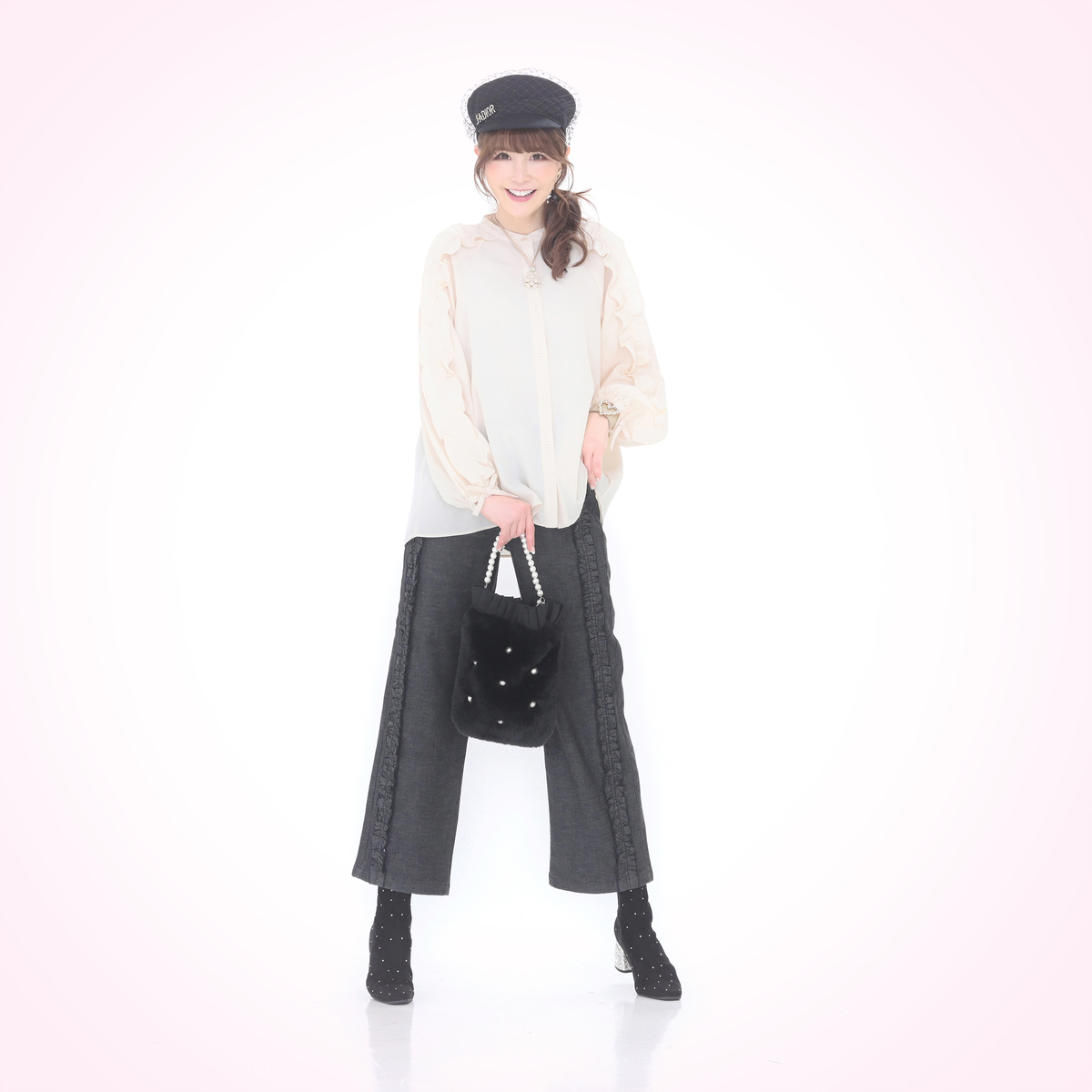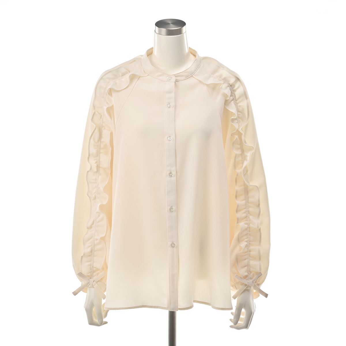 肩から袖口までのフリルがしなやかなドレープを演出。ギャザーの分量も大人にちょうど良く、袖口のリボンが手元を華やかに彩ります