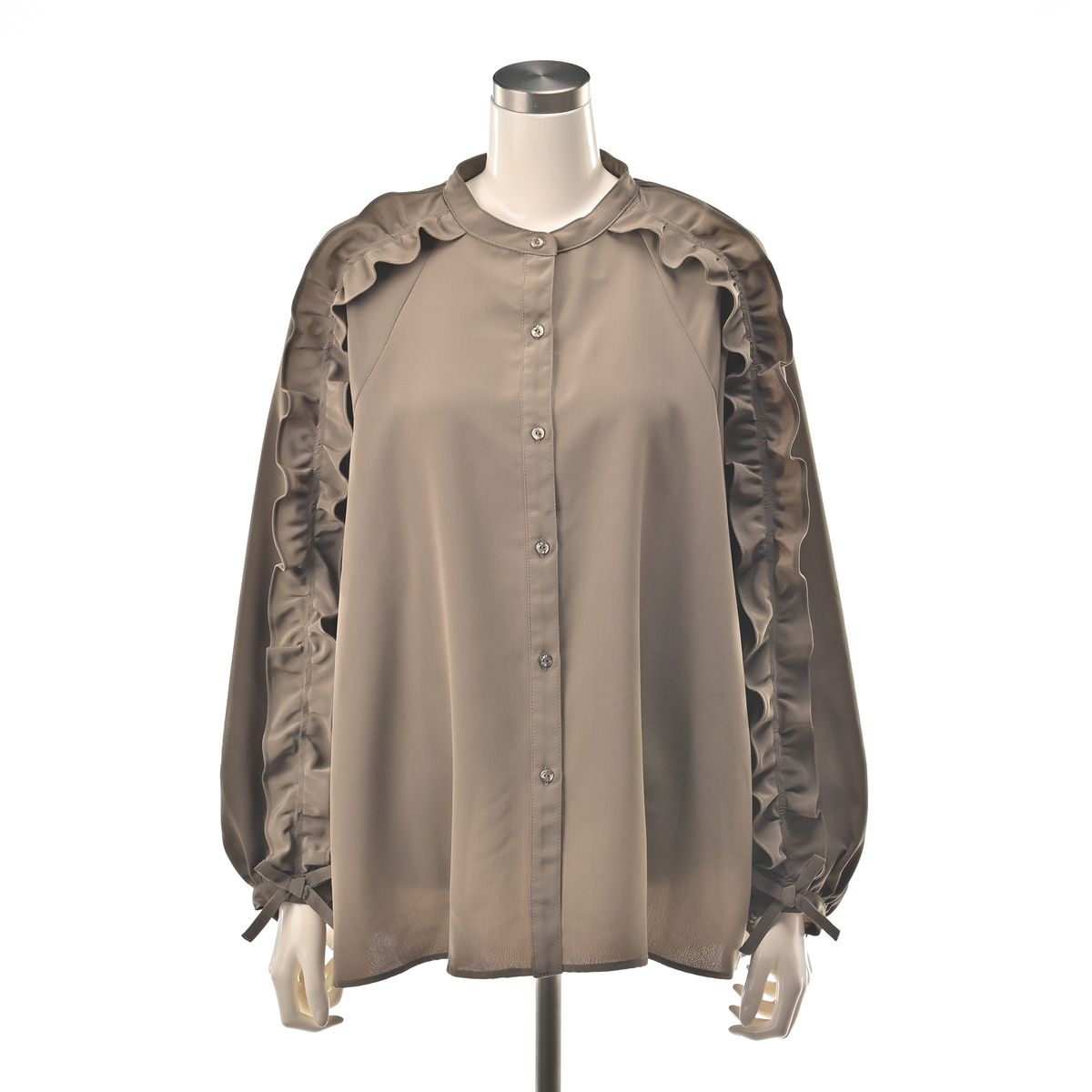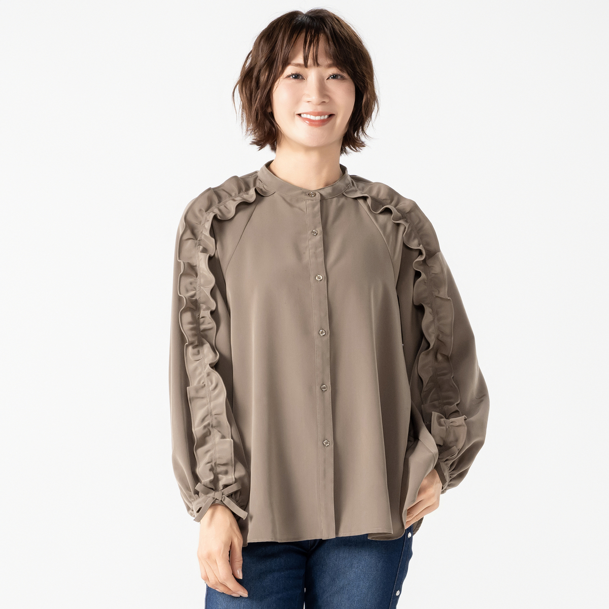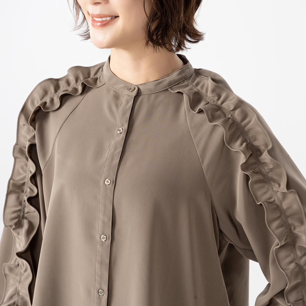定番のバンドカラーで顔周りをすっきりと演出。袖の華やかさを引き立てながら、ボタンを外せば暖かいインナーとの組合せも楽しめます