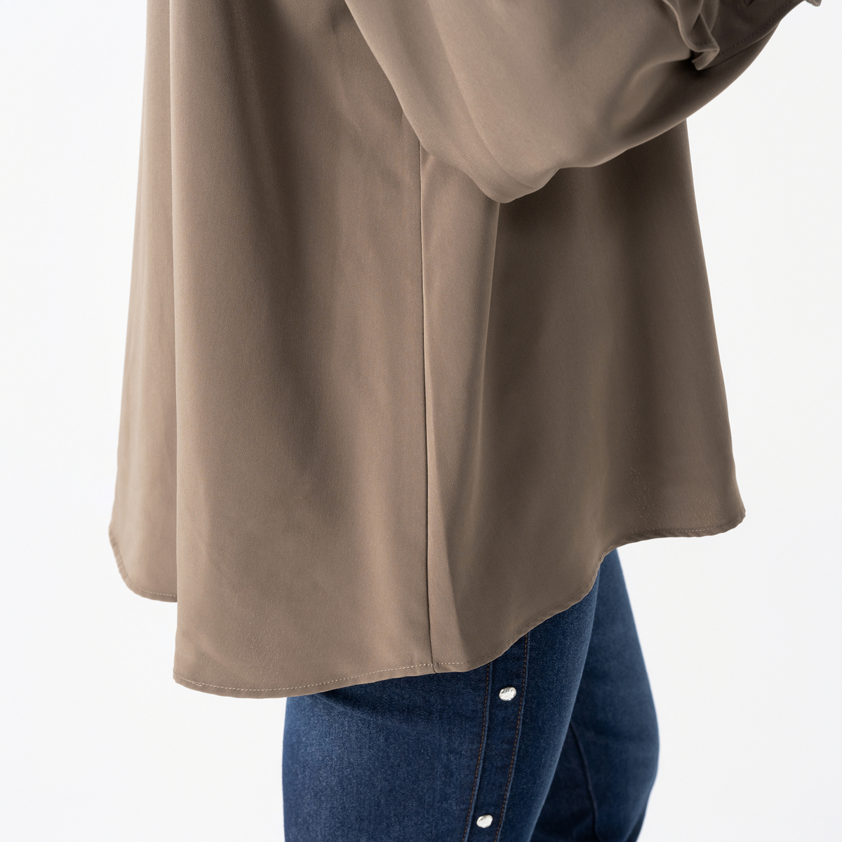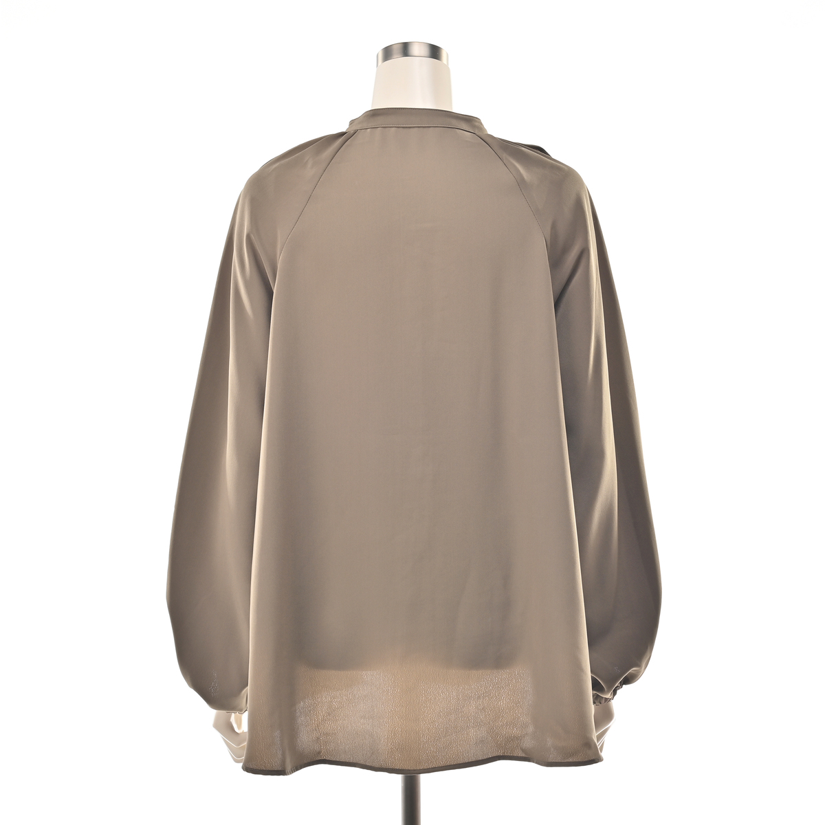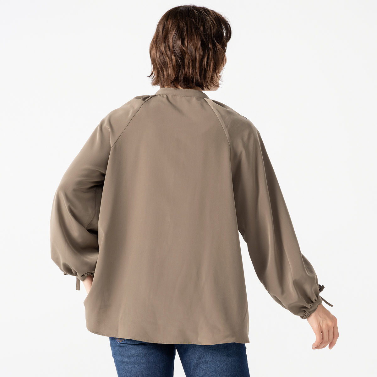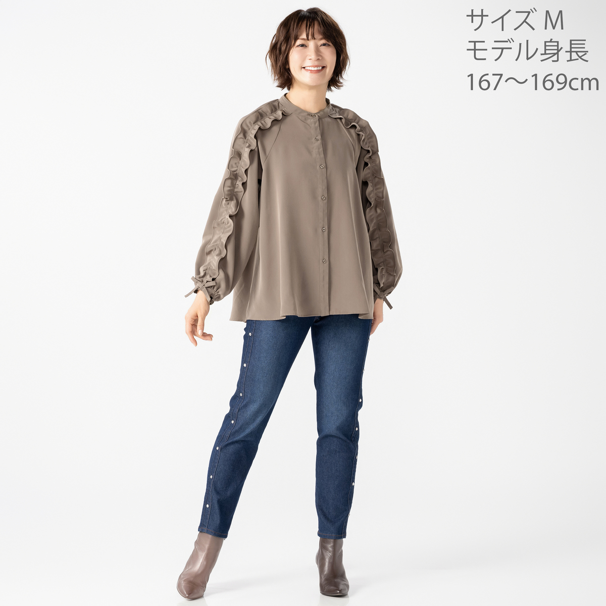 定番のバンドカラーで顔周りをすっきりと演出。袖の華やかさを引き立てながら、ボタンを外せば暖かいインナーとの組合せも楽しめます