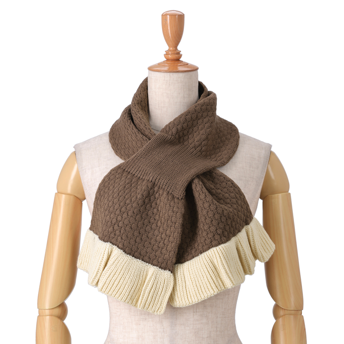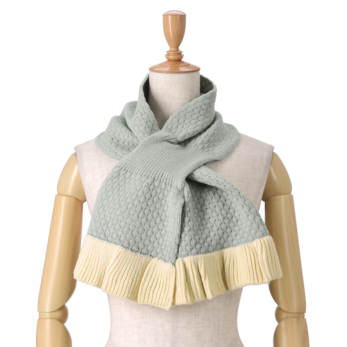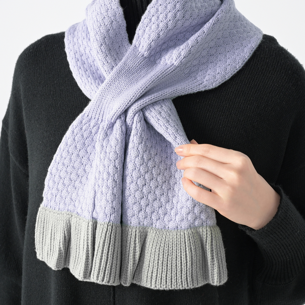 ポップコーンのようなニットの編地が特長のマフラー。上下端にはリブ編のフリルを施し、エレガントな印象に仕上げました