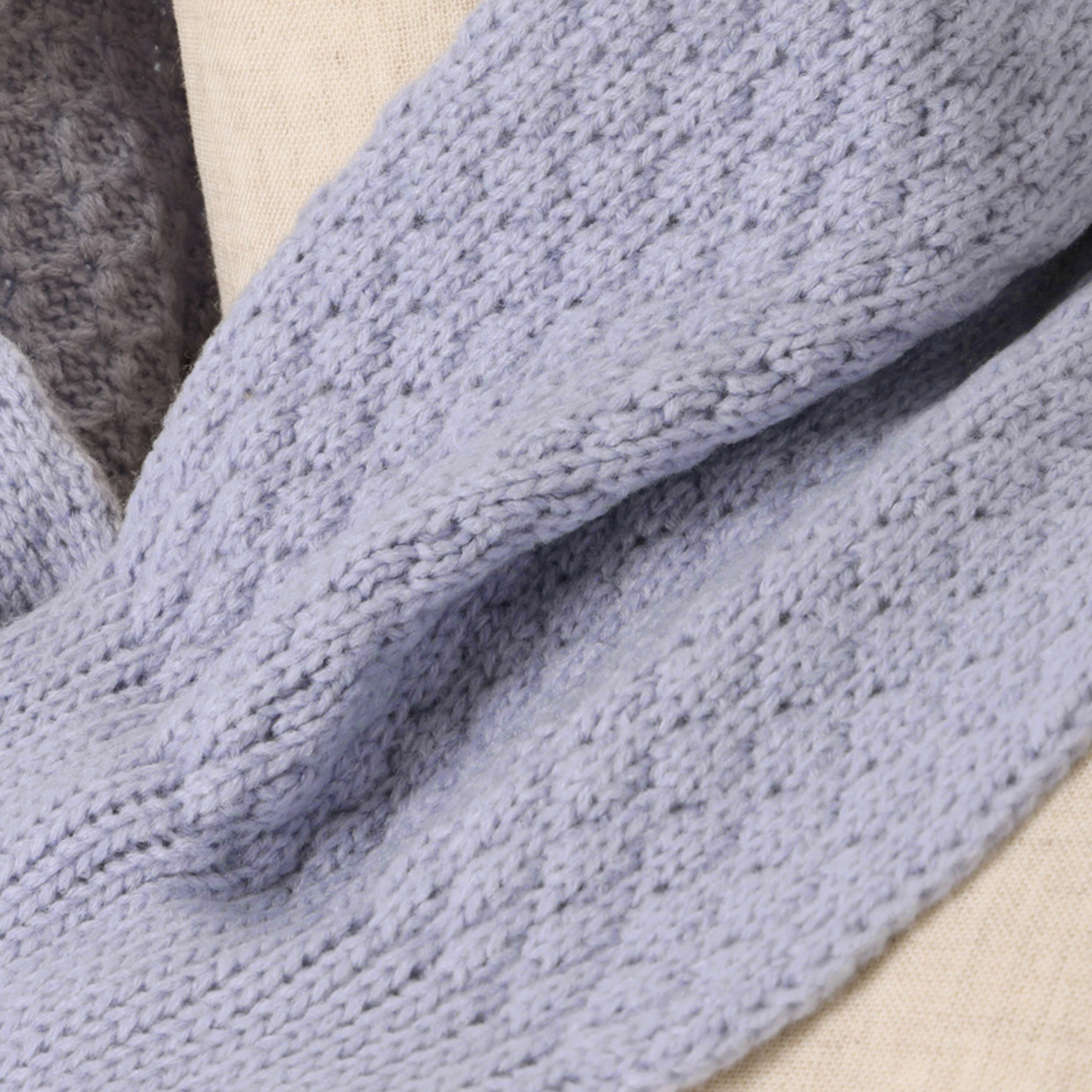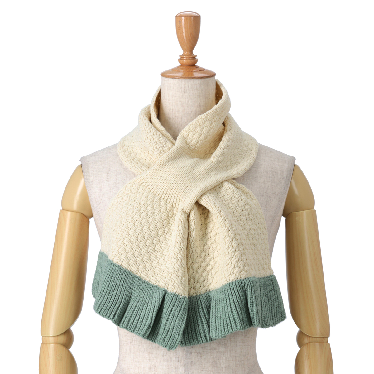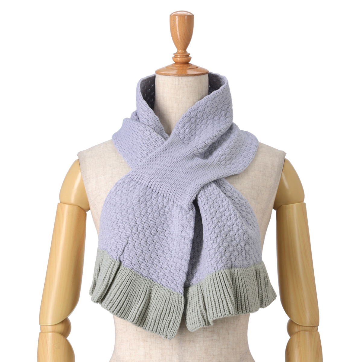 ポップコーンのようなニットの編地が特長のマフラー。上下端にはリブ編のフリルを施し、エレガントな印象に仕上げました
