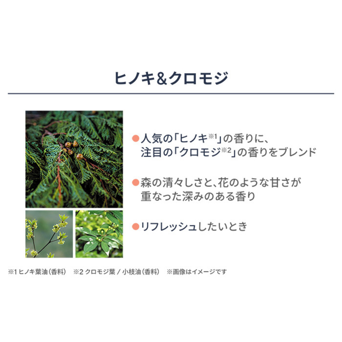 ヒノキ精油とクロモジ精油(ヒノキ葉油、クロモジ葉/小枝油(香料))をブレンドし、森の清々しさに花のような甘さが重なった、深みのある香りが楽しめます