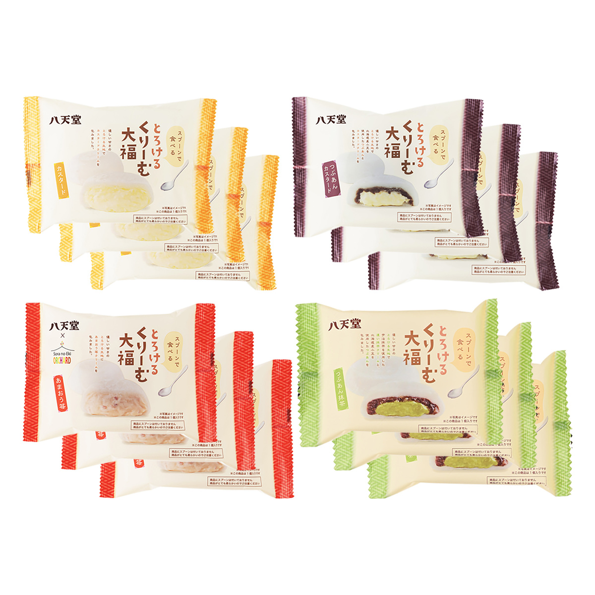 和菓子屋から始まった初代八天堂の味を現代に活かした新感覚スイーツ。手で持って食べることができない(*)ほど柔らかく、冷たいままでもくちどけの良い、"スプーンで食べる"大福です