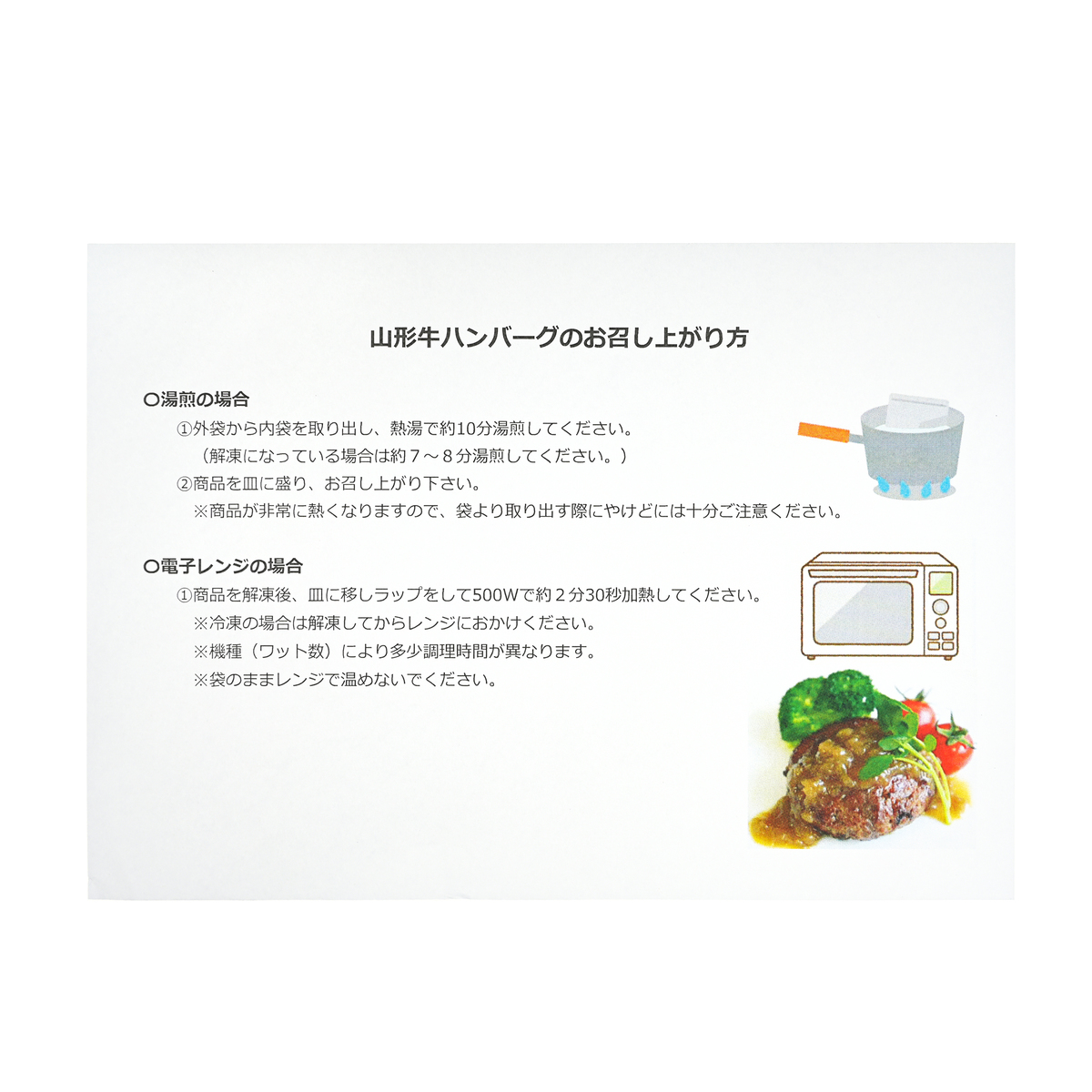 [アレルギー物質特定原材料8品目] 卵、小麦 [内容量] 120g×5 [賞味期限] 出荷時点で賞味期限まで120日以上ある商品をお届けします [保存方法] 開封前:ー18℃以下で保存してください 開封後:お早めにお召し上がりください [お召し上がり方] お召し上がり方:外袋から内袋を取り出し、熱湯で約10分湯せんしてお召し上がりください 電子レンジの場合:商品を解凍後、皿に移しラップをして約2分30秒(500w)加熱してください [注意事項] 加熱をしてお召し上がりください <湯煎の場合> ※商品が非常に熱くなりますので、袋より取り出す際にやけどには十分ご注意ください <電子レンジの場合> ※冷凍の場合は解凍してからレンジにおかけください ※機種(ワット数)により多少調理時間が異なります ※袋のままレンジで温めないでください [原料原産地] 牛肉(山形県産)、玉ねぎ(国産) [原産国] 日本 [原材料] 牛肉(山形県産)、玉ねぎ(国産)、つなぎ(パン粉、鶏卵)、食塩、香辛料、(一部に牛肉・小麦・卵を含む)