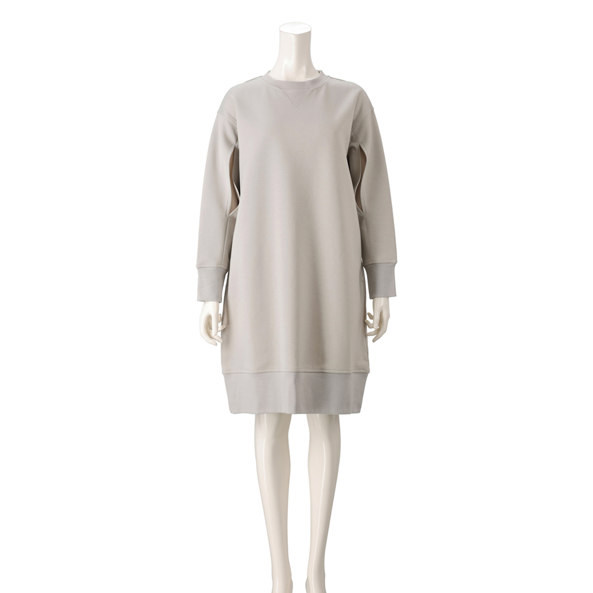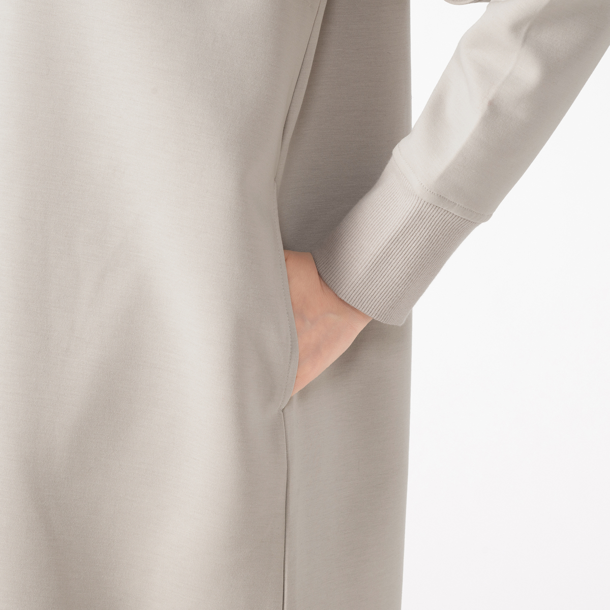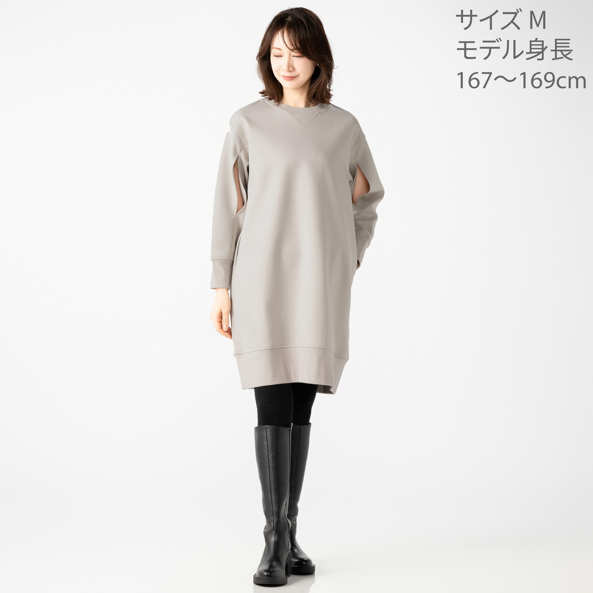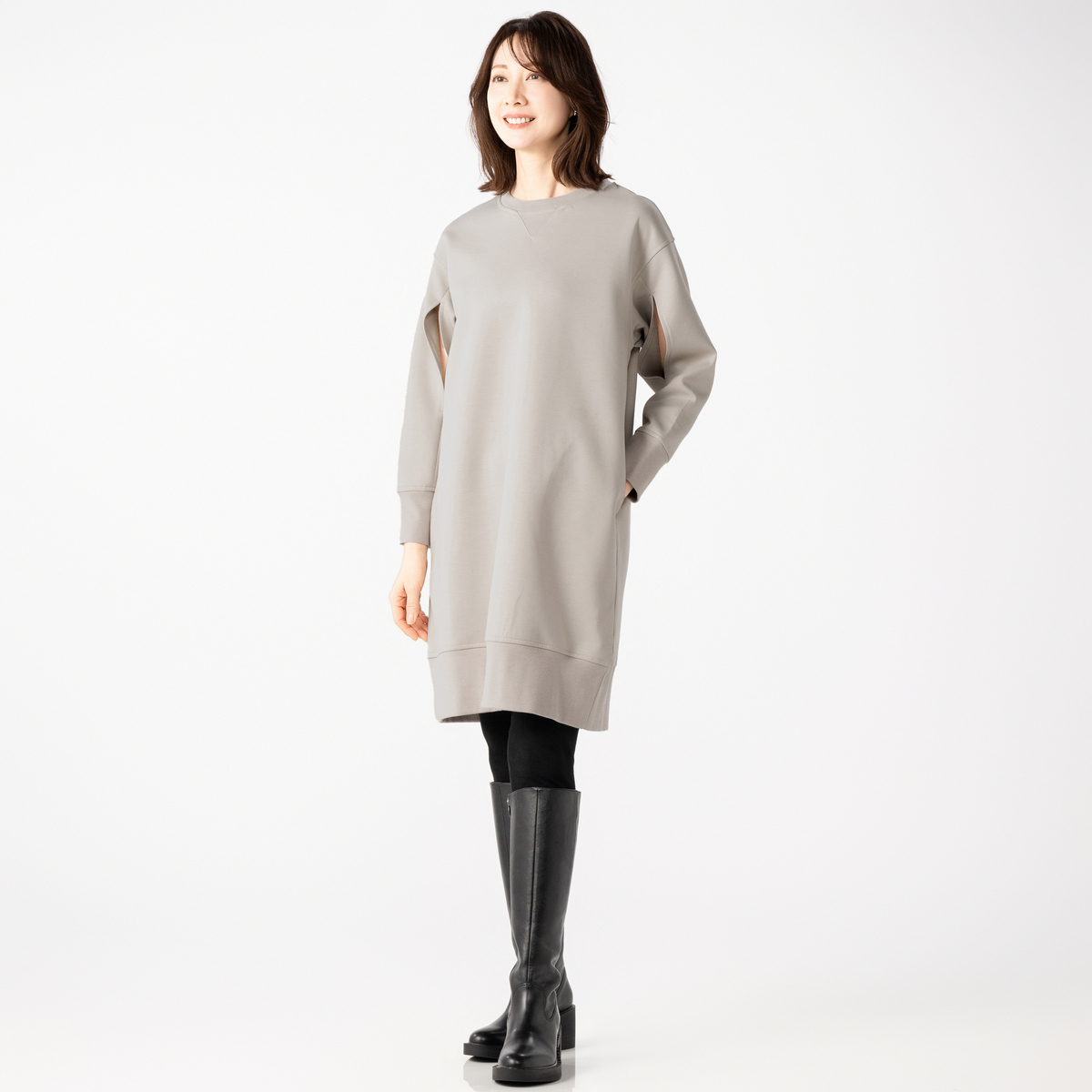 ハイゲージのダンボールニットで仕立てたワンピース。布帛見えの素材感と、シンプルなシルエットできれいめに着こなせます
