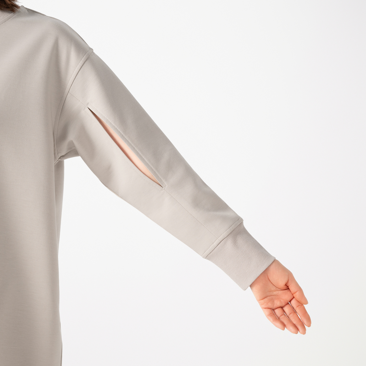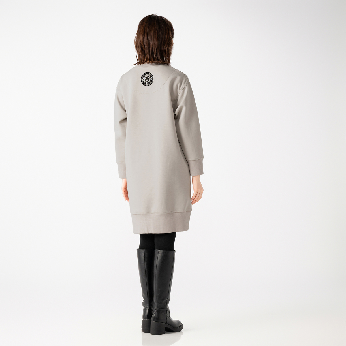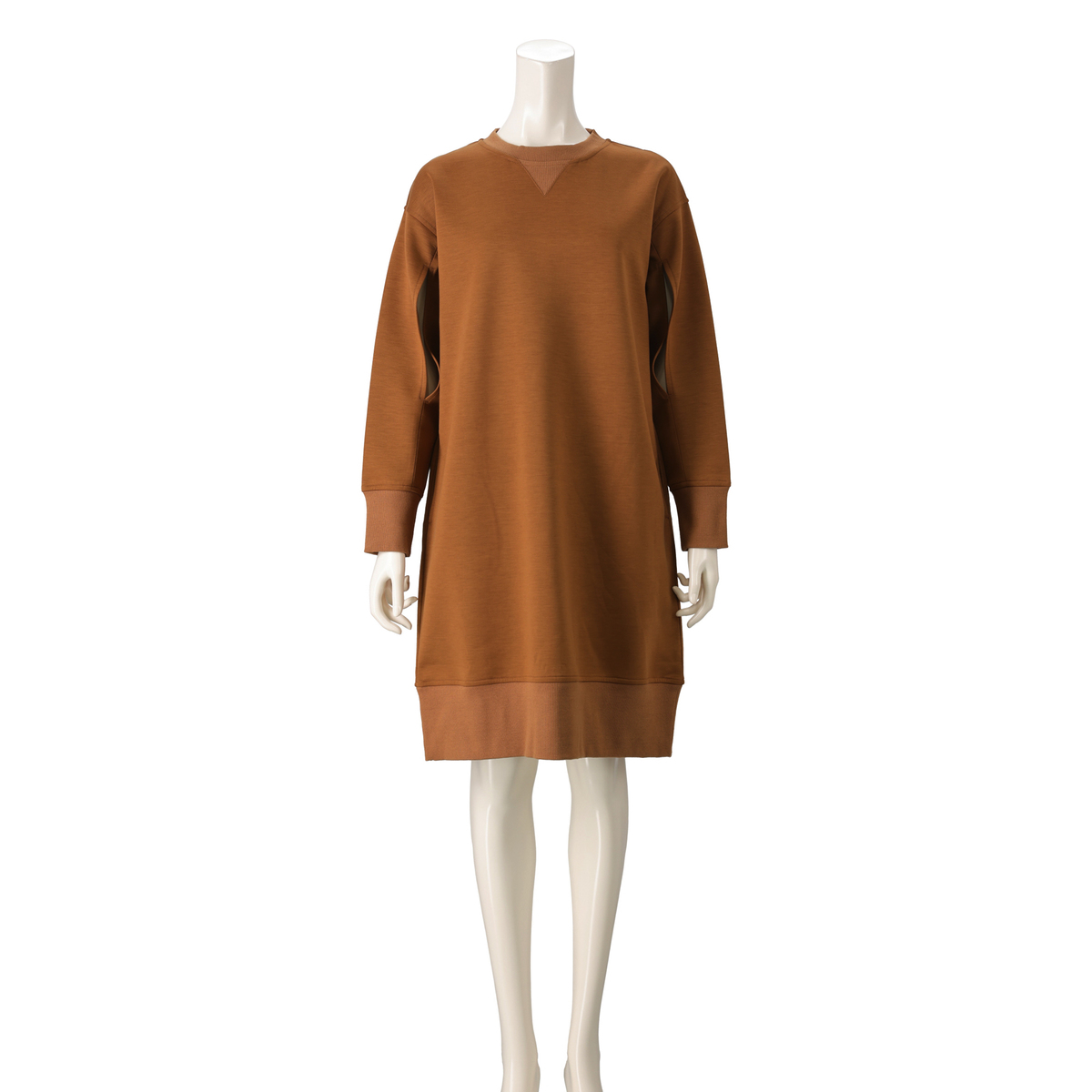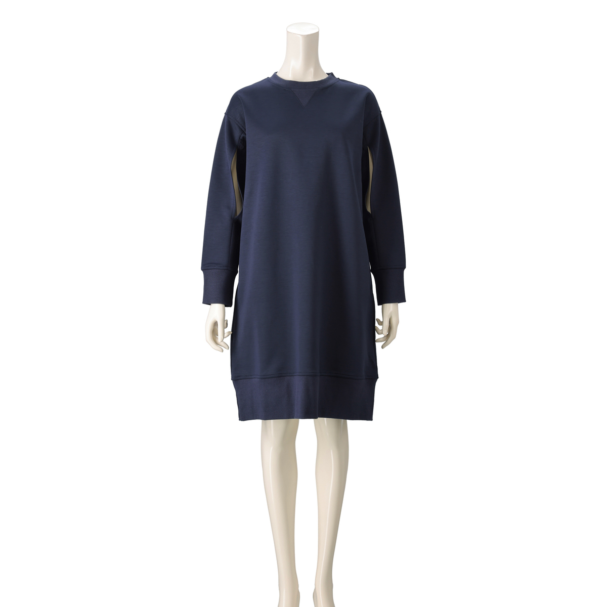 ハイゲージのダンボールニットで仕立てたワンピース。布帛見えの素材感と、シンプルなシルエットできれいめに着こなせます