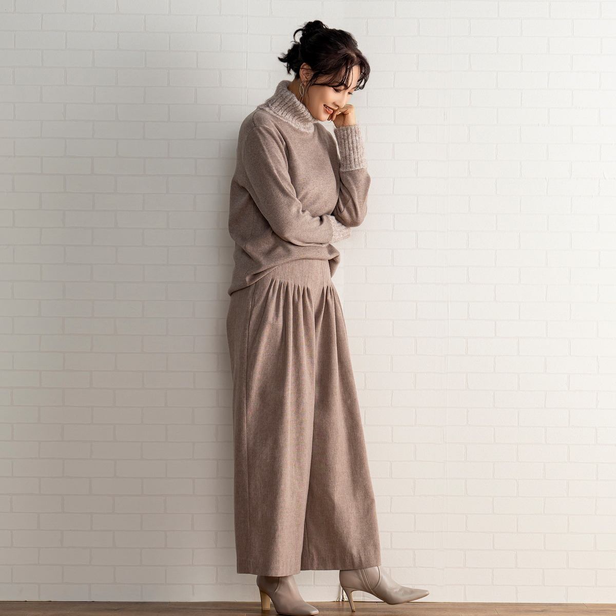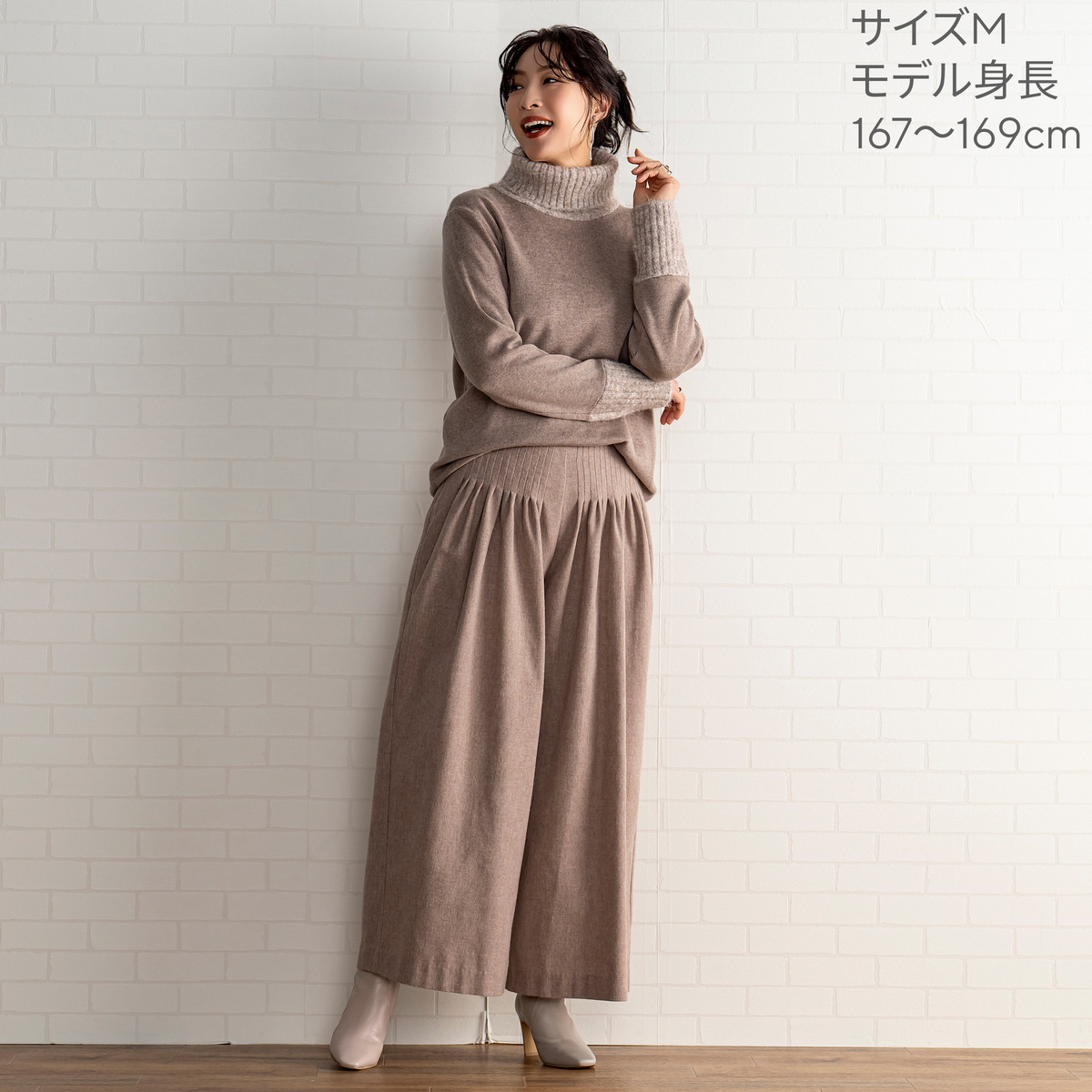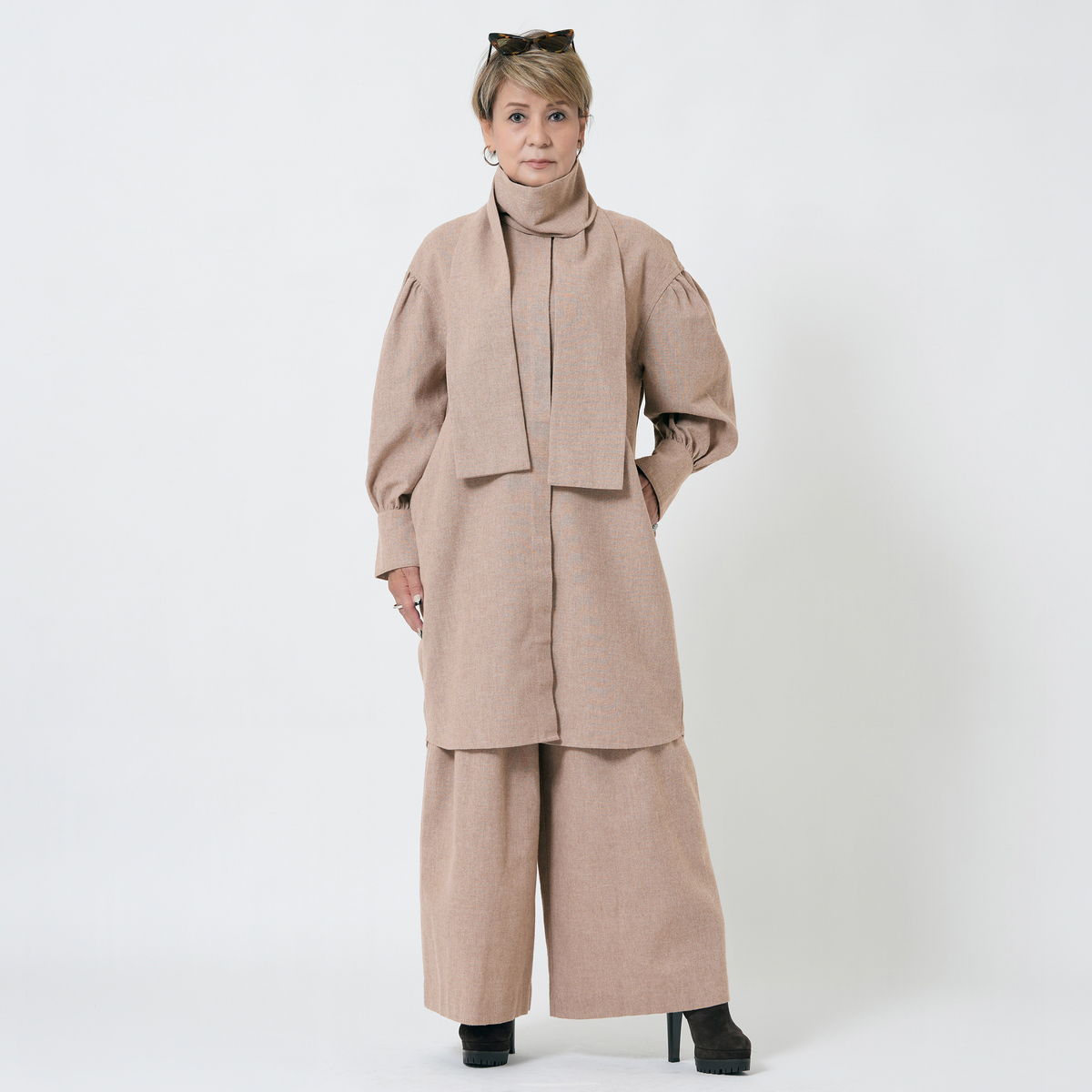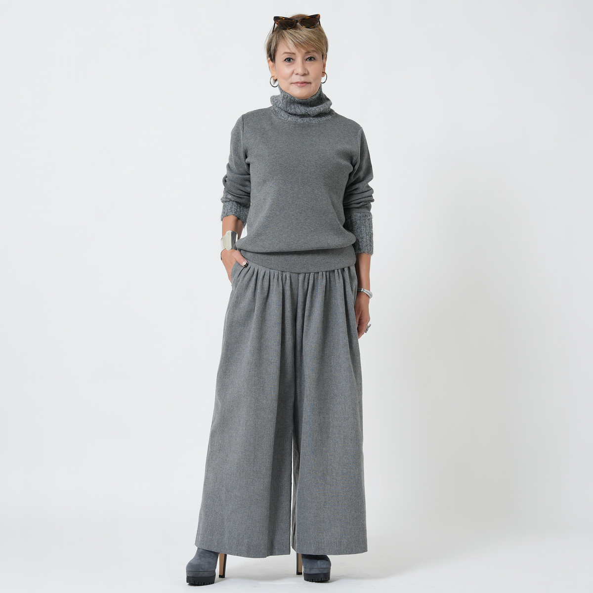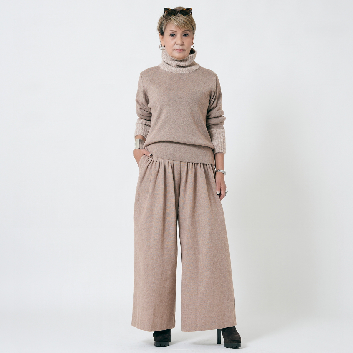 MASAGOさんのお洋服はたくさん持っていて、今回も何点も購入しましたが、今回購入の中で、153センチ身長の私にタックがたくさん入ったこちらのパンツ、大丈夫かなーと思ってました。が、大正解、厚底スニーカーで合わせれば、丈もちょうどよかったし、タックのおかげで、お腹周りもスッキリ。ふわっとしても太って見えない。かっこいい感じとこなれ感がでて大満足です。さっき到着して試着して、すぐにこちらを着用して外出してます。タックをたくさん入れるパンツはもう作れないかもとマサゴさんがおっしゃってましたが、これは定番で作って欲しいパンツです。色違い買えばよかったです。いつも手にして思いますが、高級感が本当に素晴らしいです。素材もデザインも。また作るのは大変でしょうけどかっこいいお洋服待ってます!
