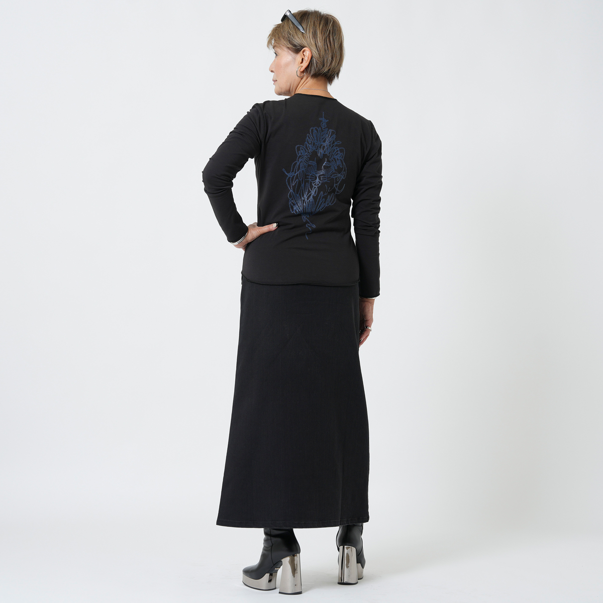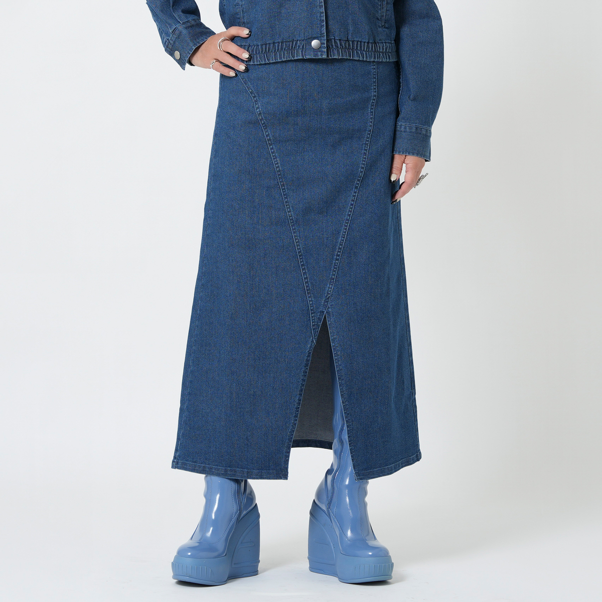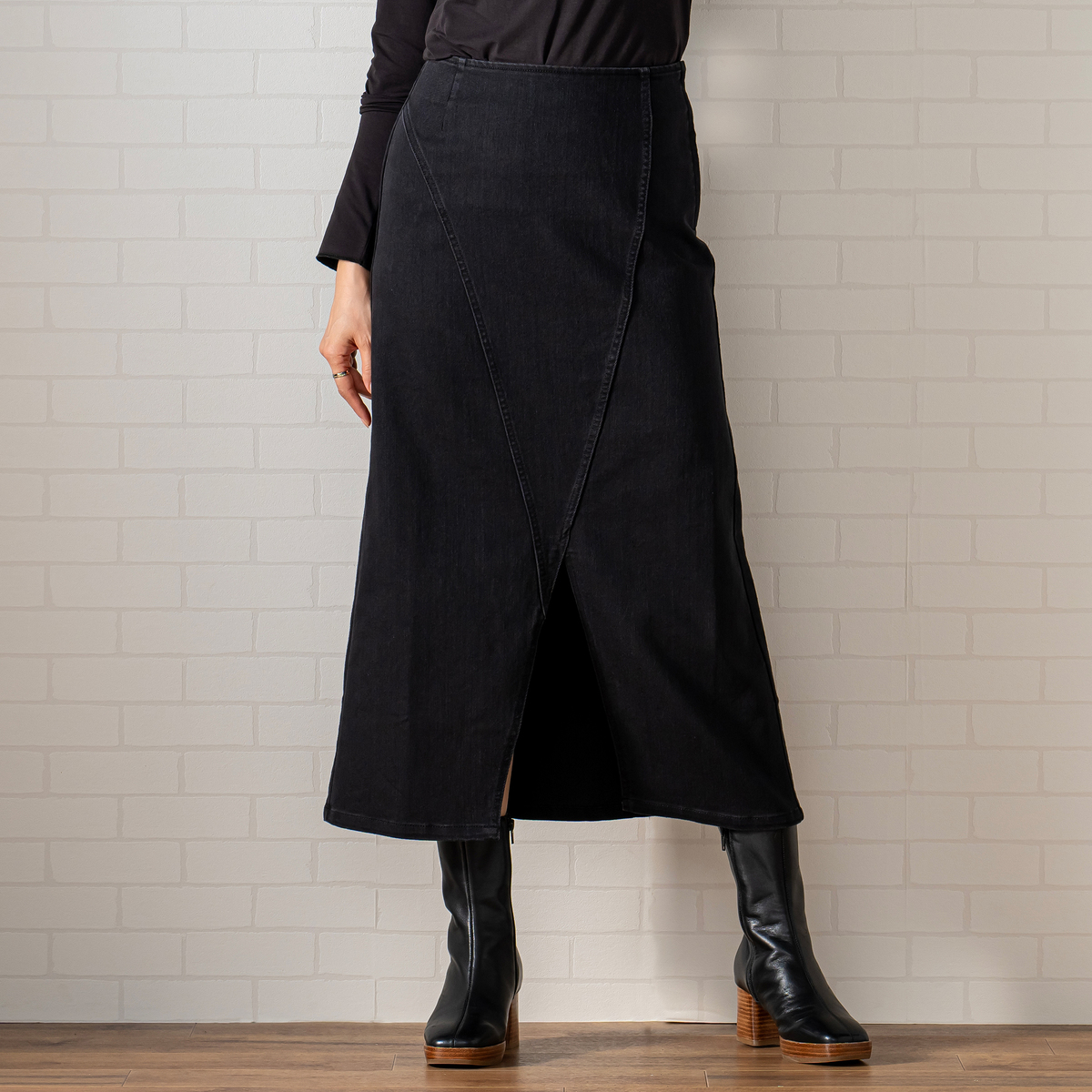 ストレッチデニム素材のロングスカートです。斬新な切り替えデザインがコーディネートに個性を加え、着る人のセンスを引き立てます