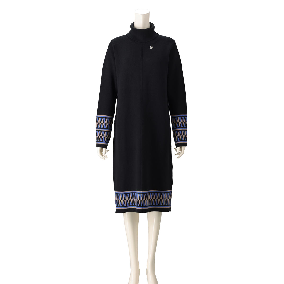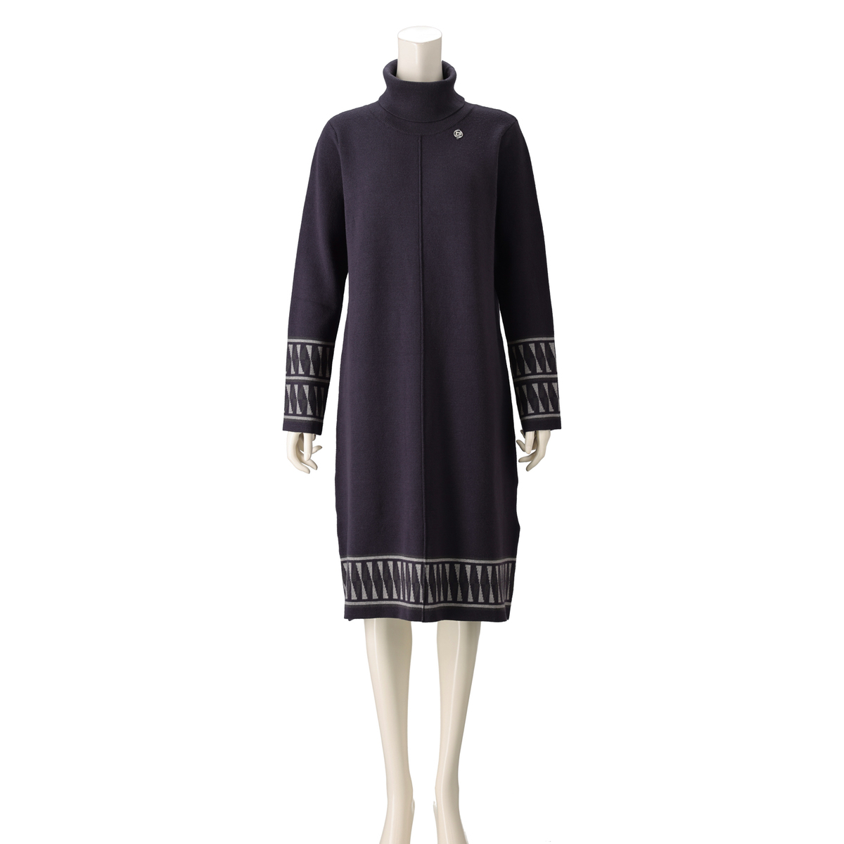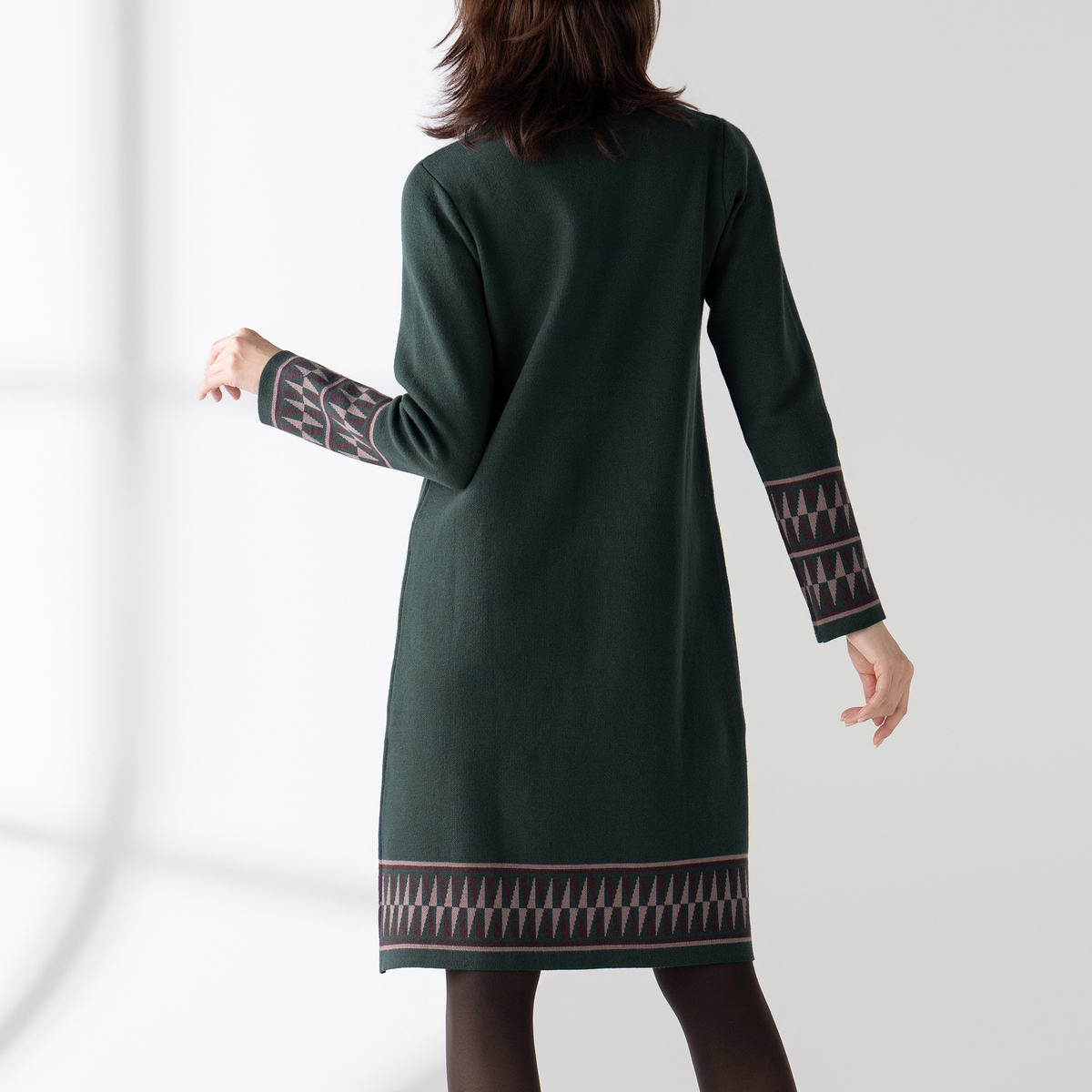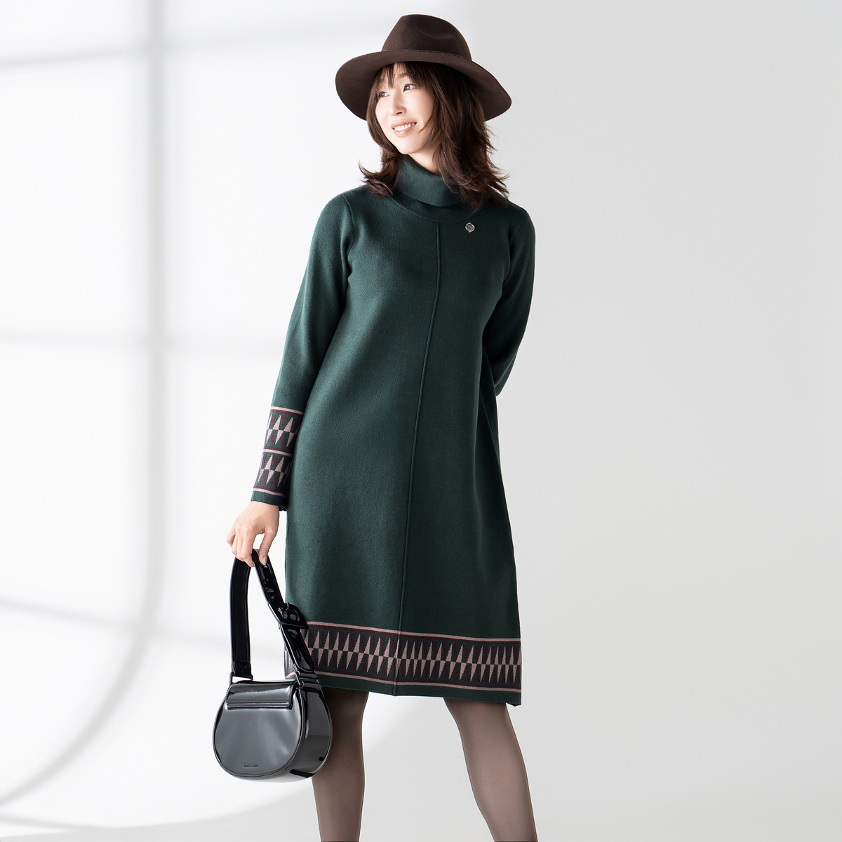 無地ニットにブランドらしさが際立つ、裾と袖口にオリジナルジャカード柄をあしらった、大人のニットワンピース。ジャカード柄には、モダンな印象を与えるジオメトリックモチーフを採用。シンプルな中にもデザイン性があり、着るだけで華やかさをプラスします