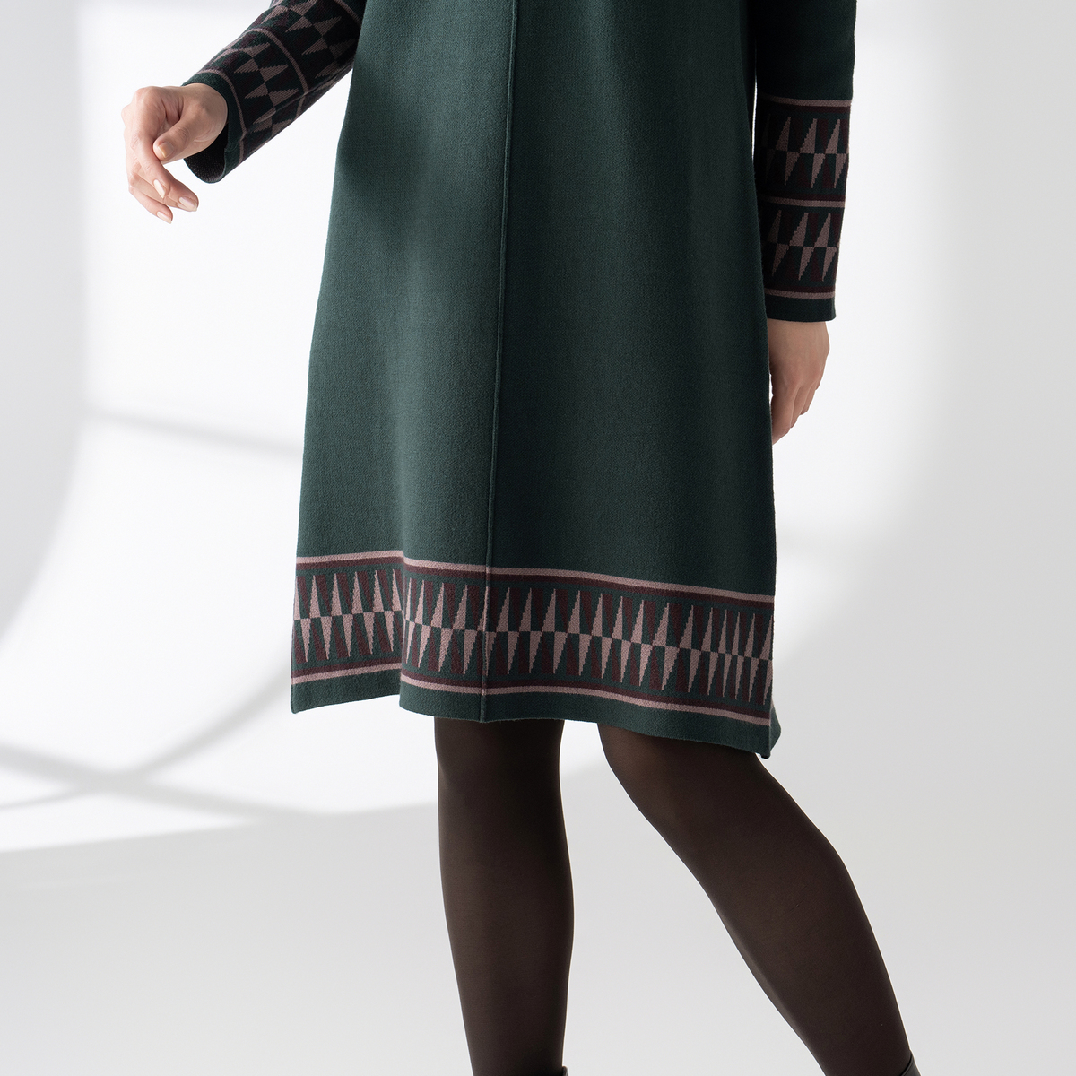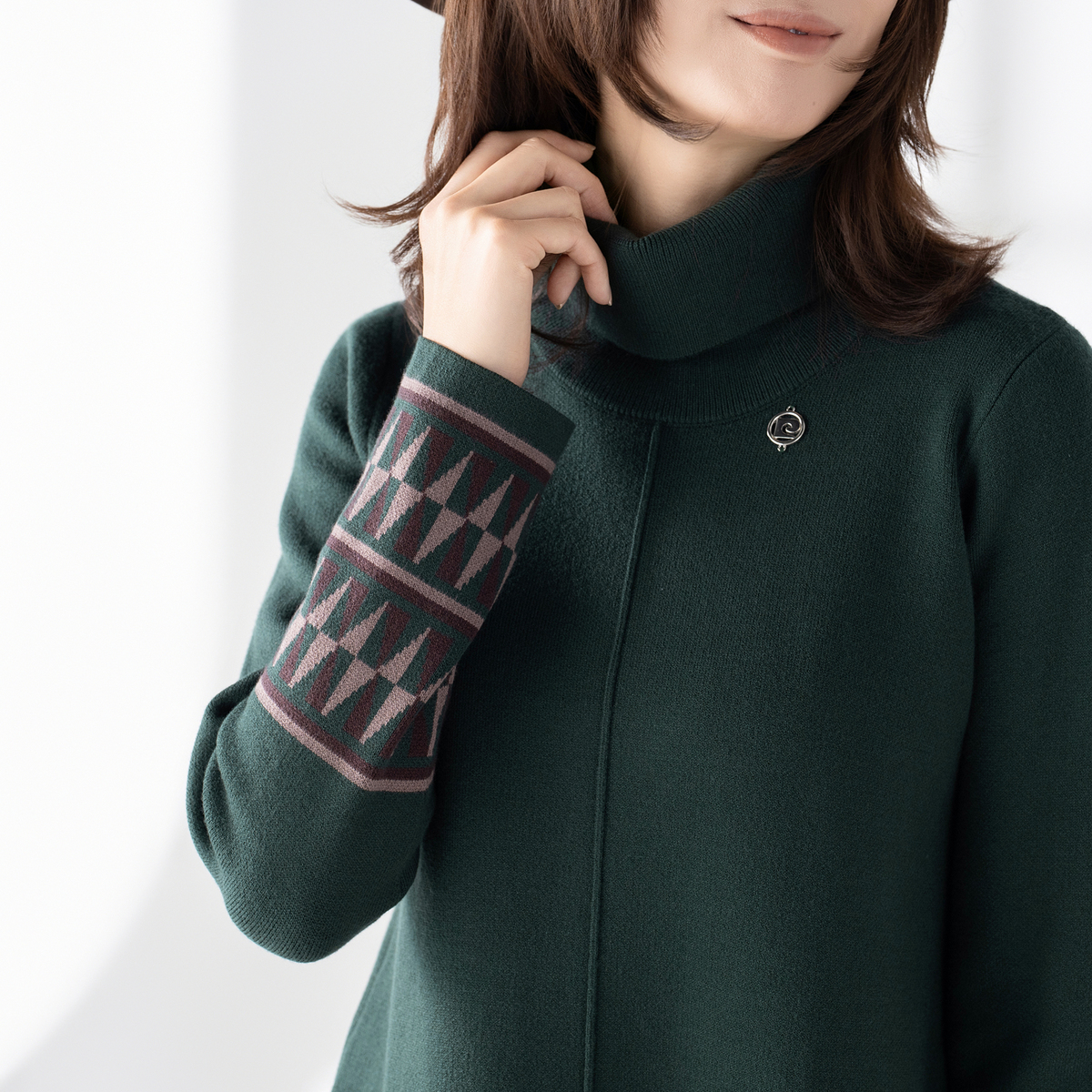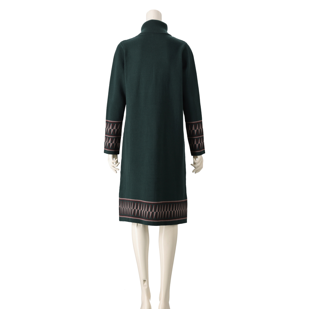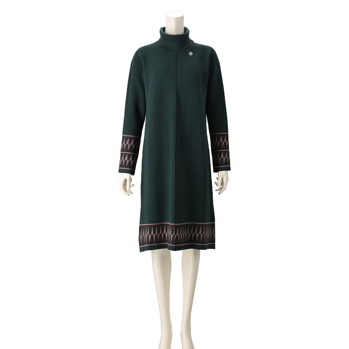 無地ニットにブランドらしさが際立つ、裾と袖口にオリジナルジャカード柄をあしらった、大人のニットワンピース。ジャカード柄には、モダンな印象を与えるジオメトリックモチーフを採用。シンプルな中にもデザイン性があり、着るだけで華やかさをプラスします