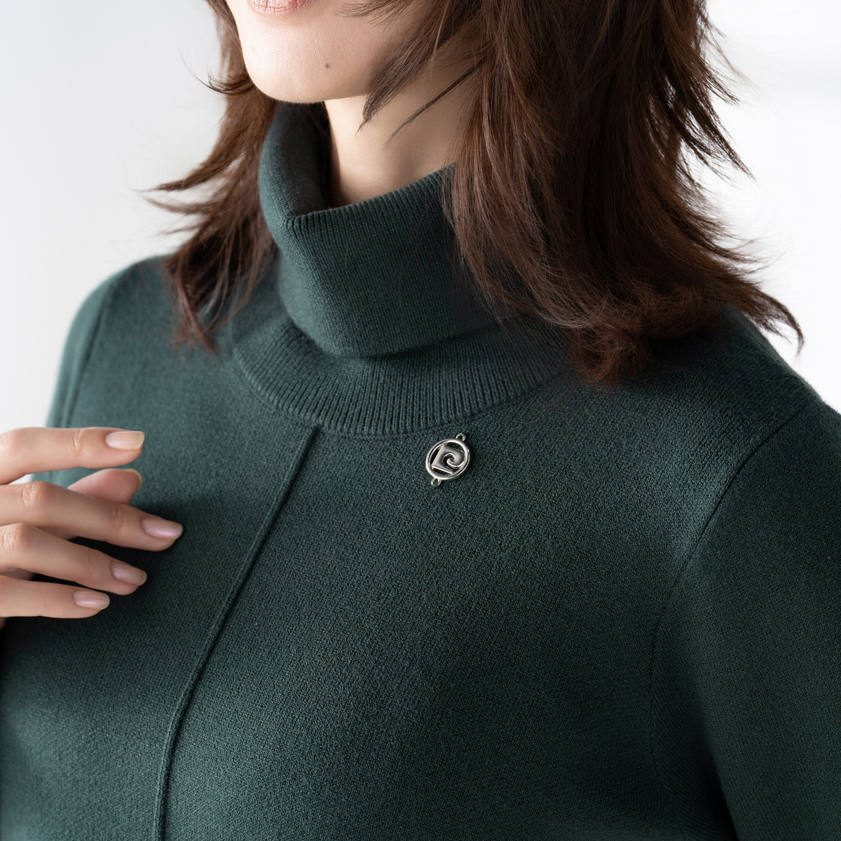 上品な光沢感がある糸を使用し、12ゲージのジャカード編みで作り上げました。首元はすっきりとしたタートルネック。衿元にはオリジナルロゴプレートを縫い付け上品なアクセントに。前中心のピンタックステッチが縦のラインを強調し、すっきり細見えを演出してくれます