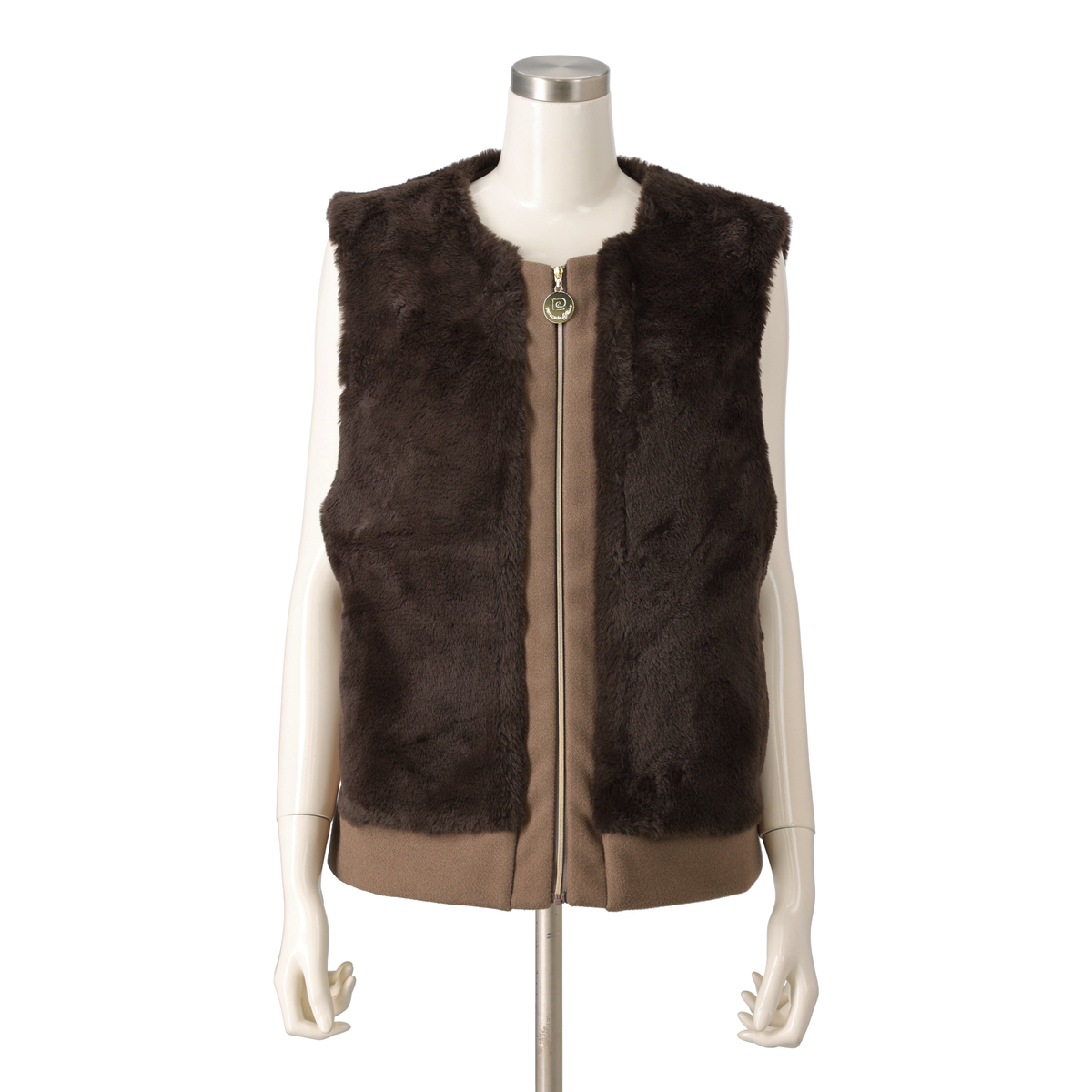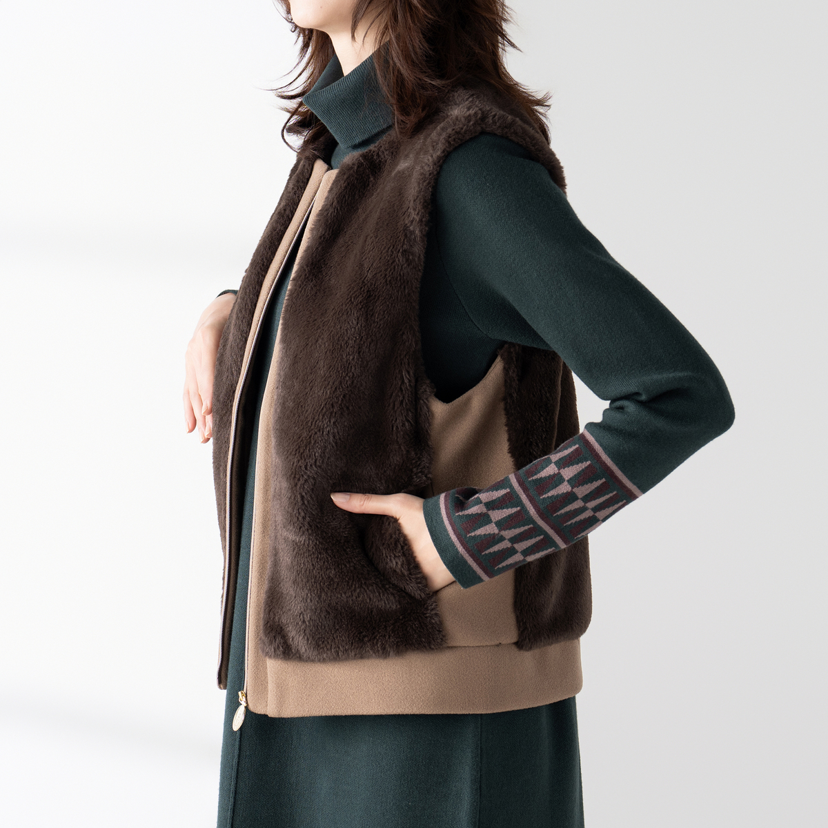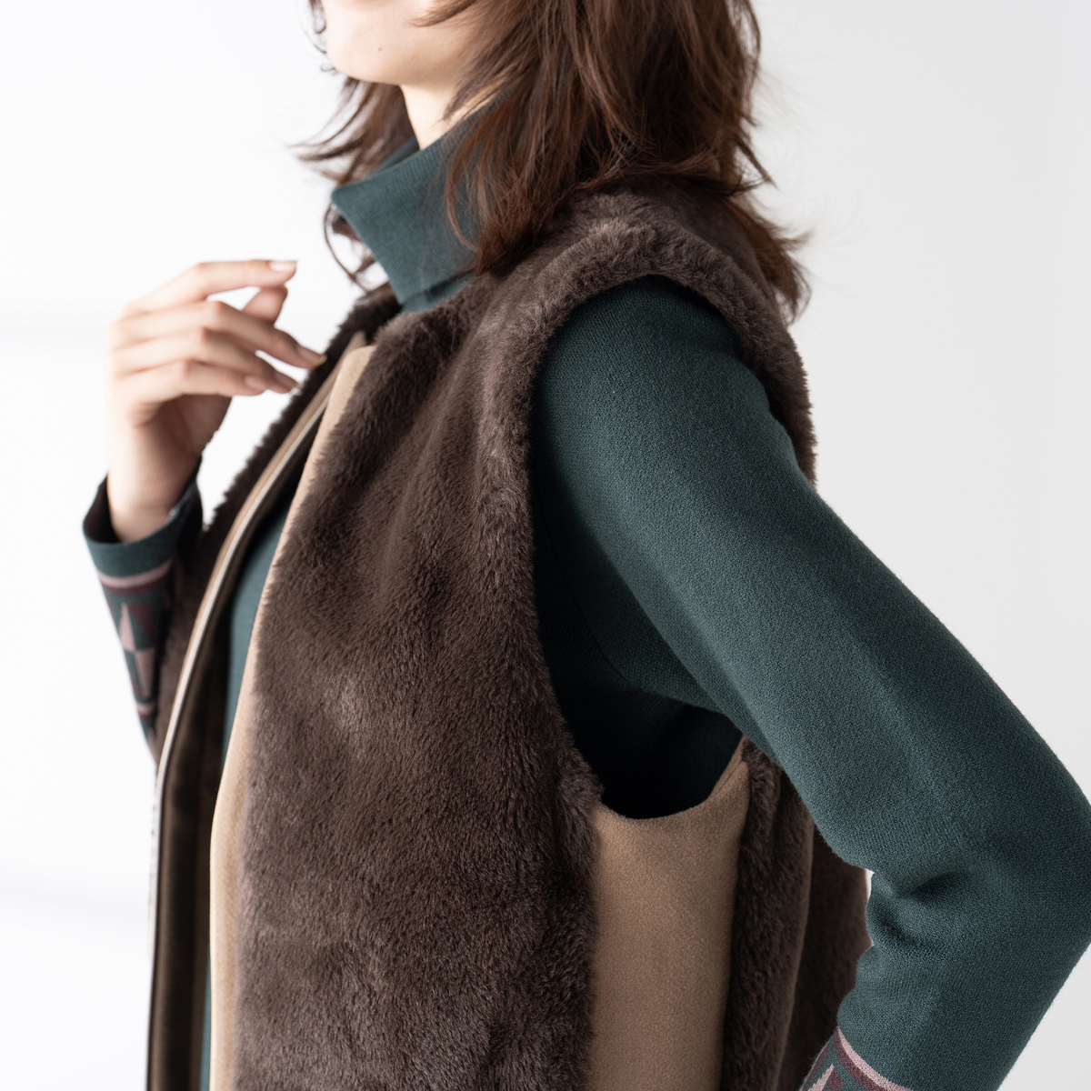 リアルファーのような艶と毛足が魅力のフェイクファーが、冬の装いを格上げ。タフタ裏地で滑りがよく、ニットの上からも快適に着脱できるジレです