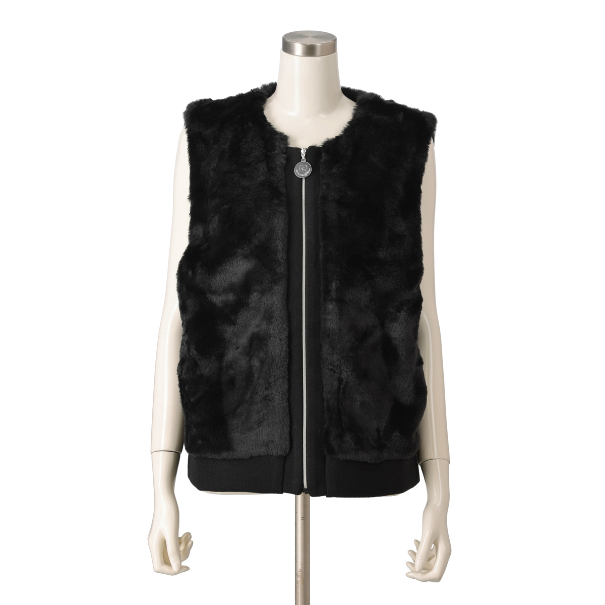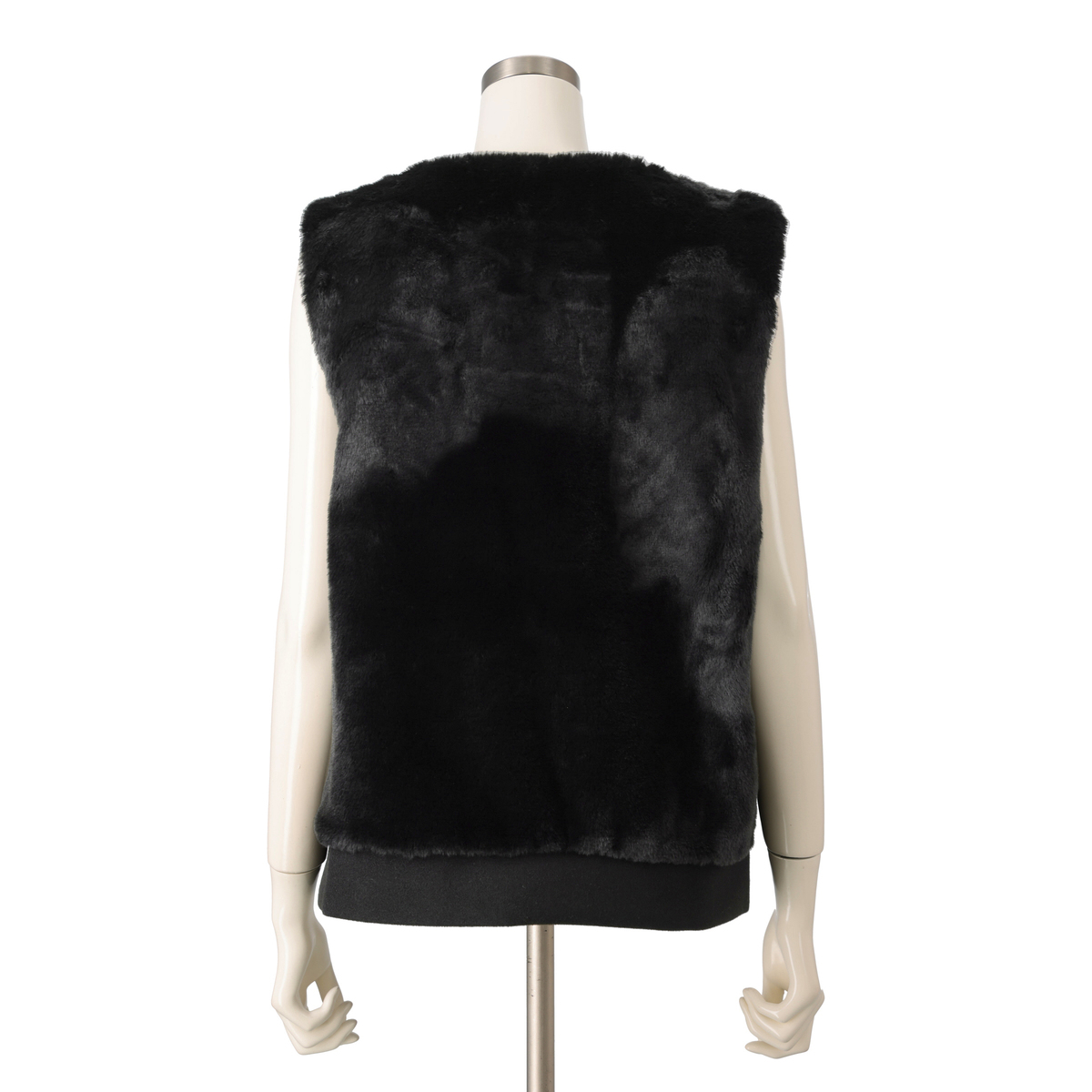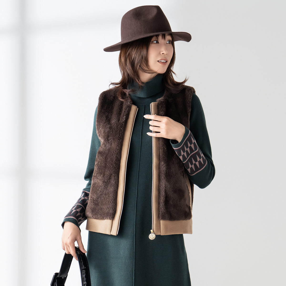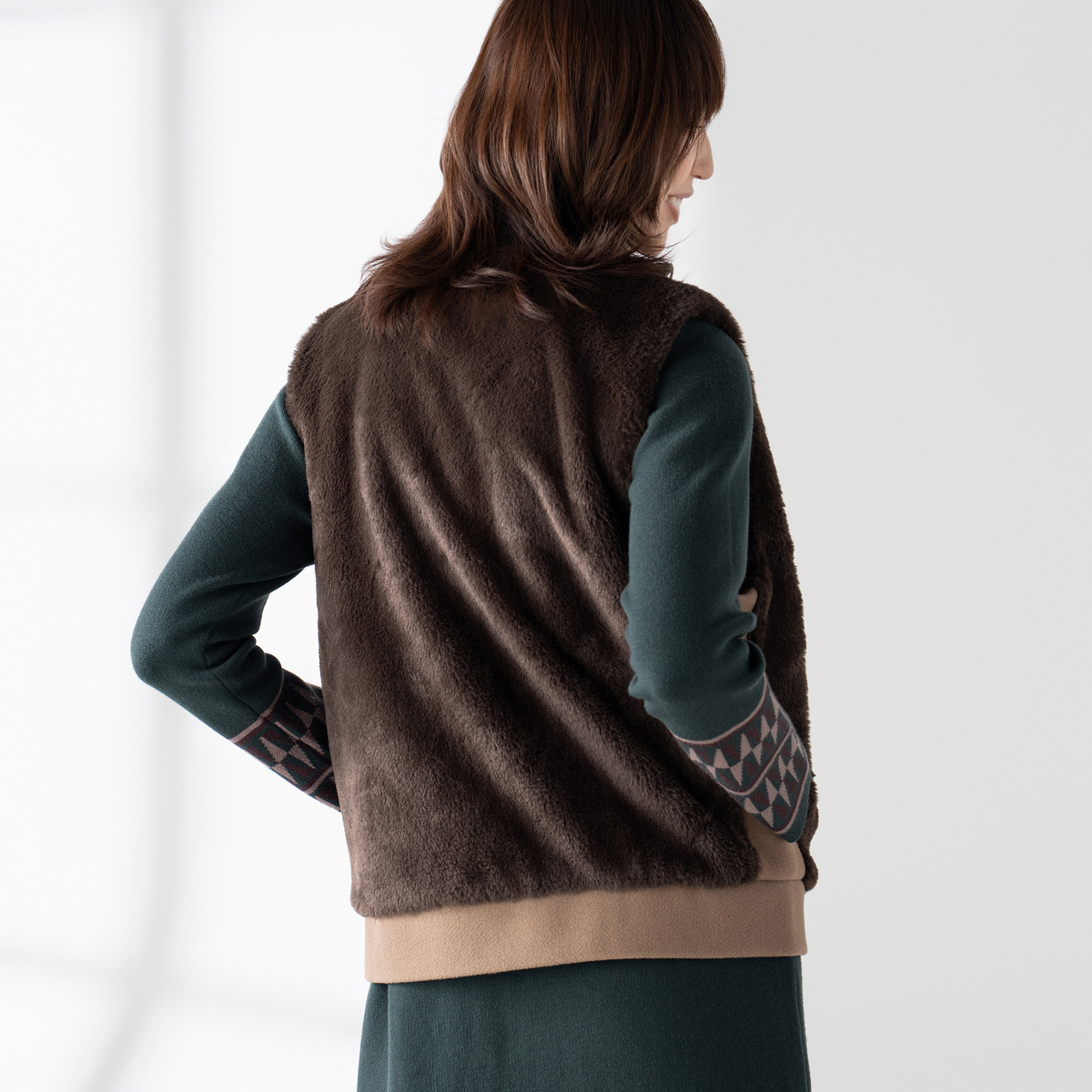 リアルファーのような艶と毛足が魅力のフェイクファーが、冬の装いを格上げ。タフタ裏地で滑りがよく、ニットの上からも快適に着脱できるジレです