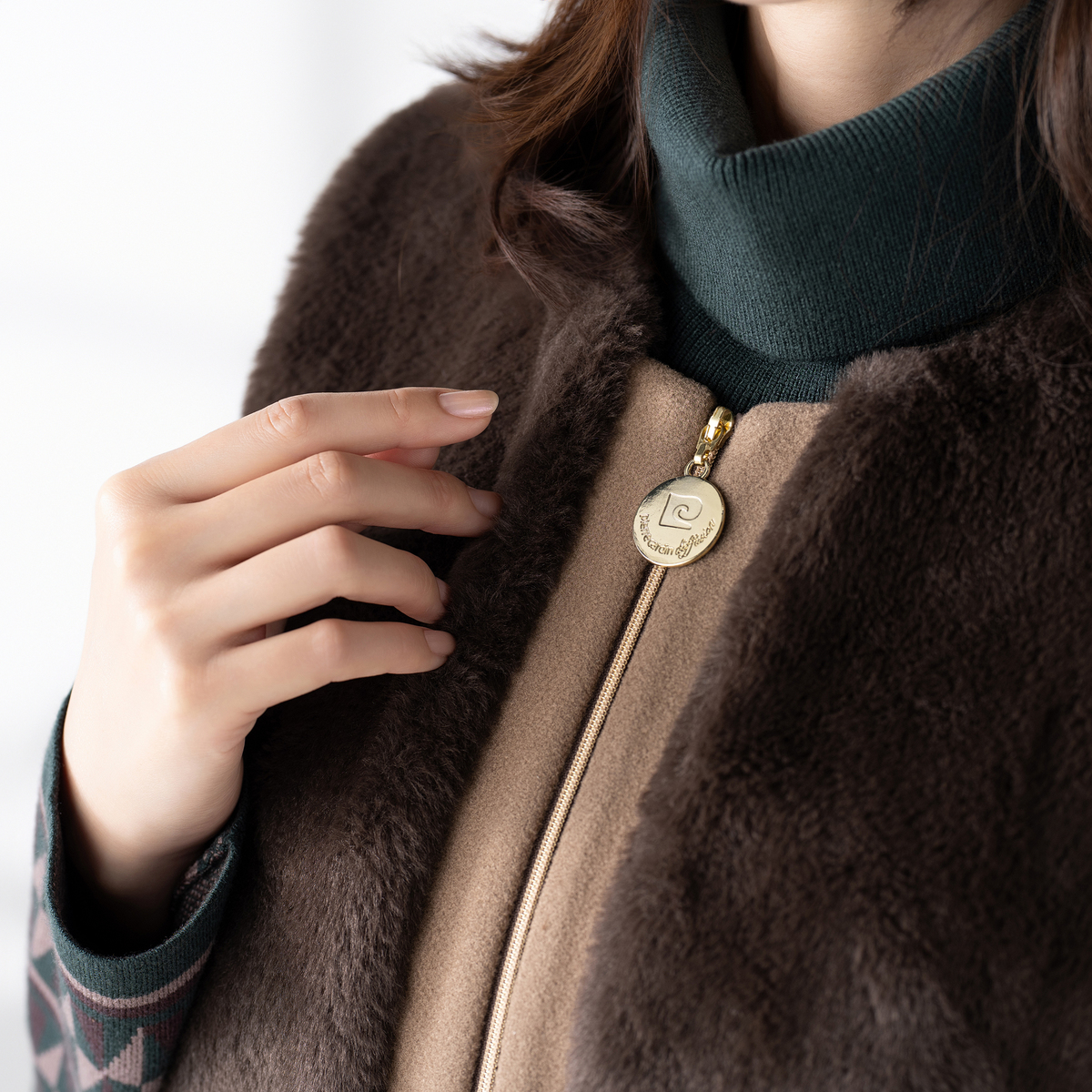 ファスナーの引き手にはブランド刻印入りチャームをあしらい、ディテールにまでこだわりました。首周りや前立ては布帛でくるみ、丁寧な仕立てが上品さを引き立てます