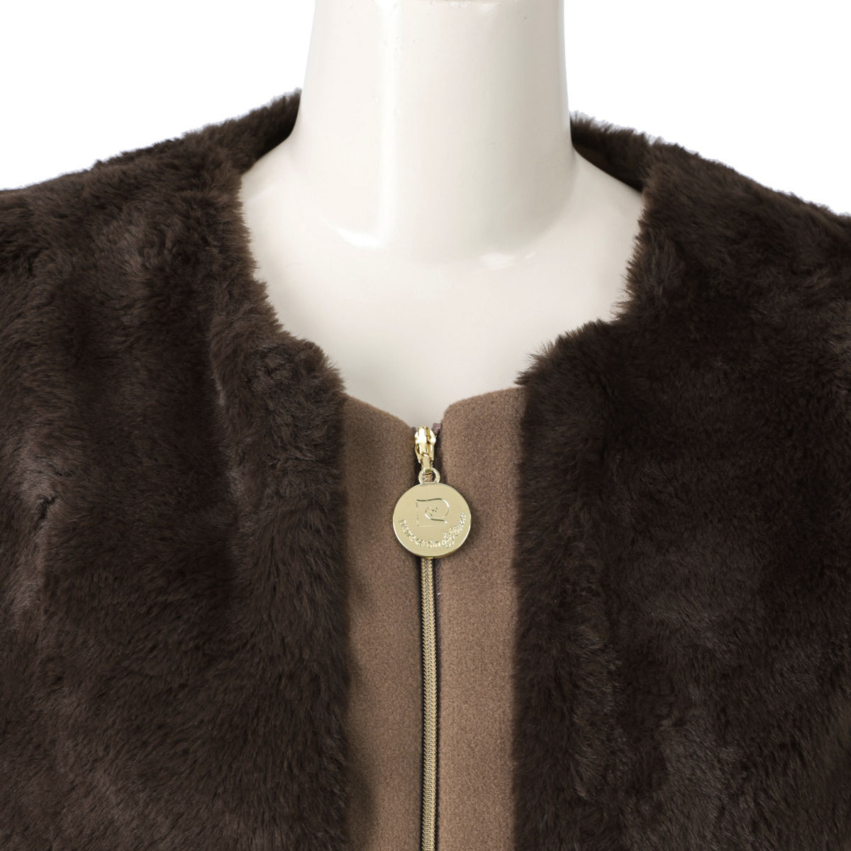 前後身頃にフェイクファー、脇や裾には布帛を使用し、デザイン性と実用性を両立。ファスナー使いで甘さを抑え、都会的で洗練された印象に。開けても閉じてもバランスよく着こなせます