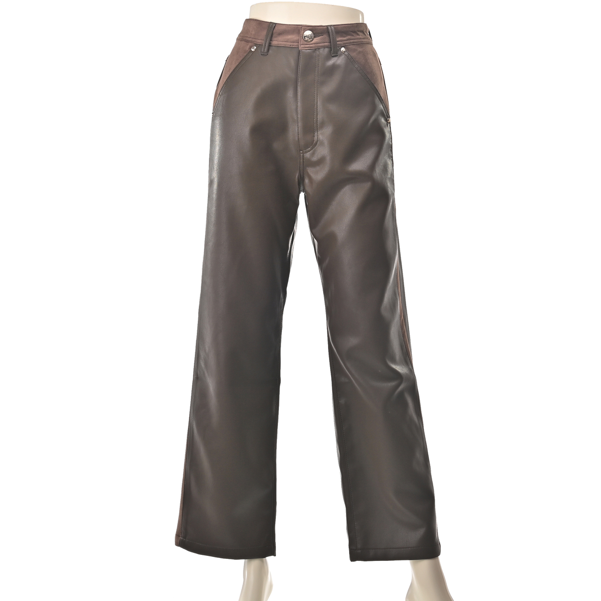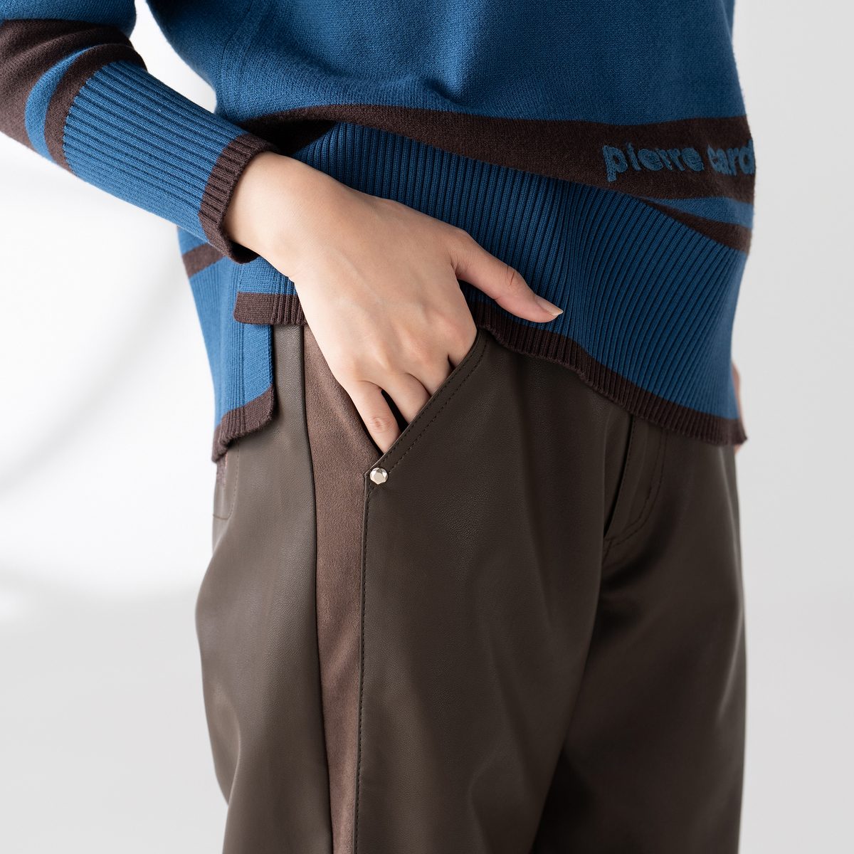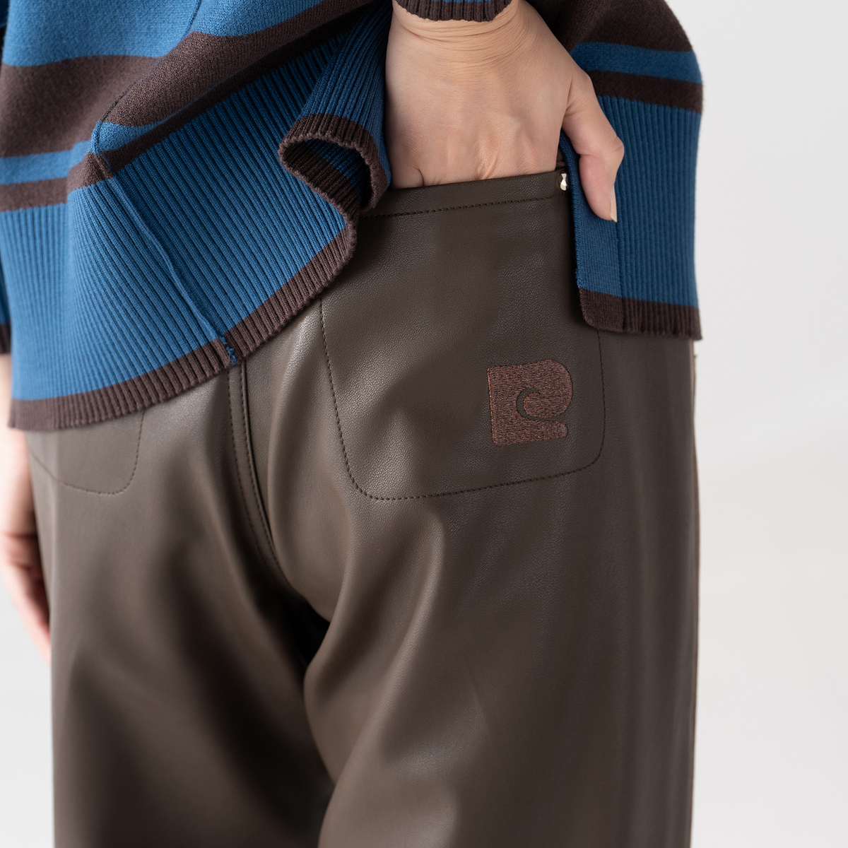リッチな表情のフェイクレザーと、柔らかく伸びるフェイクスエードを組合せたパンツ。光沢とマットのコントラストが、スタイリングに洗練された印象をプラスし、ブランド刻印入りのボタンで、細部まで高級感を演出します