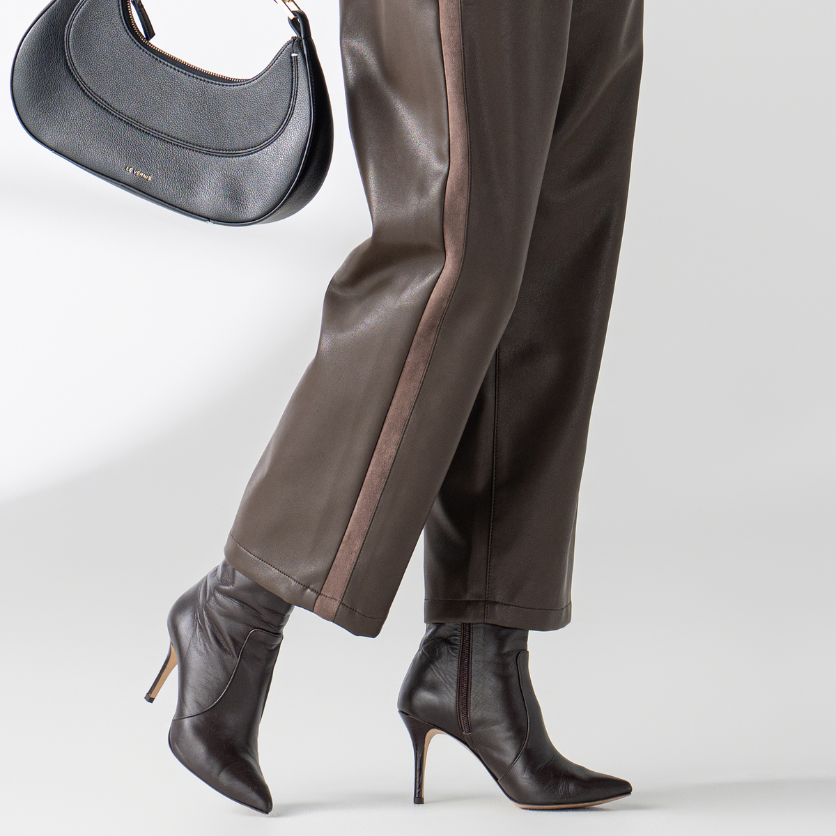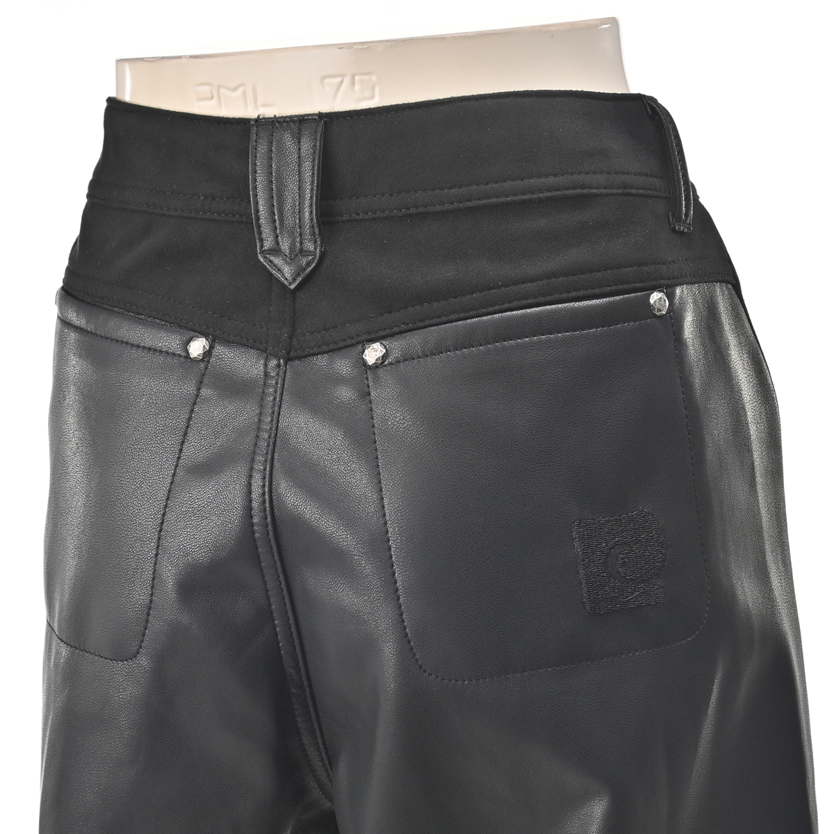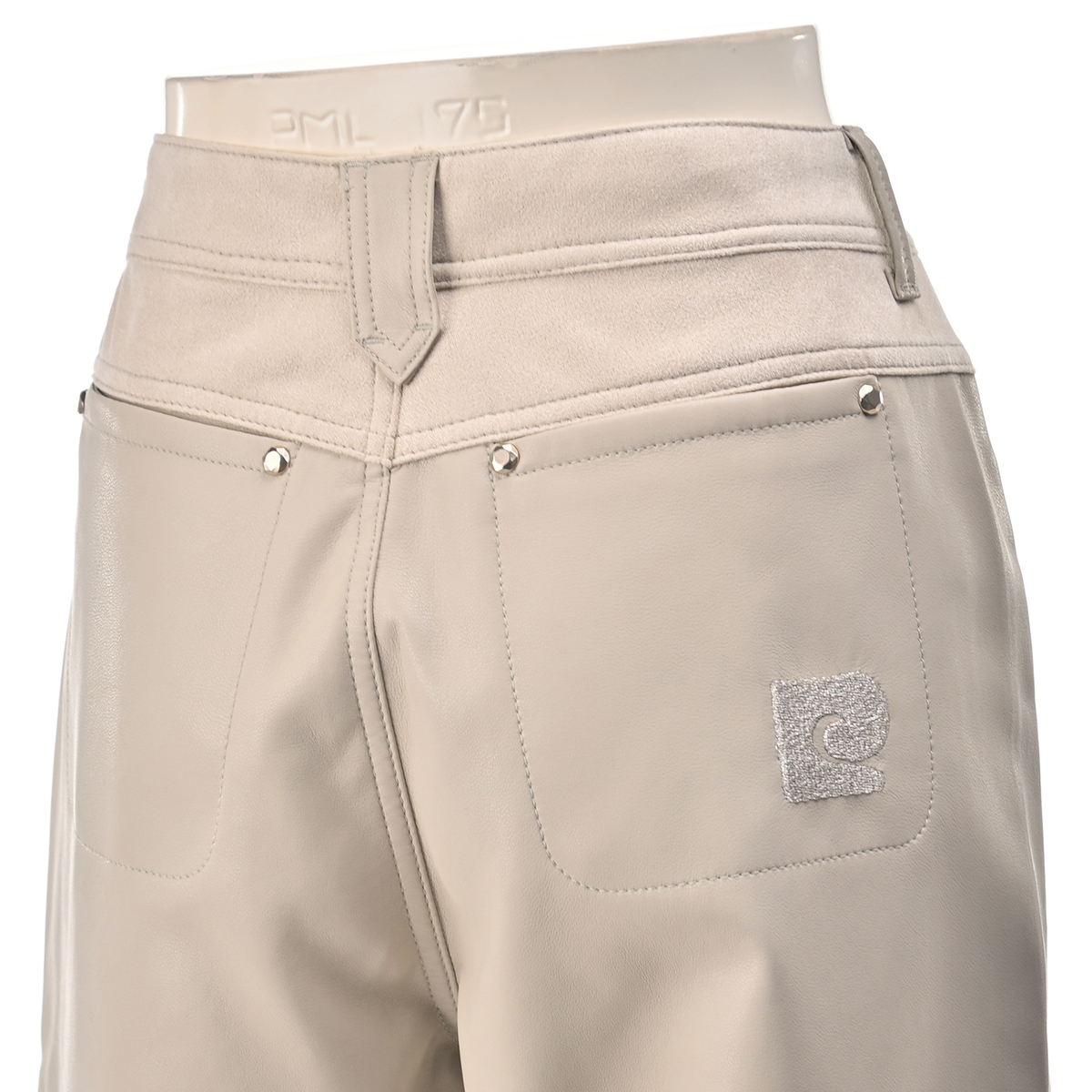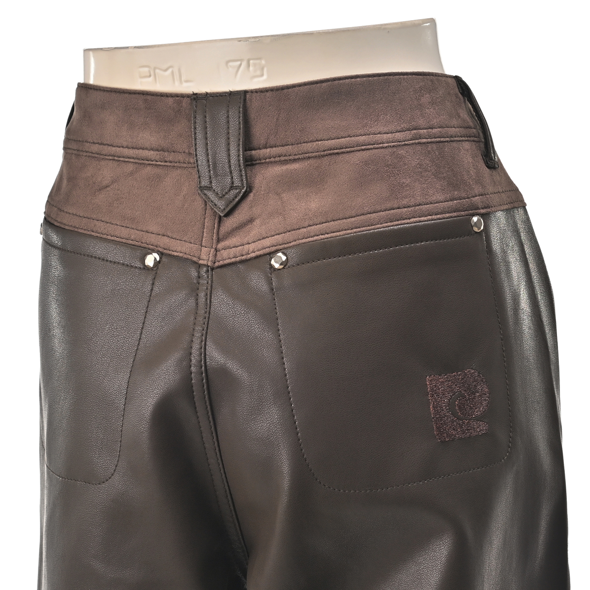 リッチな表情のフェイクレザーと、柔らかく伸びるフェイクスエードを組合せたパンツ。光沢とマットのコントラストが、スタイリングに洗練された印象をプラスし、ブランド刻印入りのボタンで、細部まで高級感を演出します