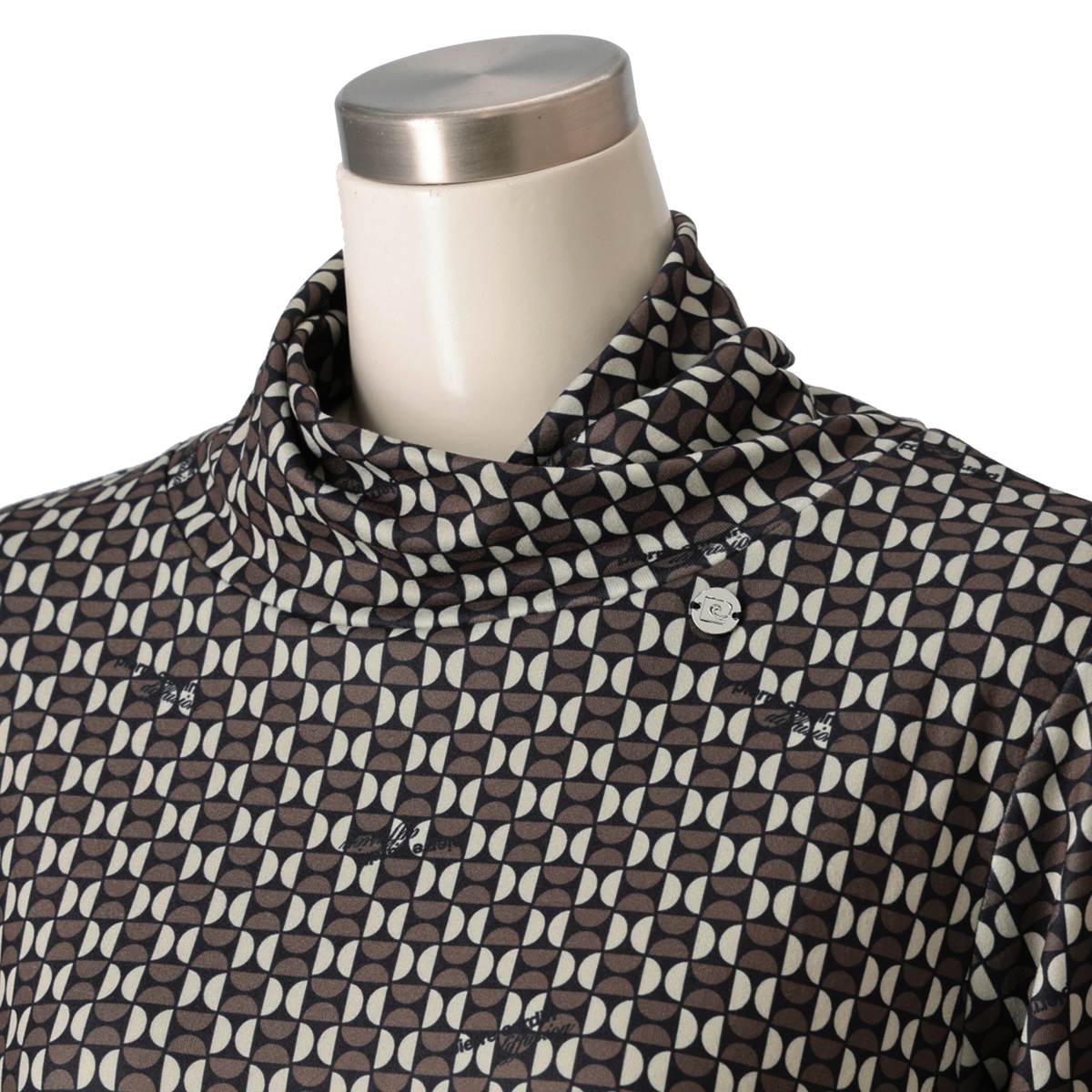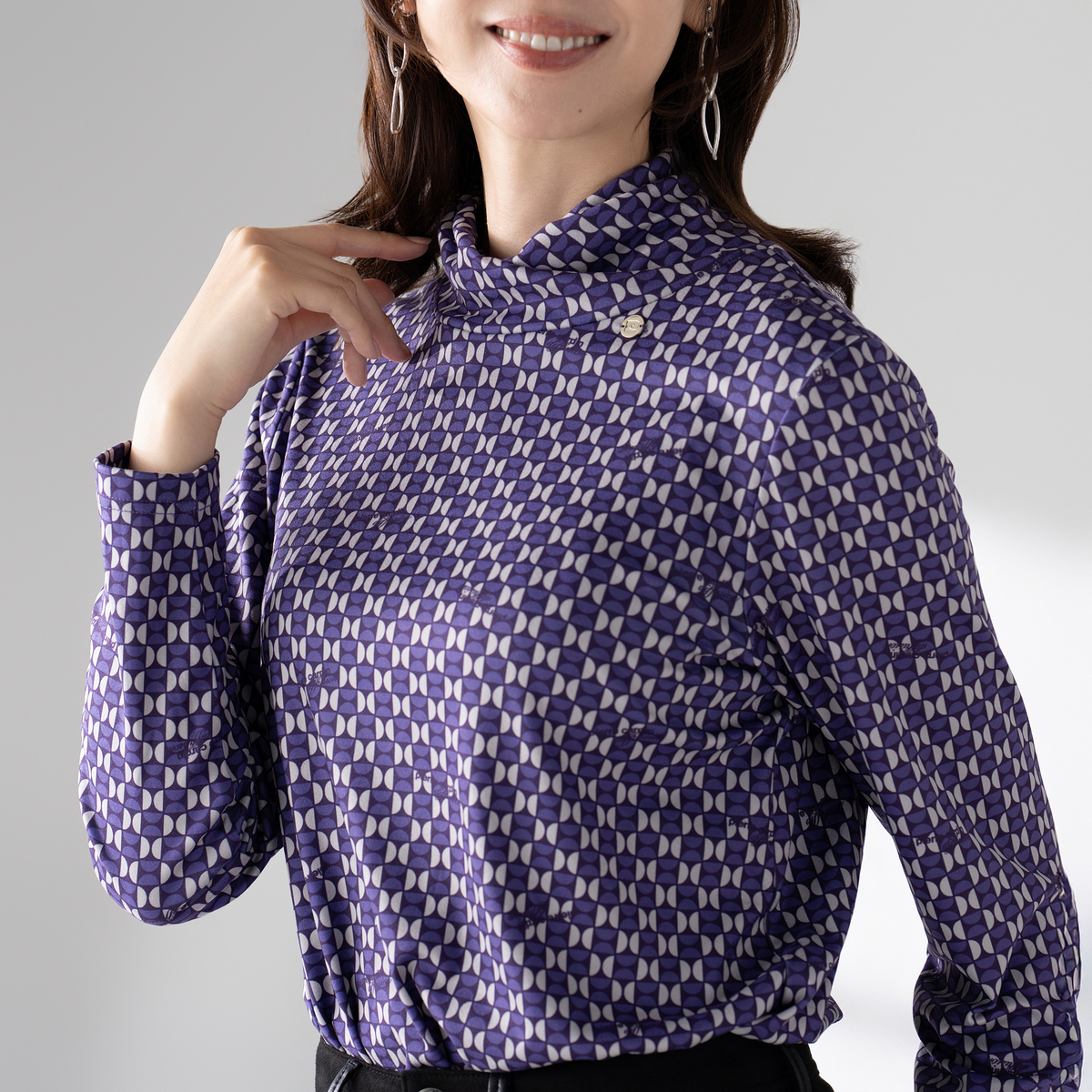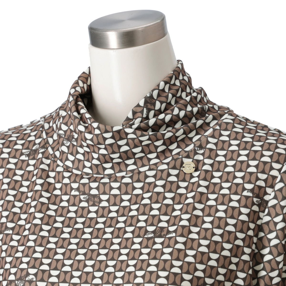 ねじり衿デザインで首元に立体感を。アクセサリーなしでも印象的なスタイルに。ブランドオリジナルの幾何学調プリントとさりげないロゴ使いで、特別感を演出します