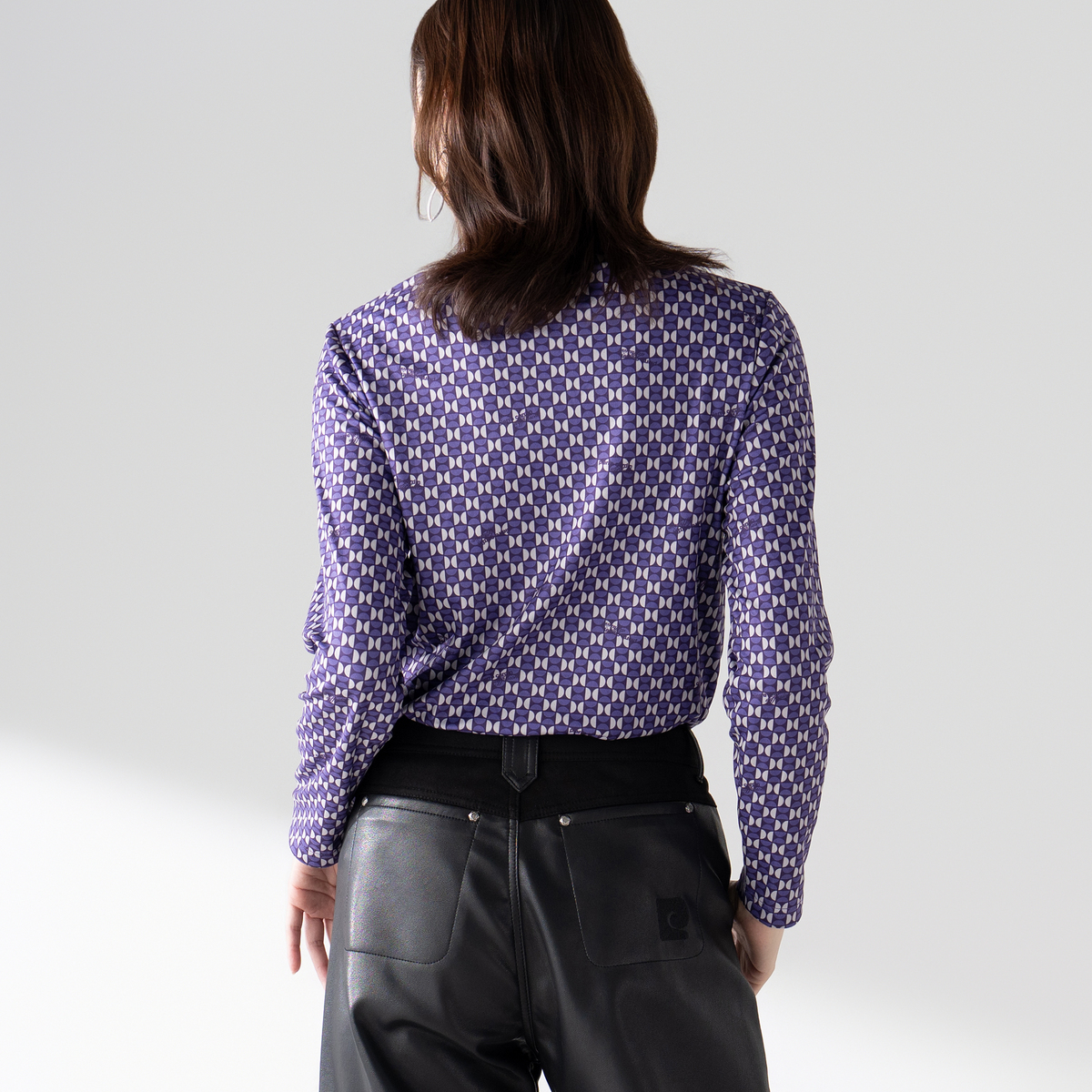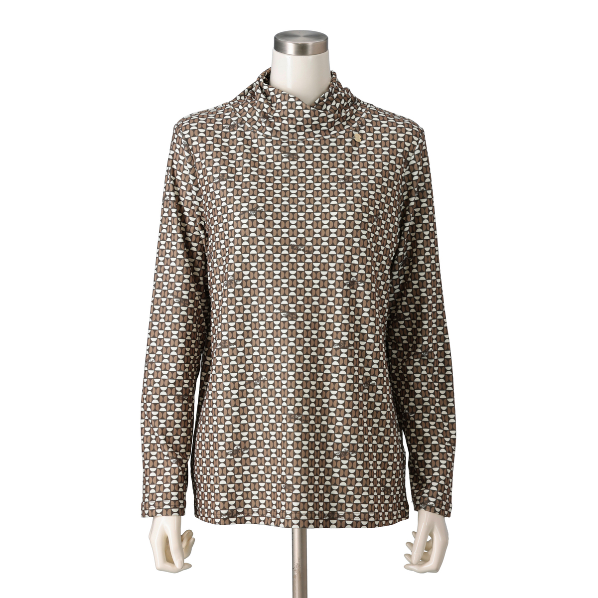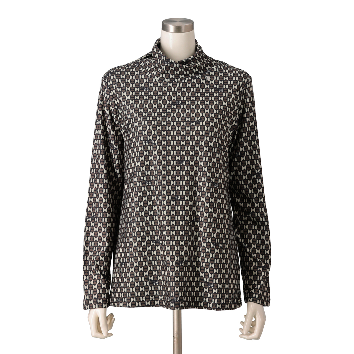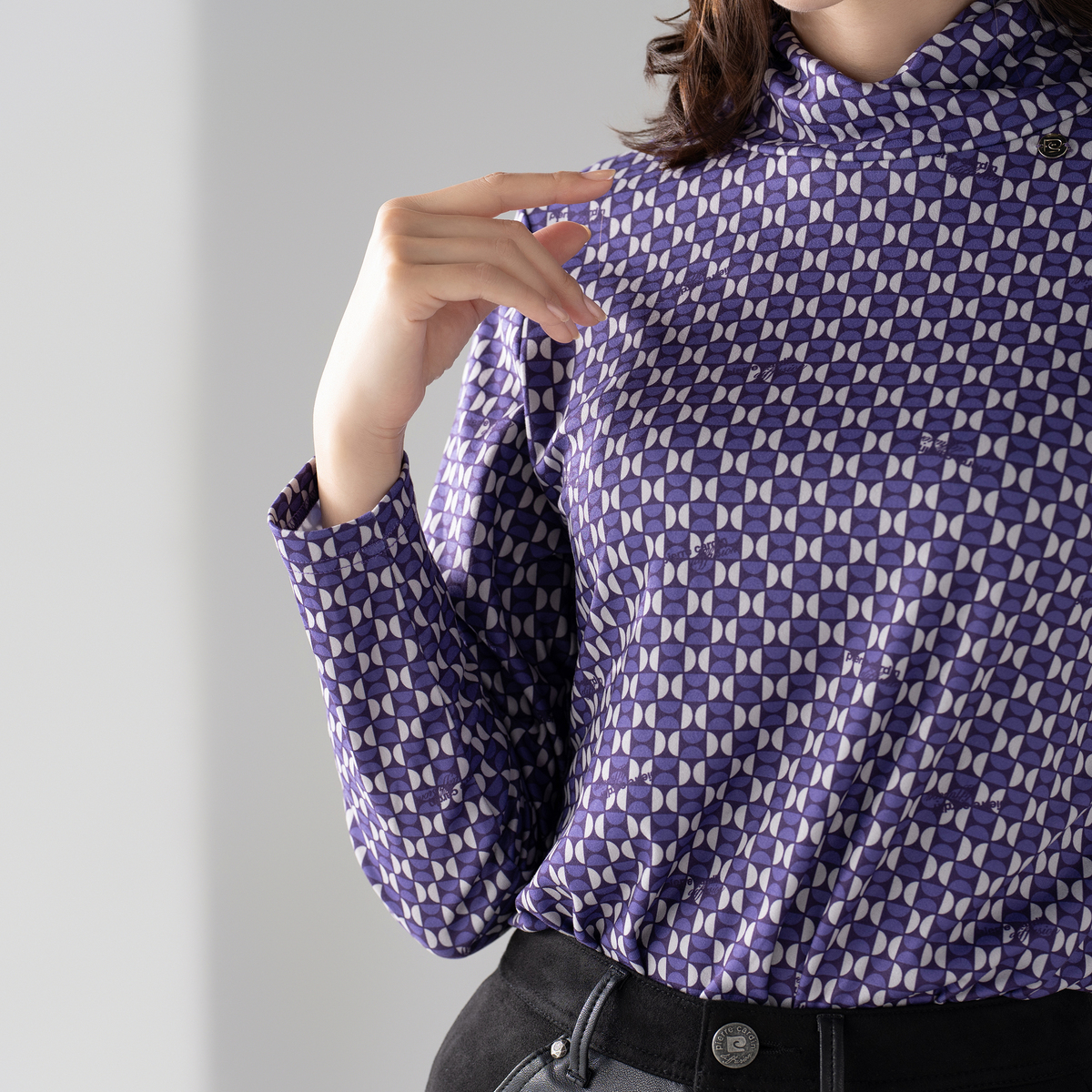 ねじり衿デザインで首元に立体感を。アクセサリーなしでも印象的なスタイルに。ブランドオリジナルの幾何学調プリントとさりげないロゴ使いで、特別感を演出します