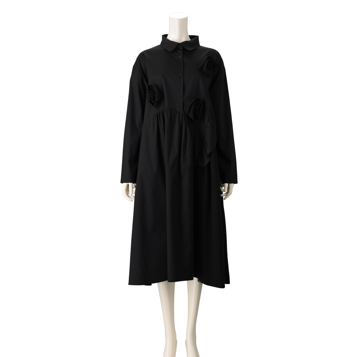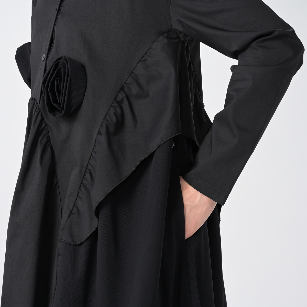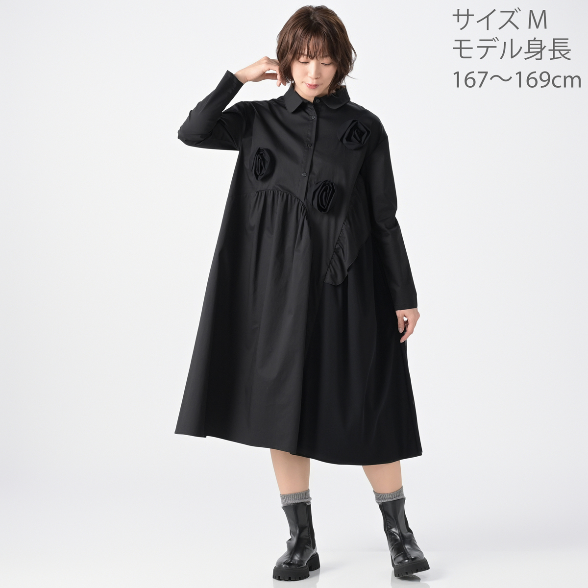 フラワー加工をあしらった、デザイン性の高いワンピース。存在感がありながら、左右脇には便利なポケット付きで、実用性も兼ね備えています