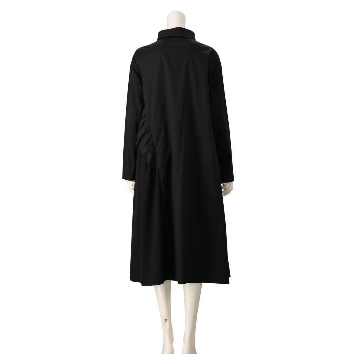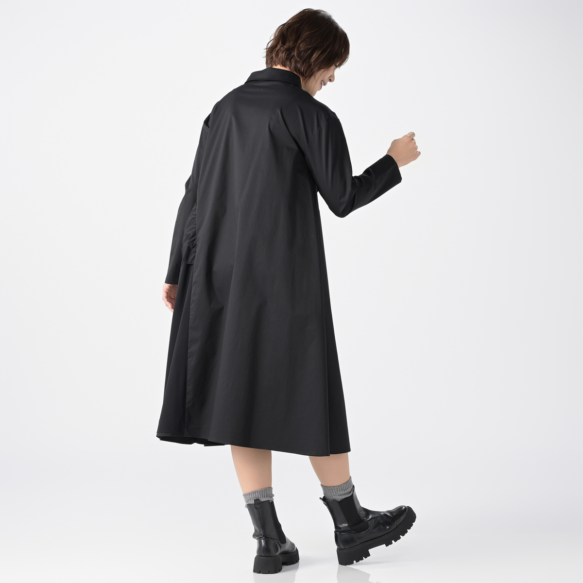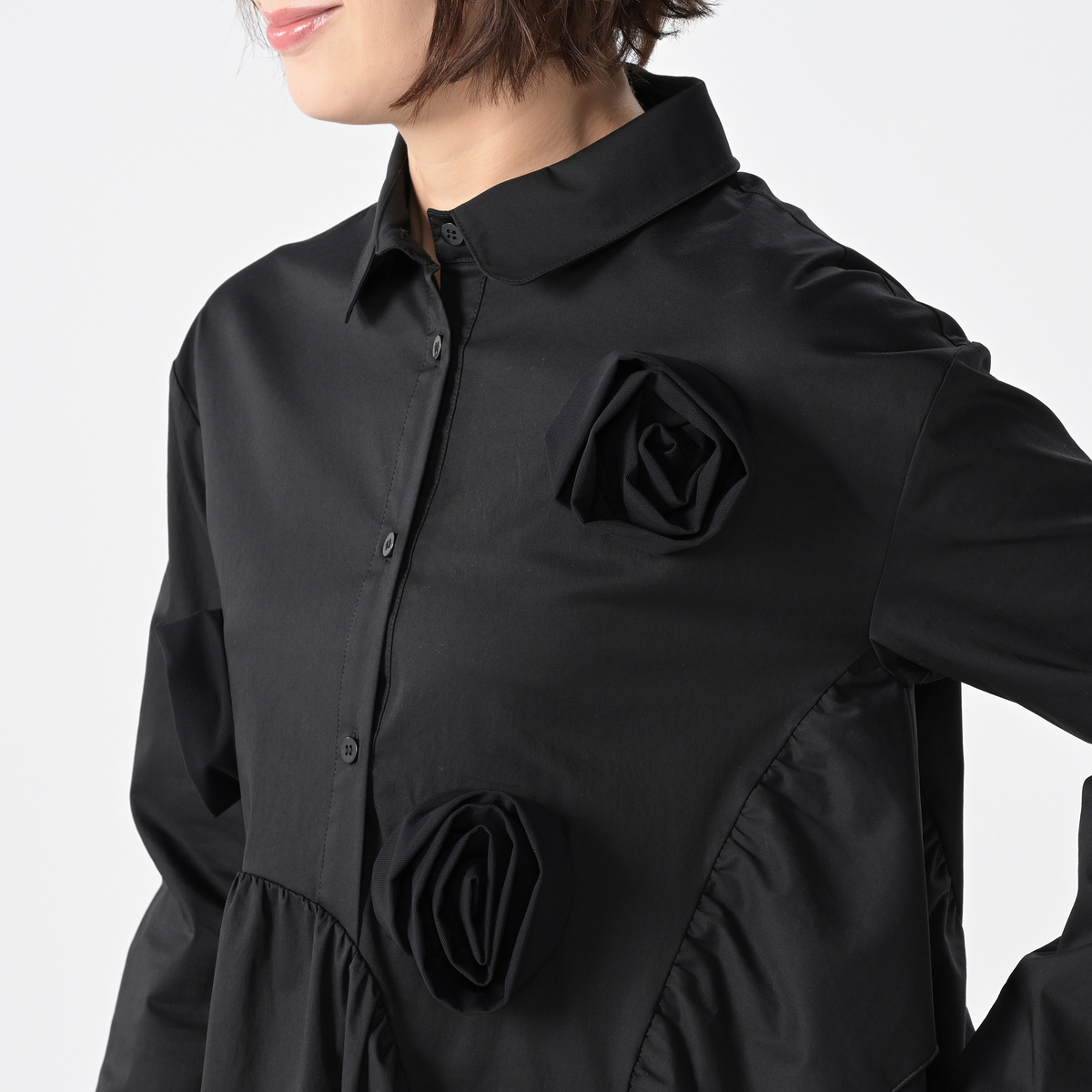 フラワー加工をあしらった、デザイン性の高いワンピース。存在感がありながら、左右脇には便利なポケット付きで、実用性も兼ね備えています