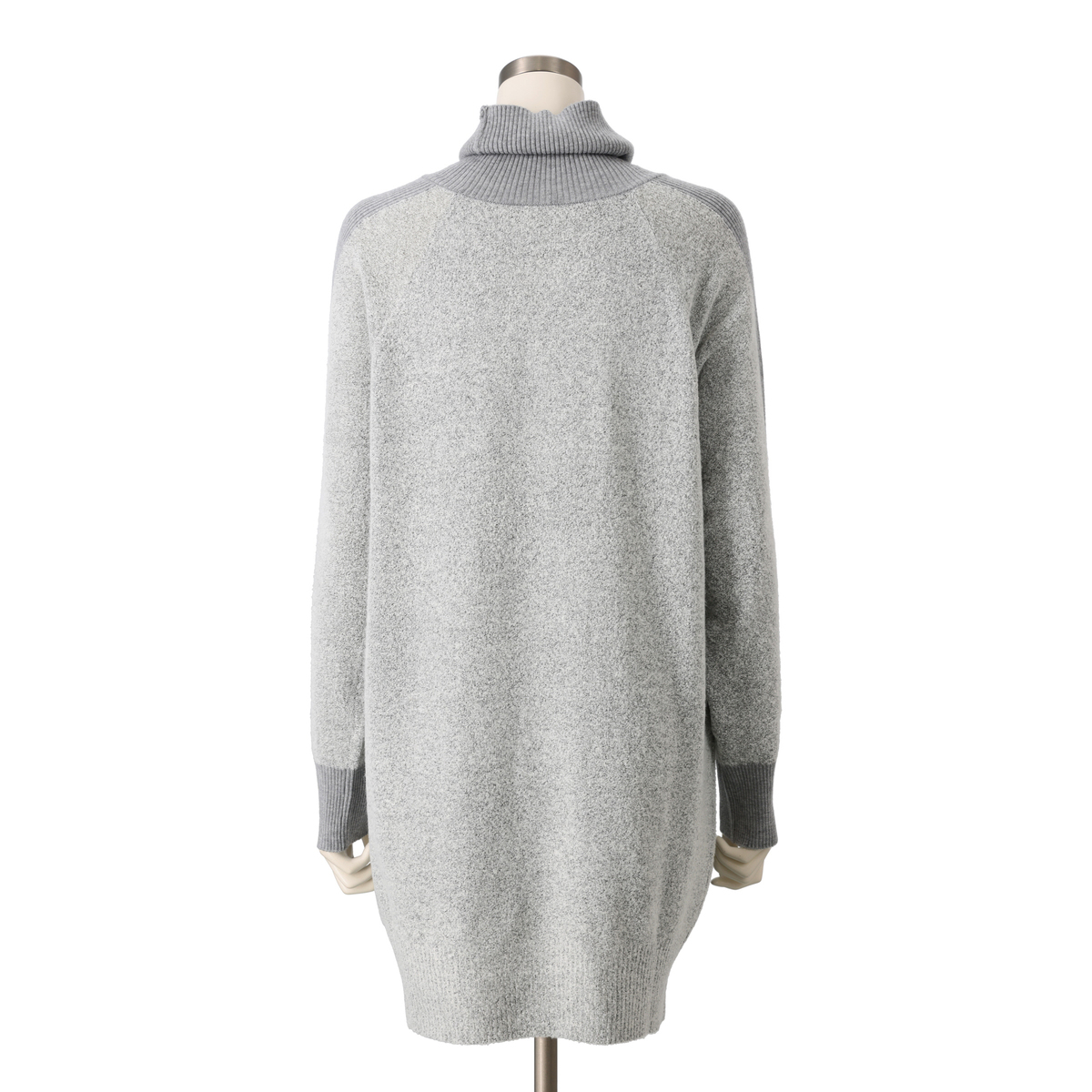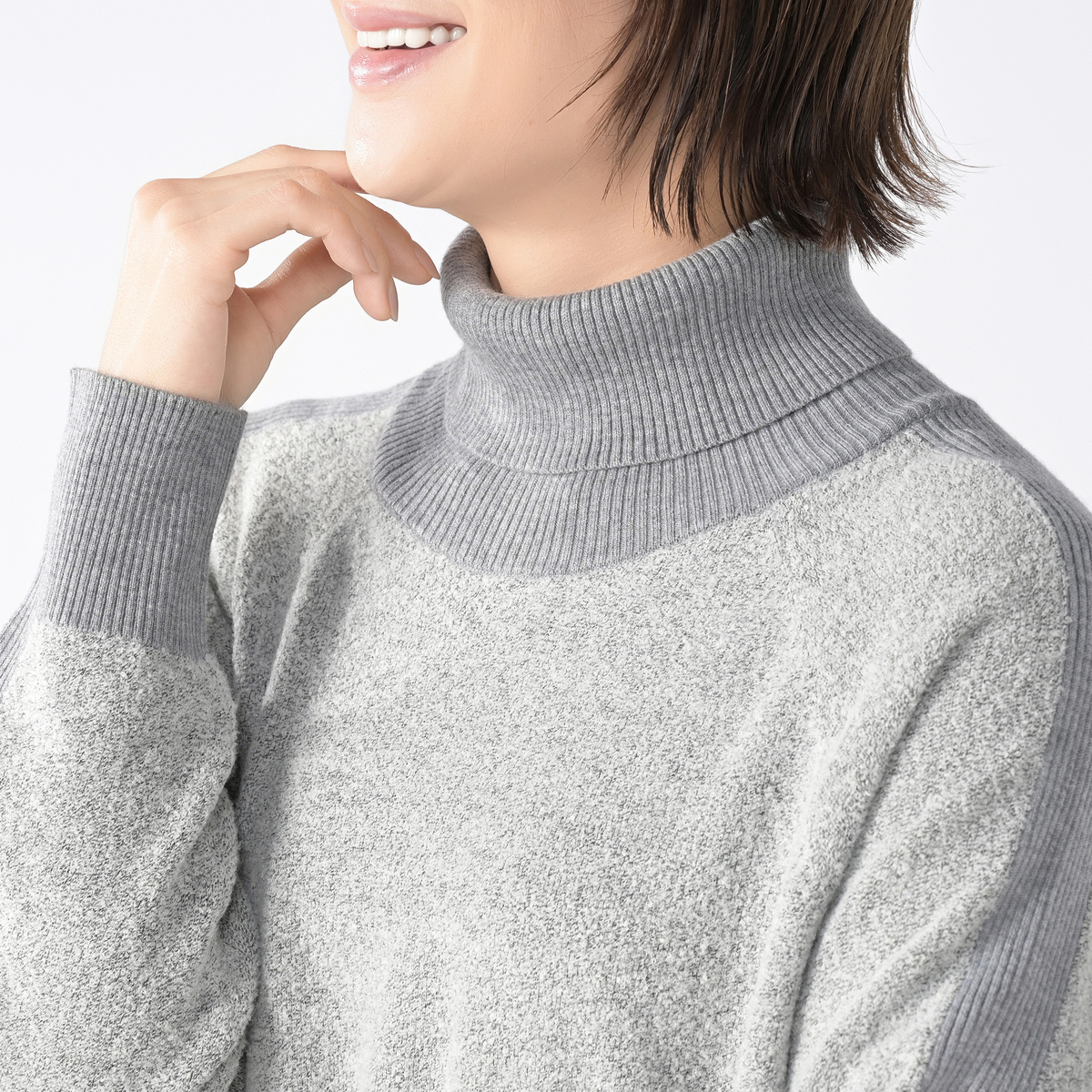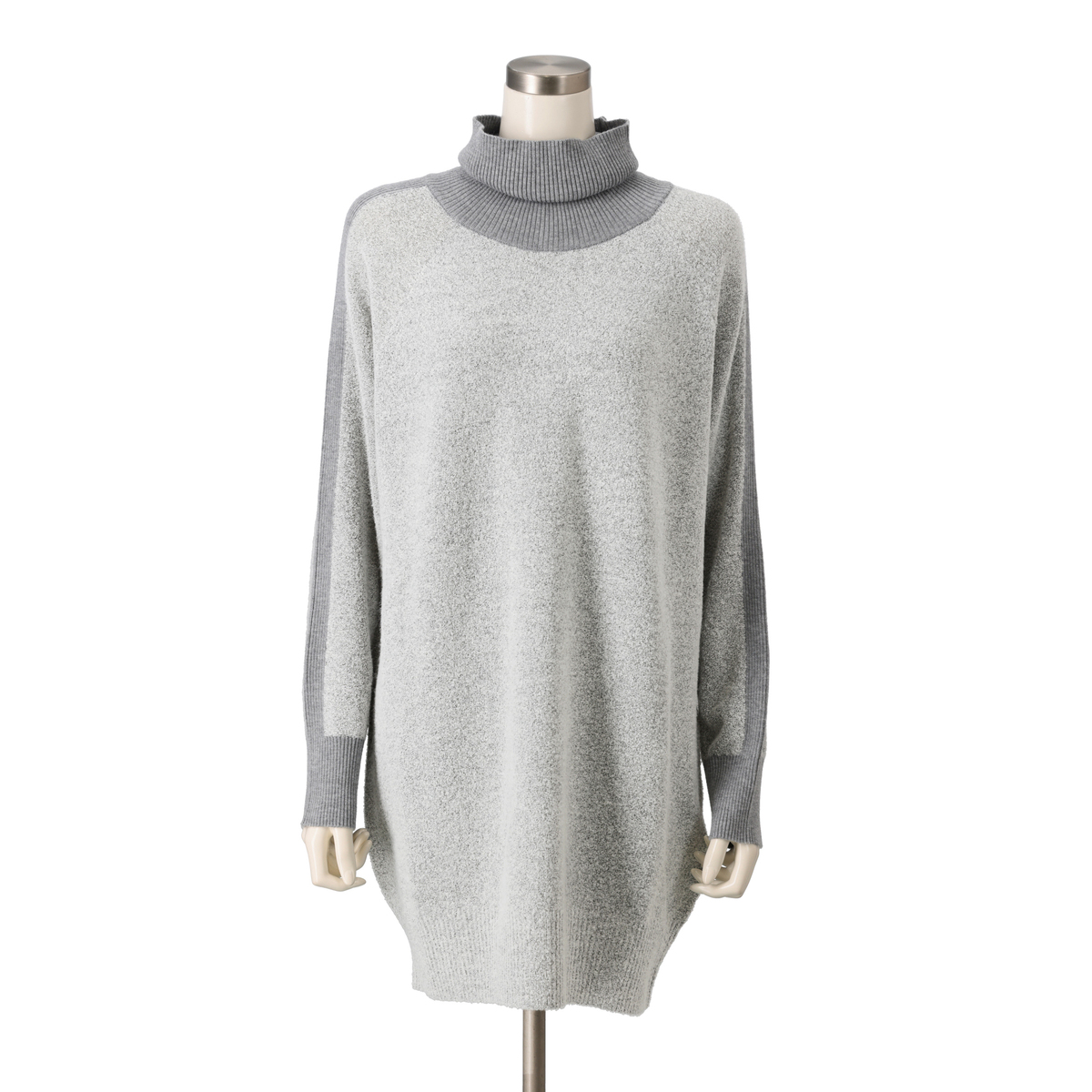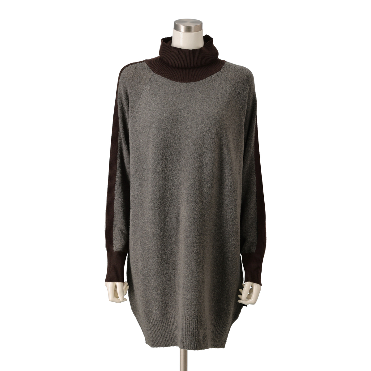 リング糸を身頃に使用し、衿と袖には梳毛使いに。異素材の組合せが生み出す、上品な表情が魅力のハイネックニットワンピースです