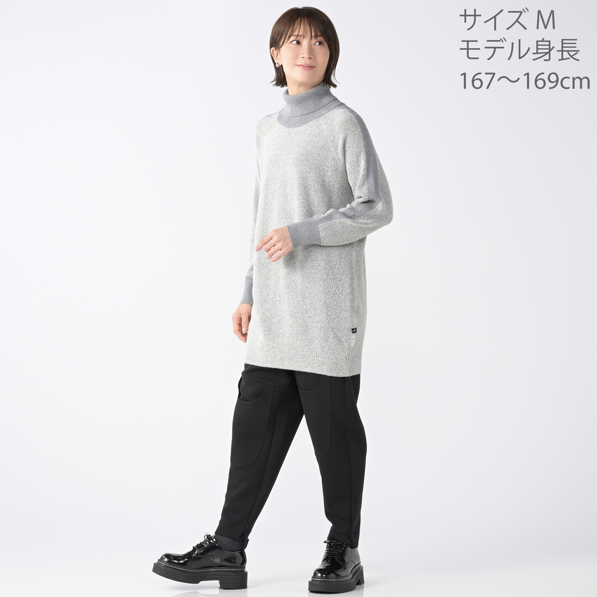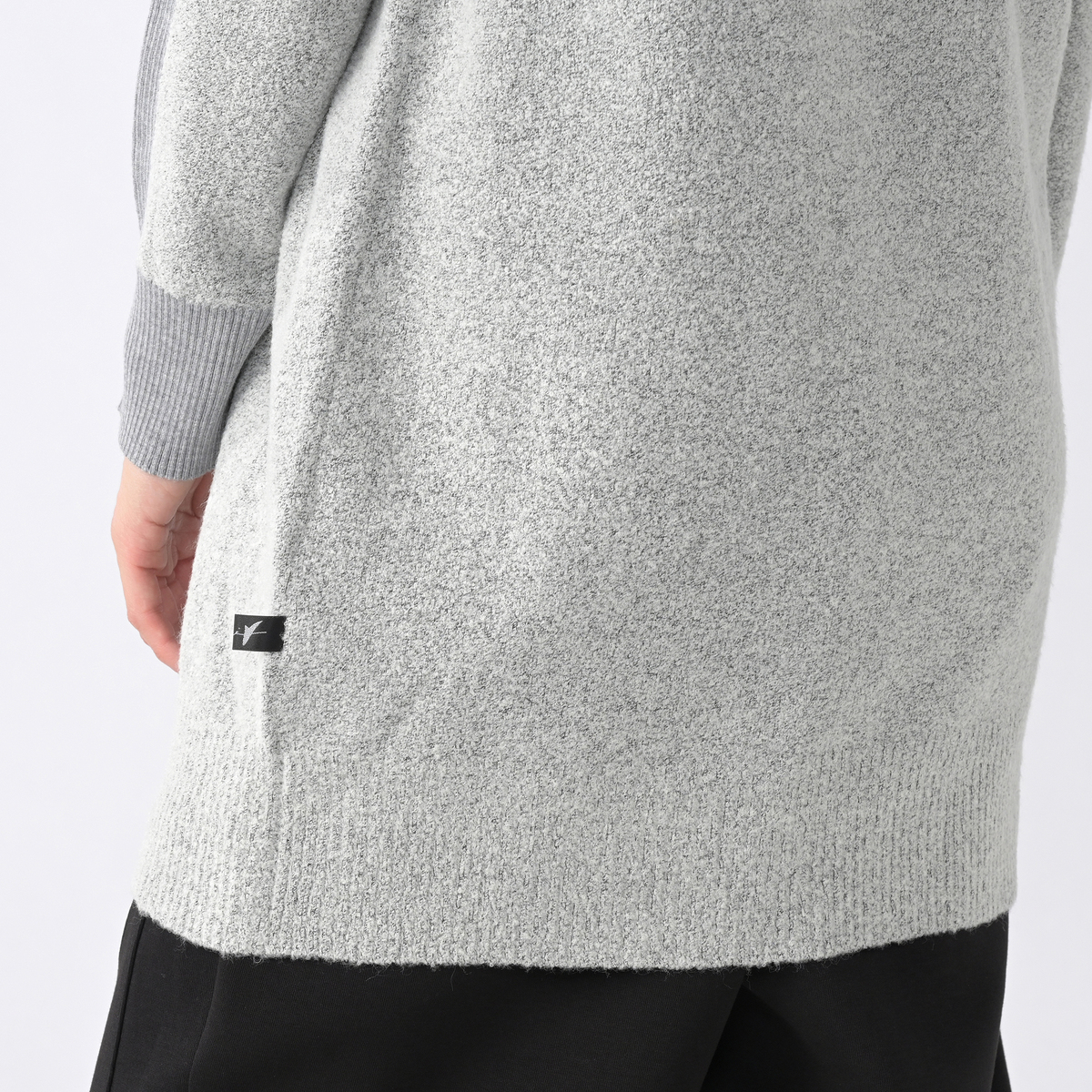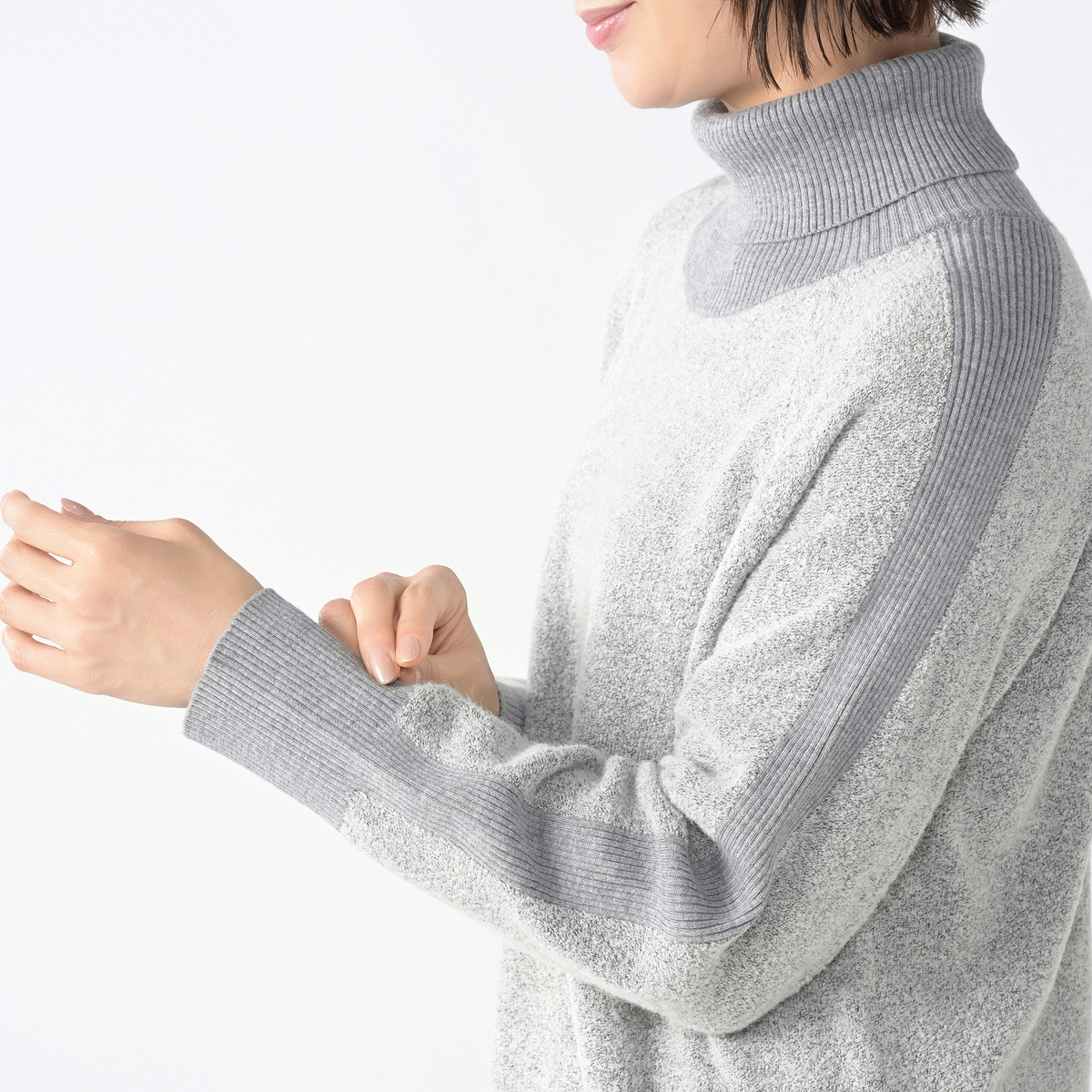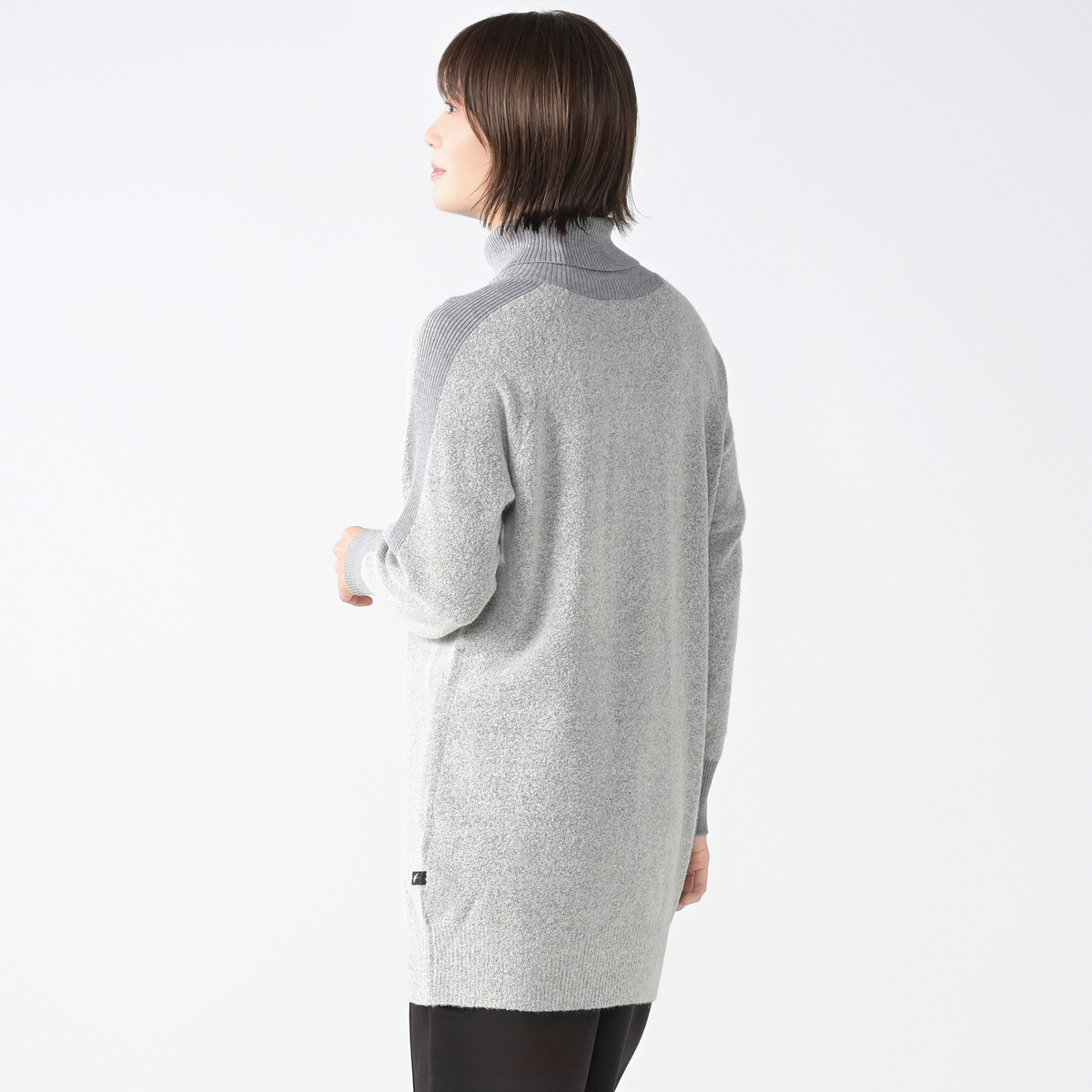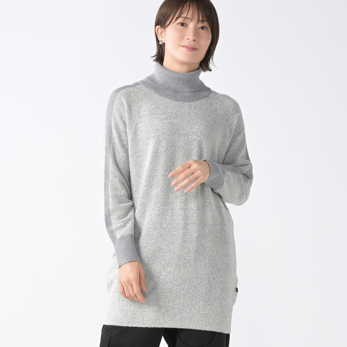 リング糸を身頃に使用し、衿と袖には梳毛使いに。異素材の組合せが生み出す、上品な表情が魅力のハイネックニットワンピースです