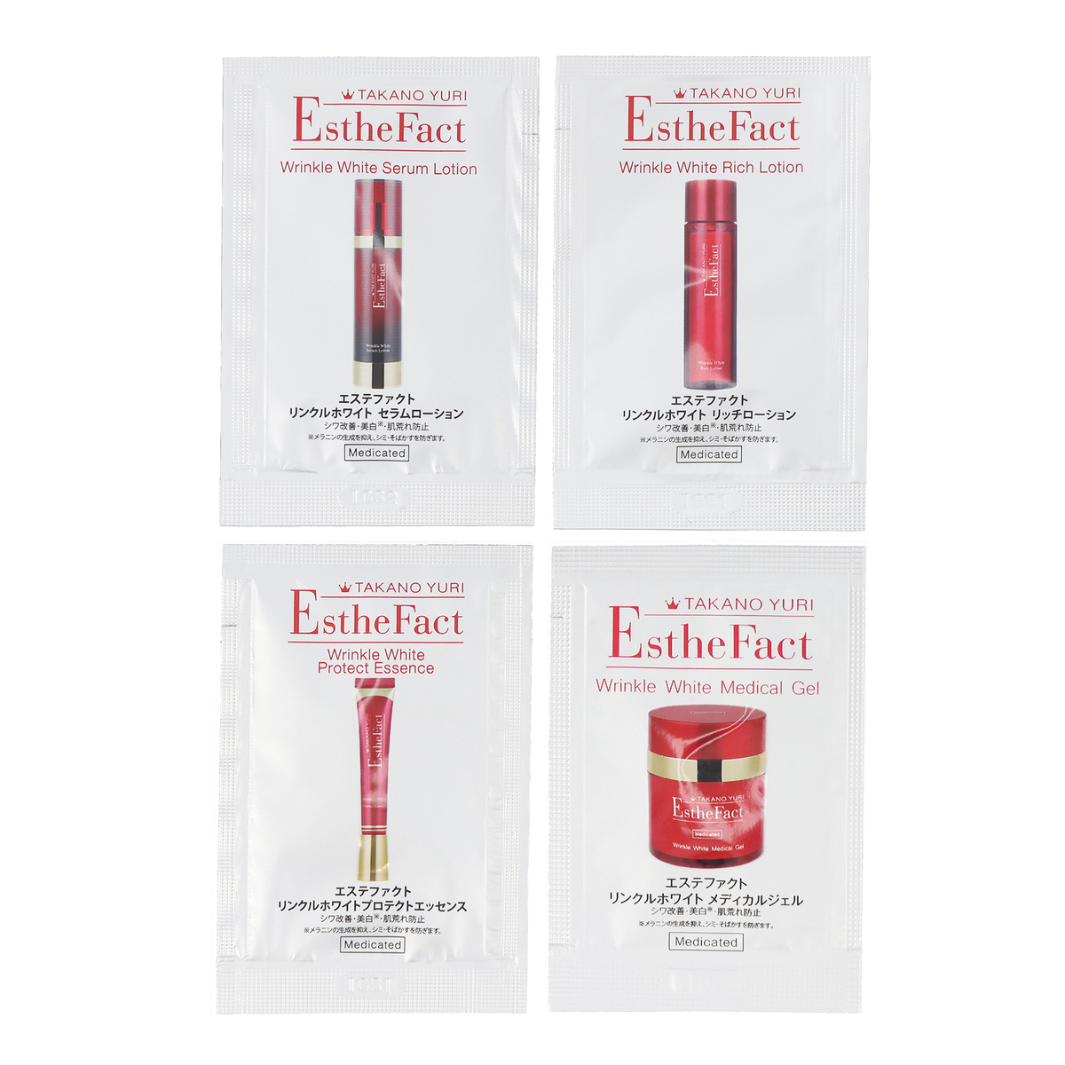 [セット内容] ・薬用N美容液na CN (医薬部外品)1.5mL ・薬用N化粧水na CN (医薬部外品)2mL ・エステファクト リンクルホワイトプロテクトエッセンス(医薬部外品) 1g ・薬用モイストジェルS(医薬部外品)2g [注意事項] ※お肌に異常が生じていないかよく注意してご使用ください ※使用中、赤味、はれ、かゆみ、刺激、色抜け(白斑等)や黒ずみ等の異常があらわれた場合は、ご使用をおやめください ※乳幼児の手の届かないところに保管してください ※極端に高温、または低温の場所、直射日光のあたる場所には保管しないでください ■医薬部外品 <エステファクト リンクルホワイトセラムローション> シワを改善する。メラニンの生成を抑え、しみ、そばかすを防ぐ。肌あれ。あれ性。あせも・しもやけ・ひび・あかぎれ・にきびを防ぐ。油性肌。かみそりまけを防ぐ。日やけ・雪やけ後のほてりを防ぐ。肌をひきしめる。肌を清浄にする。肌を整える。皮膚をすこやかに保つ。皮膚にうるおいを与える <エステファクト リンクルホワイトリッチローション> シワを改善する。メラニンの生成を抑え、しみ、そばかすを防ぐ。肌あれ。あれ性。あせも・しもやけ・ひび・あかぎれ・にきびを防ぐ。油性肌。かみそりまけを防ぐ。日やけ・雪やけ後のほてりを防ぐ。肌をひきしめる。肌を清浄にする。肌を整える。皮膚をすこやかに保つ。皮膚にうるおいを与える <エステファクト リンクルホワイトプロテクトエッセンス> シワを改善する。メラニンの生成を抑え、しみ、そばかすを防ぐ。肌あれ。あれ性。あせも・しもやけ・ひび・あかぎれ・にきびを防ぐ。油性肌。かみそりまけを防ぐ。日やけ・雪やけ後のほてりを防ぐ。肌をひきしめる。肌を清浄にする。肌を整える。皮膚をすこやかに保つ。皮膚にうるおいを与える。皮膚を保護する。皮膚の乾燥を防ぐ <エステファクト リンクルホワイトメディカルジェル> 肌あれ・あれ性。油性肌。日やけ・雪やけ後のほてりを防ぐ。あせも・しもやけ・ひび・あかぎれ・にきびを防ぐ。かみそりまけを防ぐ。メラニンの生成を抑え、しみ、そばかすを防ぐ。皮膚にうるおいを与える。皮膚をすこやかに保つ。シワを改善する。肌をひきしめる。肌を整える。肌を清浄にする 【日本製】 [成分] エステファクト リンクルホワイトセラムローション: <有効成分>ナイアシンアミド、グリチルリチン酸ジカリウム <その他の成分> 環状リゾホスファチジン酸ナトリウム、ヒアルロン酸ナトリウム(2)、水溶性コラーゲン液(魚起源)、エクトイン、酵母エキス(1)、ハス種子乳酸菌発酵液、ハトムギ発酵液、セイヨウナシ果汁発酵液、L-アスパラギン酸マグネシウム、グルコン酸亜鉛、グルコン酸銅、水素添加大豆リン脂質、濃グリセリン、1,2-ペンタンジオール、他 エステファクト リンクルホワイトリッチローション: <有効成分>ナイアシンアミド、グリチルリチン酸ジカリウム <その他の成分>環状リゾホスファチジン酸ナトリウム、ヒアルロン酸ナトリウム(2)、エクトイン、水溶性コラーゲン液(魚起源)、酵母エキス(1)、ハトムギ発酵液、L-アスパラギン酸マグネシウム、グルコン酸亜鉛、グルコン酸銅、クエン酸、他 エステファクト リンクルホワイトプロテクトエッセンス: 有効成分:ナイアシンアミド、グリチルリチン酸ジカリウム その他の成分:海藻エキス(1)、エクトイン、アルテミアエキス、グルコシルヘスペリジン、ジメチルシラノール・ヒアルロン酸縮合液、プラセンタエキス発酵液、プルーン酵素分解物、水溶性コラーゲン液(魚起源)、マカデミアナッツ油、マリンエラスチン、シアノコバラミン、オウバクエキス、ヒナギク花エキス、他 エステファクト リンクルホワイトメディカルジェル: 有効成分:ナイアシンアミド、グリチルリチン酸2K その他の成分:ヒマワリ新芽エキス、豆乳発酵液、水溶性ツボクサエキス、ヒメフウロエキス、ニーム葉エキス、サクラ葉抽出液、キウイエキス、グレープフルーツエキス、コメヌカスフィンゴ糖脂質、セラミド2、ステアロイルフィトスフィンゴシン、ヒドロキシステアリルフィトスフィンゴシン、アルギニン、アスパラギン酸、グリシン、 アラニン、セリン、L-バリン、プロリン、スレオニン、L-イソロイシン、ヒスチジン、L-フェニルアラニン、シュガースクワラン、トレハロース、ジメチルシラノール・ヒアルロン酸縮合液、ビタミンC・2-グルコシド、ビタミンCテトライソパルミテート、他