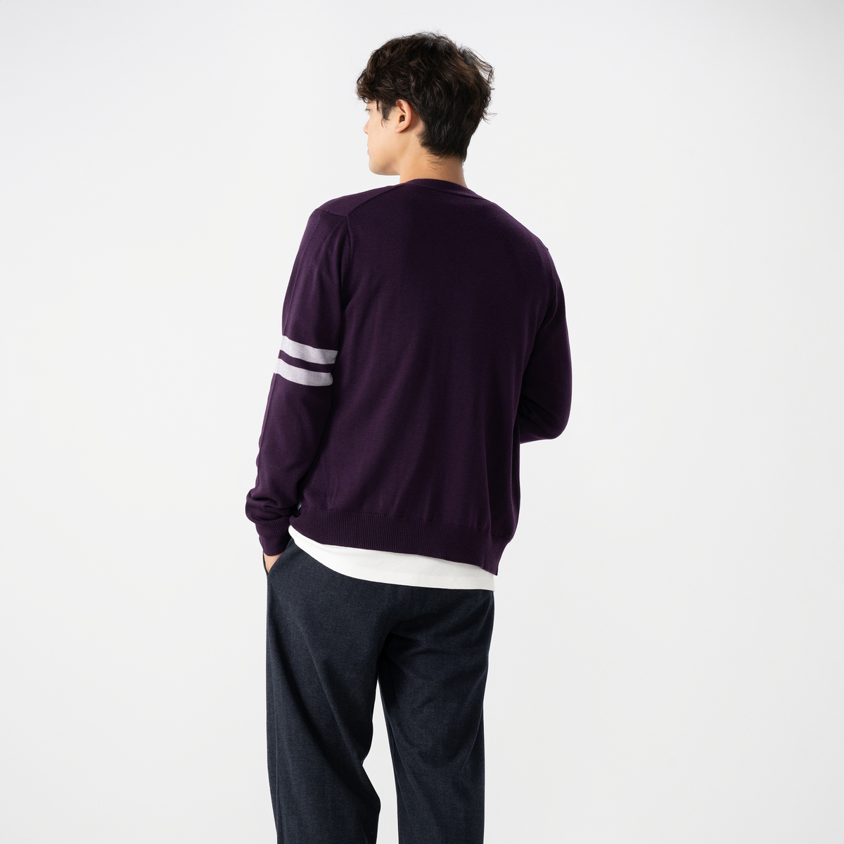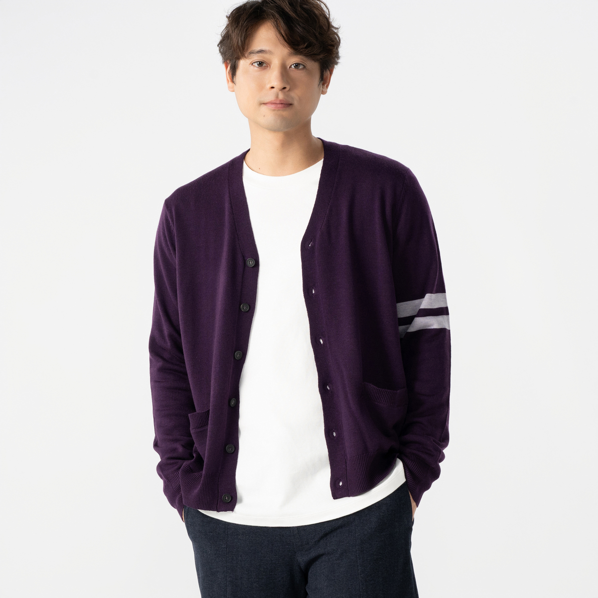 洗練されたデザインのVネックカーディガン。カジュアルからきれいめまで様々なコーデに活躍してくれます