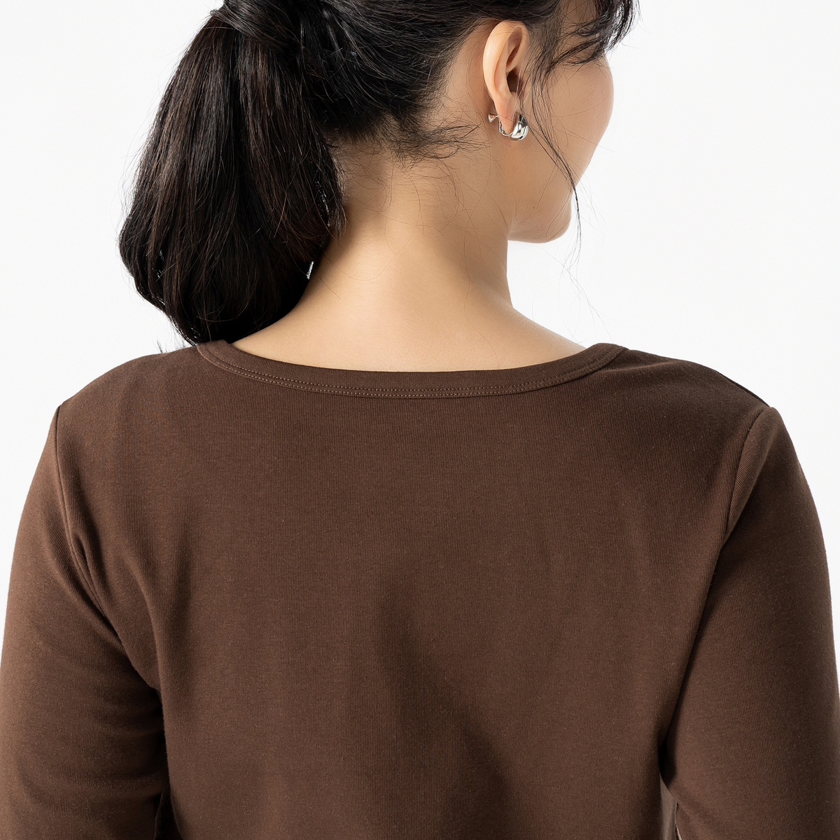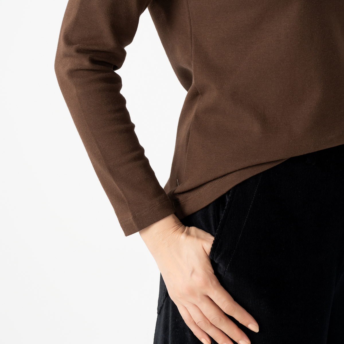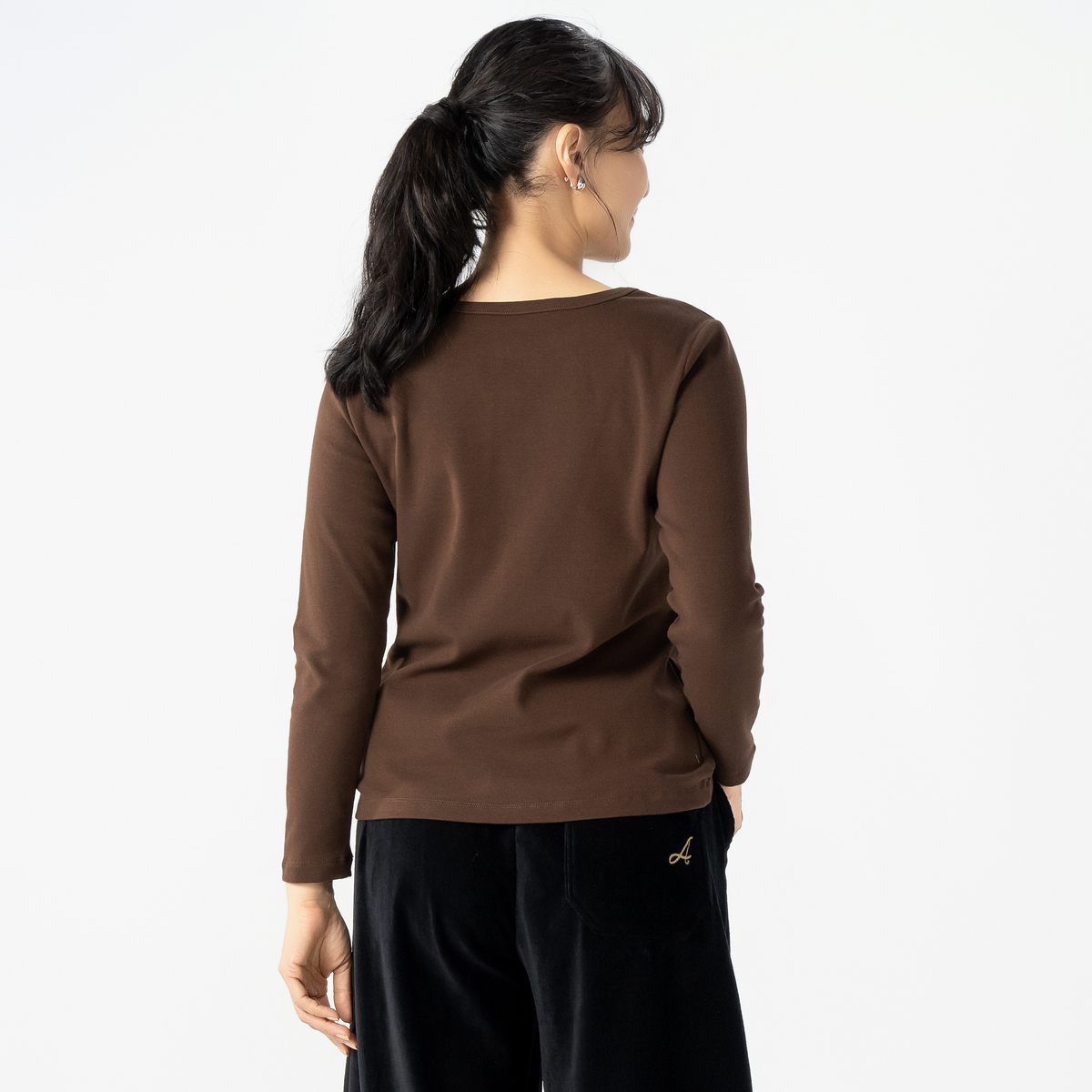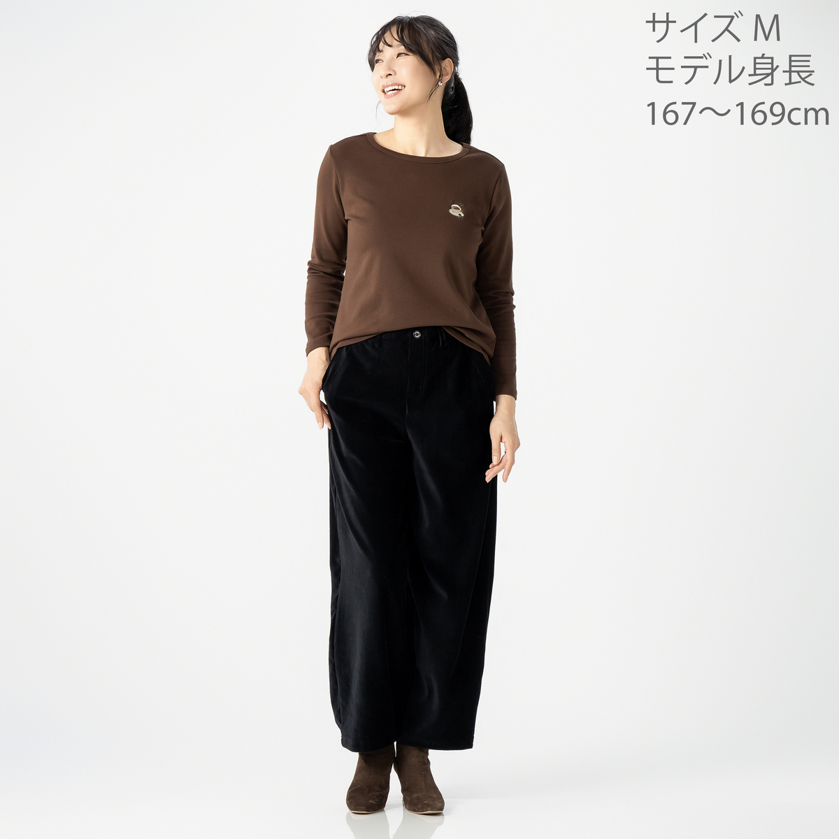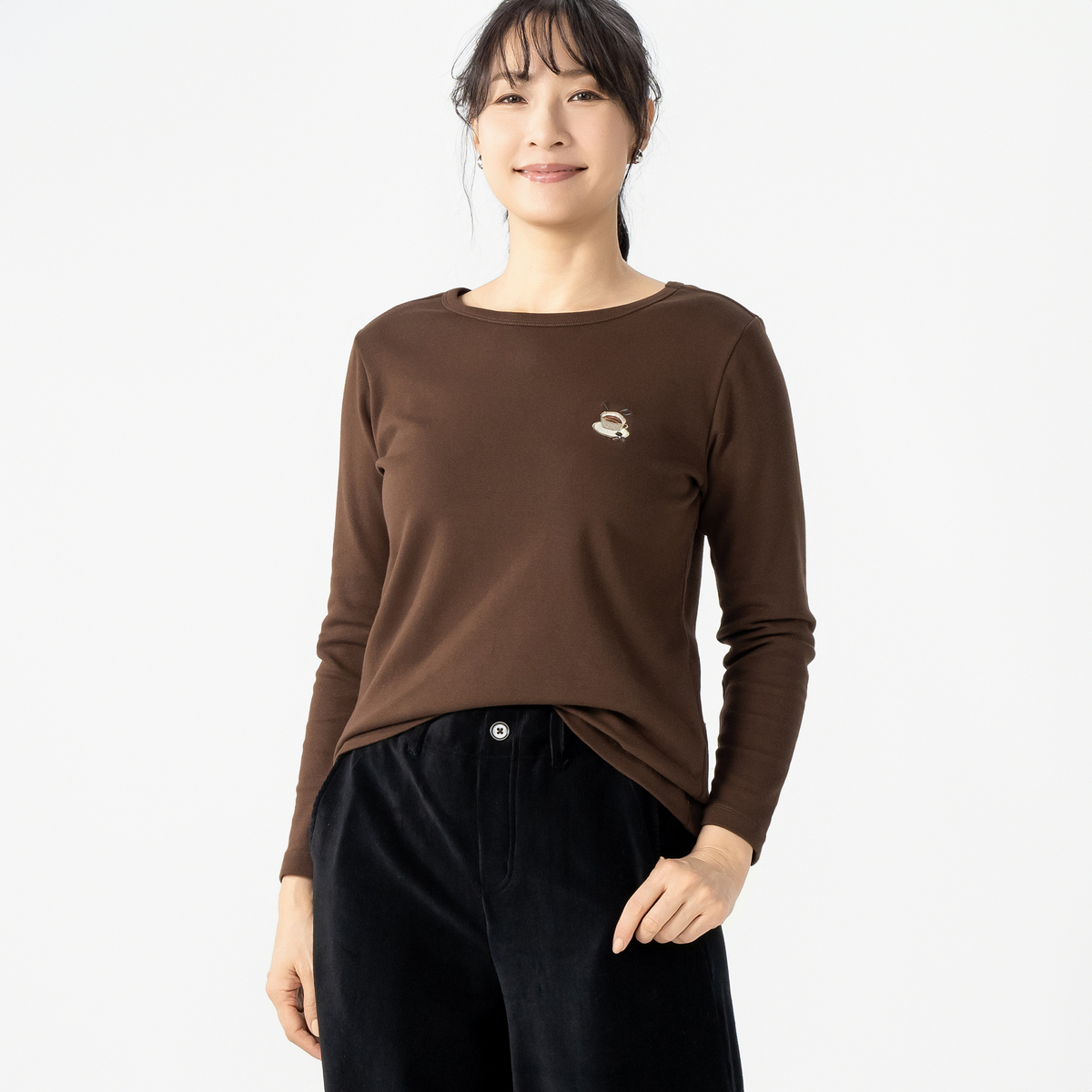 エニワイズ加工を施したロングTシャツです。繊維中に油脂分を含むことで、しっとりなめらかな肌ざわりです。やわらかな裏微起毛が心地よく、胸元にはさりげない刺繍のワンポイント入り。一枚でも、組合せでも活躍するアイテムです
