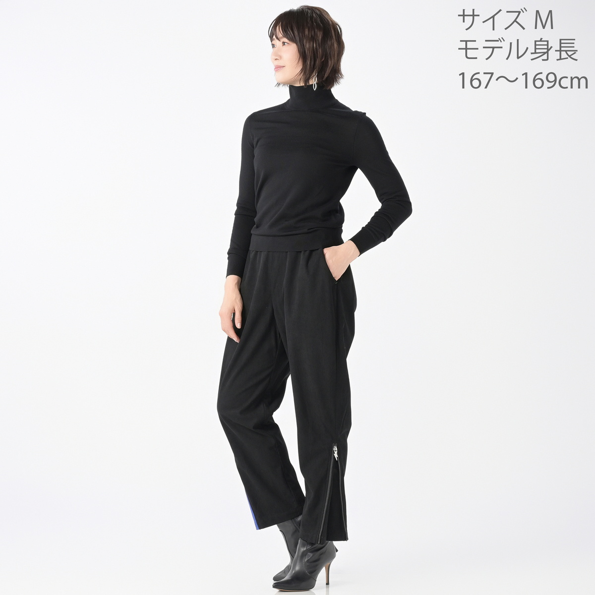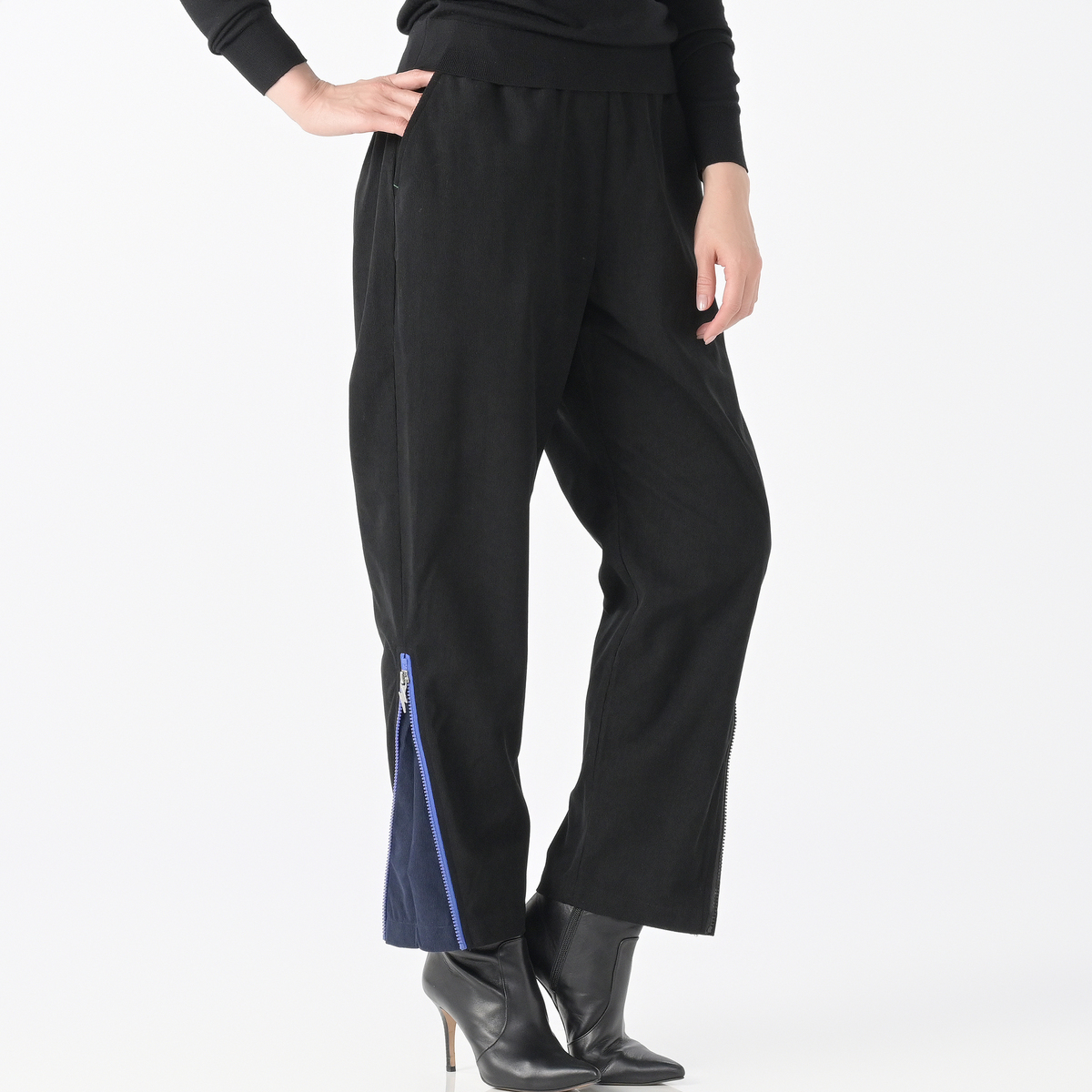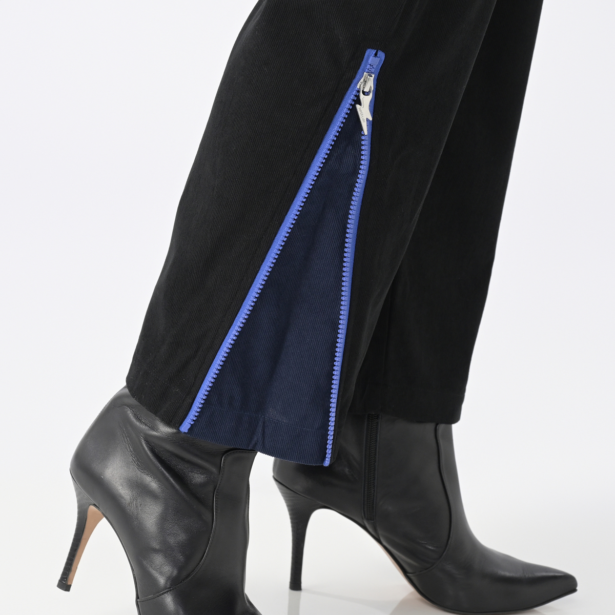 裾のファスナーアクセントがポイントのパンツ。細コール生地を使用しているので、カジュアル過ぎず上品な印象を与えます。ファスナーを閉めればすっきりとしたテーパードシルエット、開ければ程よく広がるセミワイドシルエットと、2通りのスタイルが楽しめます