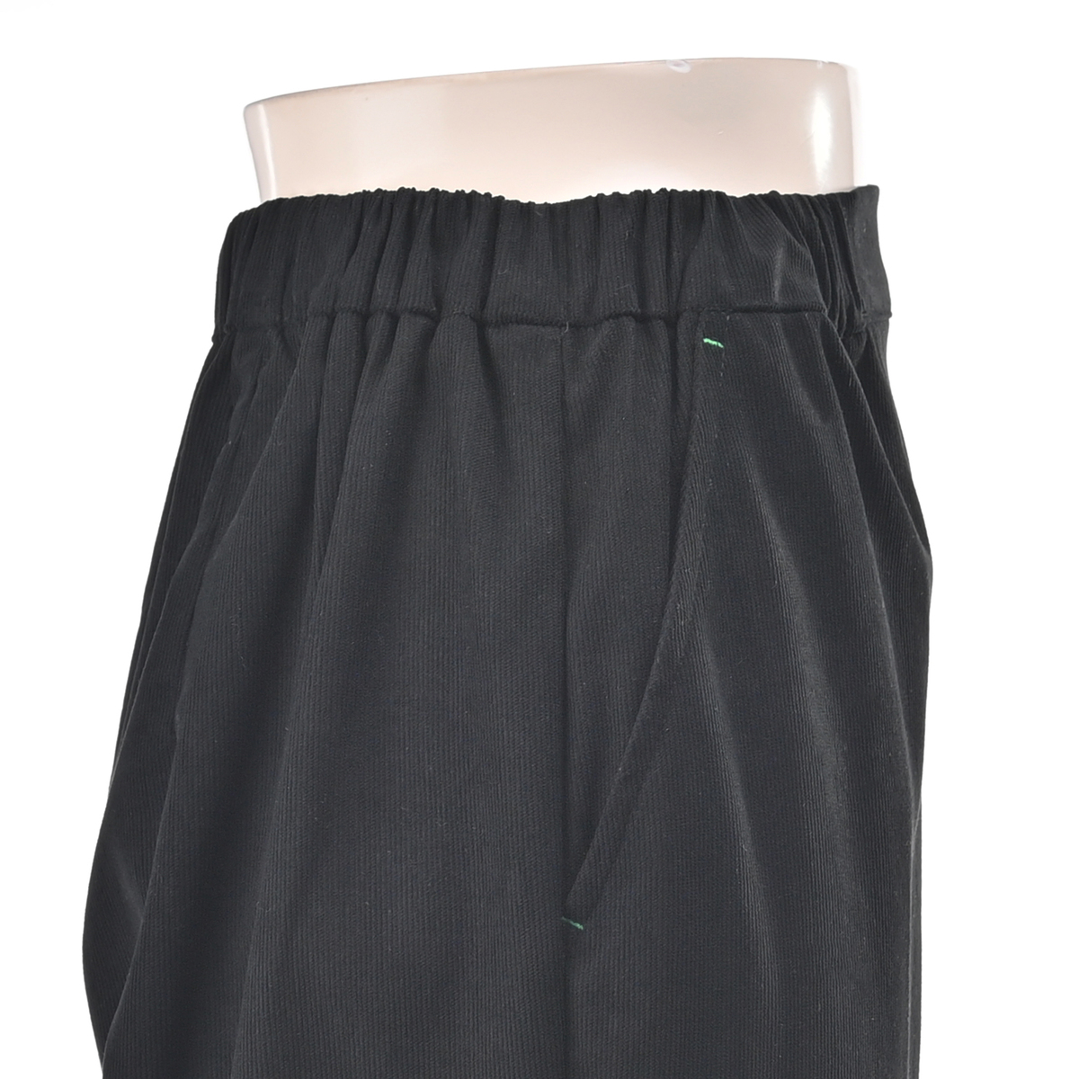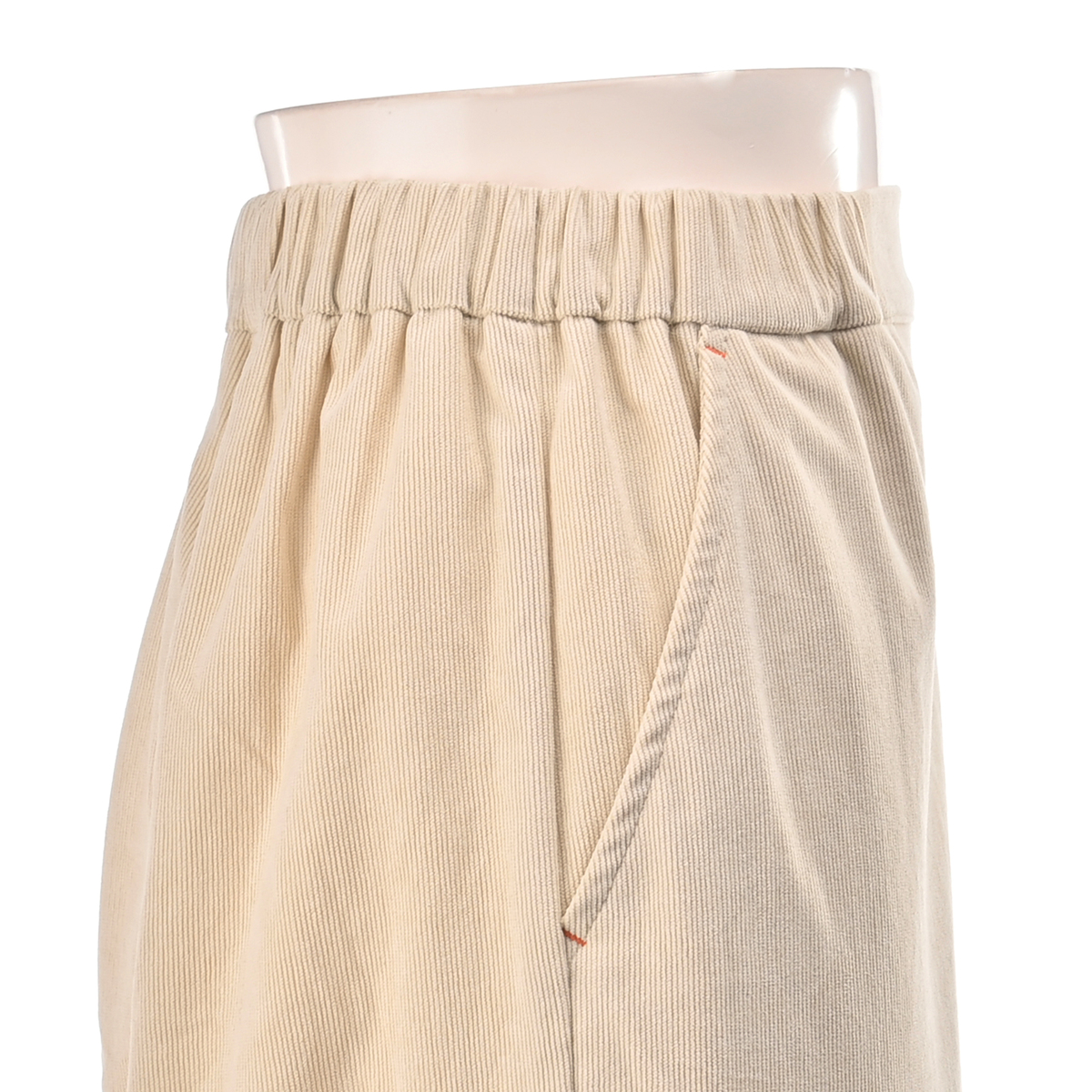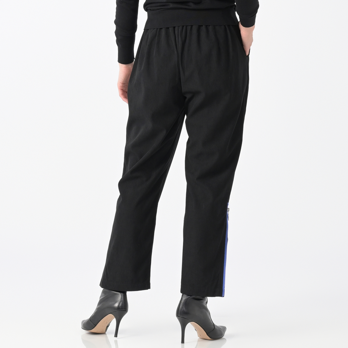 裾のファスナーアクセントがポイントのパンツ。細コール生地を使用しているので、カジュアル過ぎず上品な印象を与えます。ファスナーを閉めればすっきりとしたテーパードシルエット、開ければ程よく広がるセミワイドシルエットと、2通りのスタイルが楽しめます