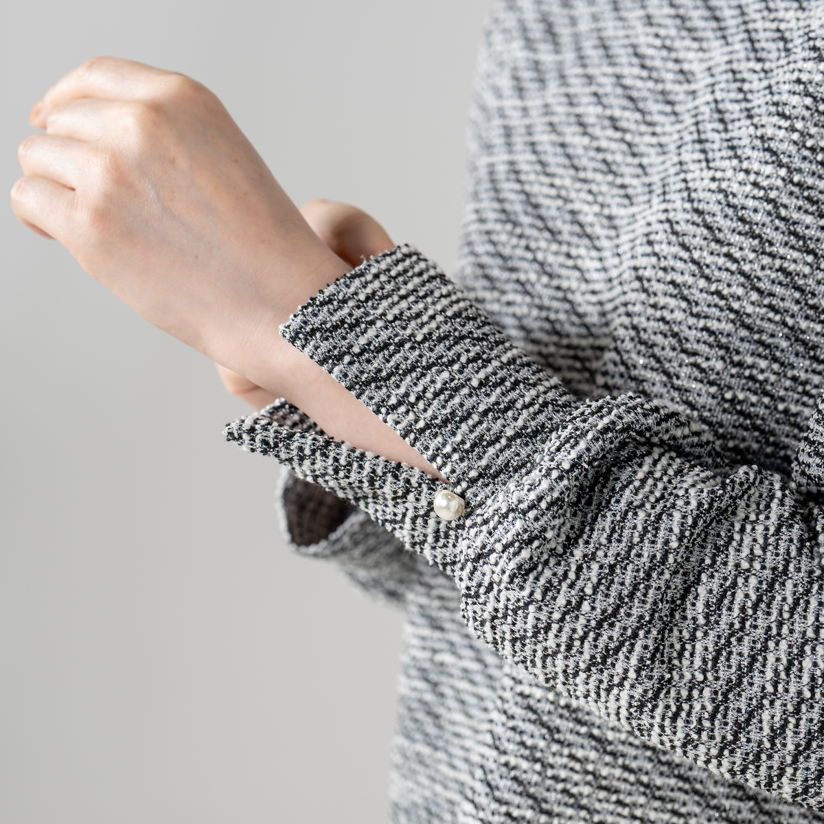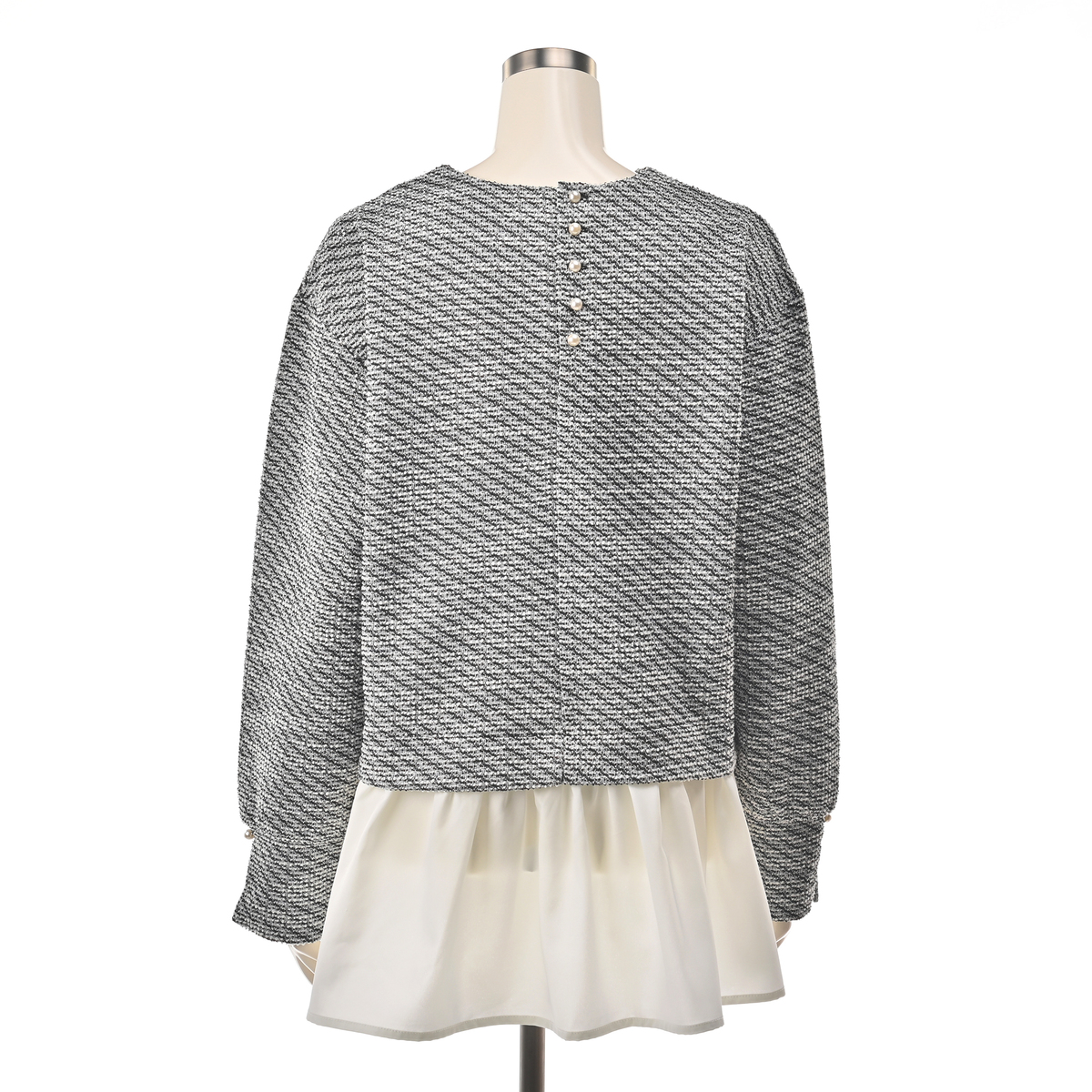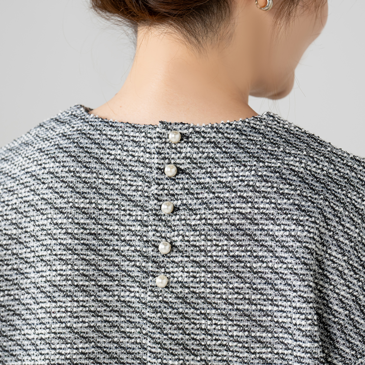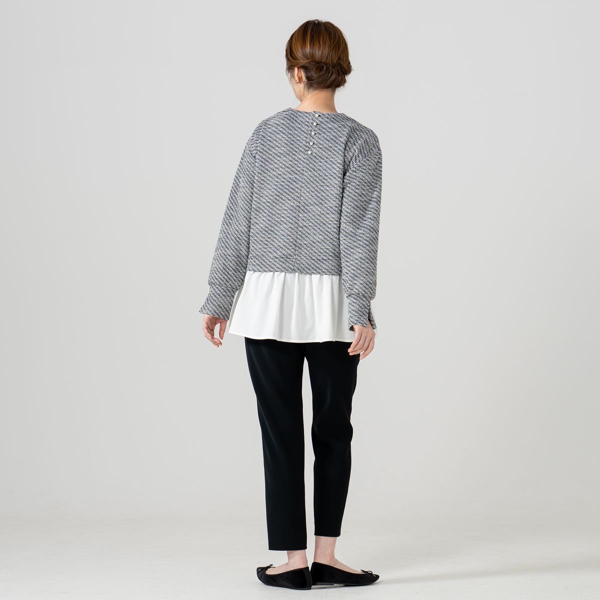 カットツイードを使用した切替デザインが目を引くプルオーバー。後ろにはアクセントになるボタンをあしらい、さりげないポイントに。ご家庭で洗濯機洗い(洗濯ネット使用)可能で、お手入れも簡単です