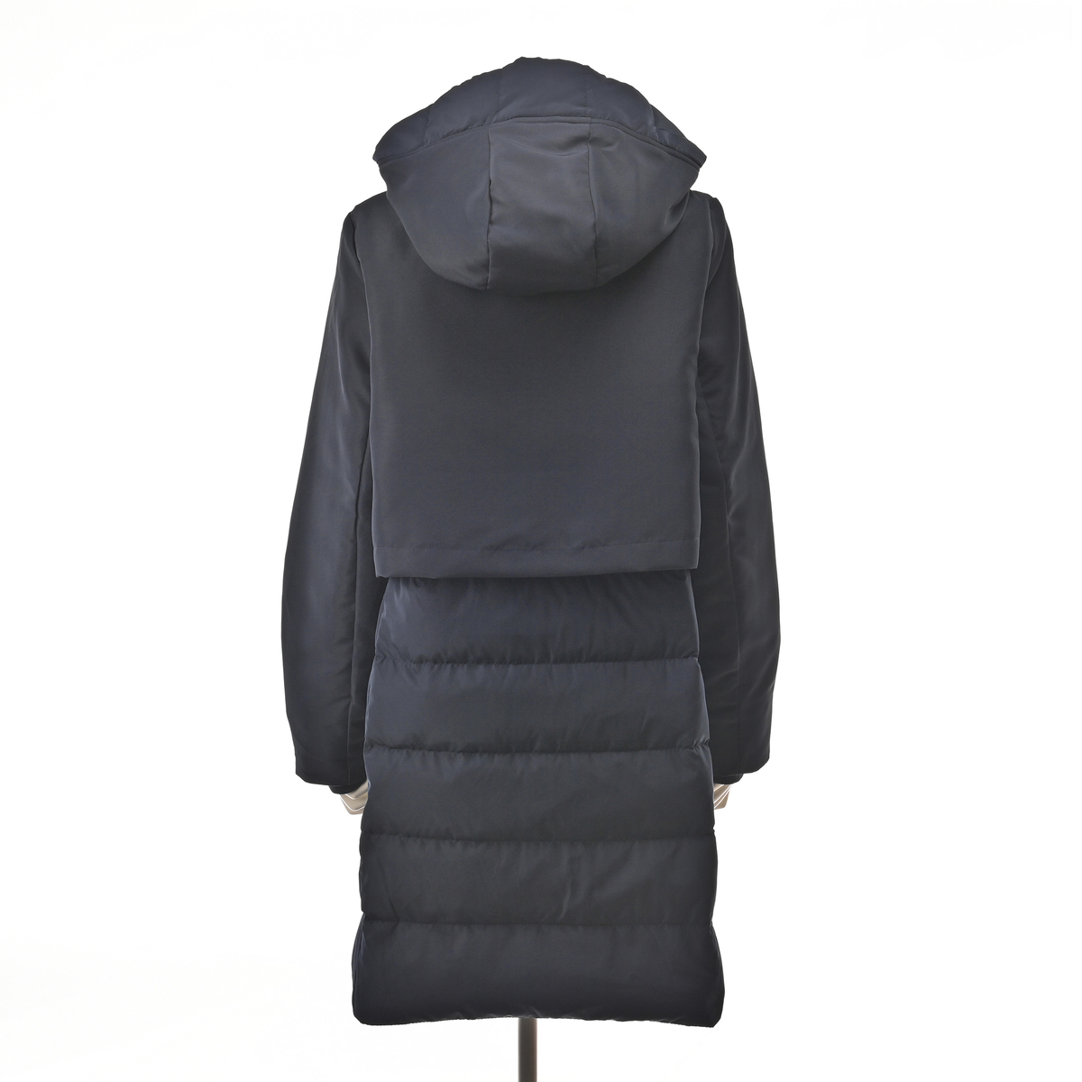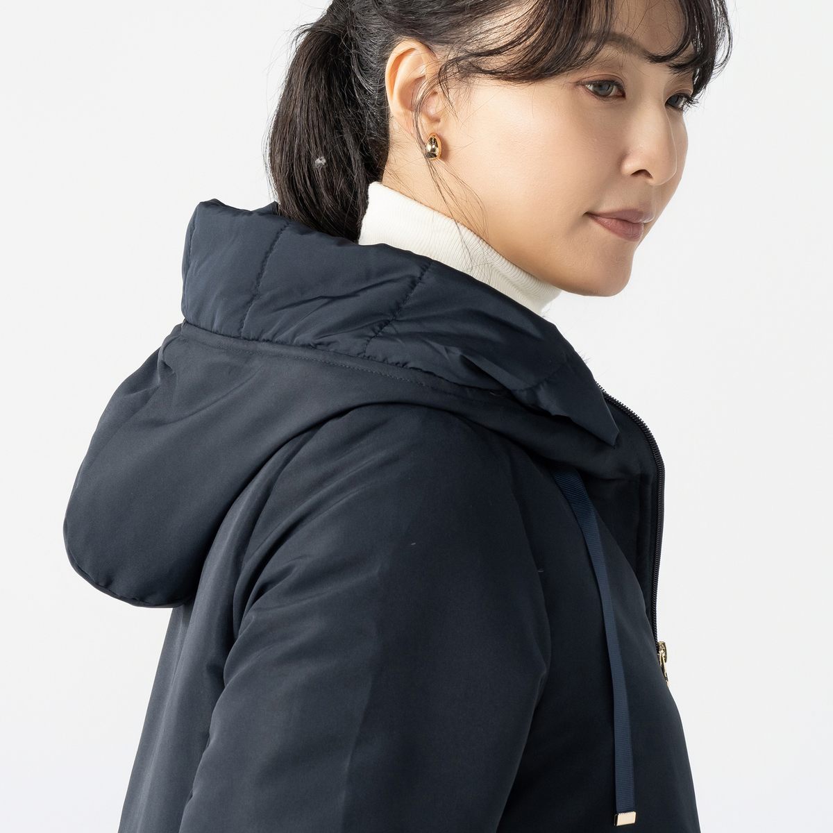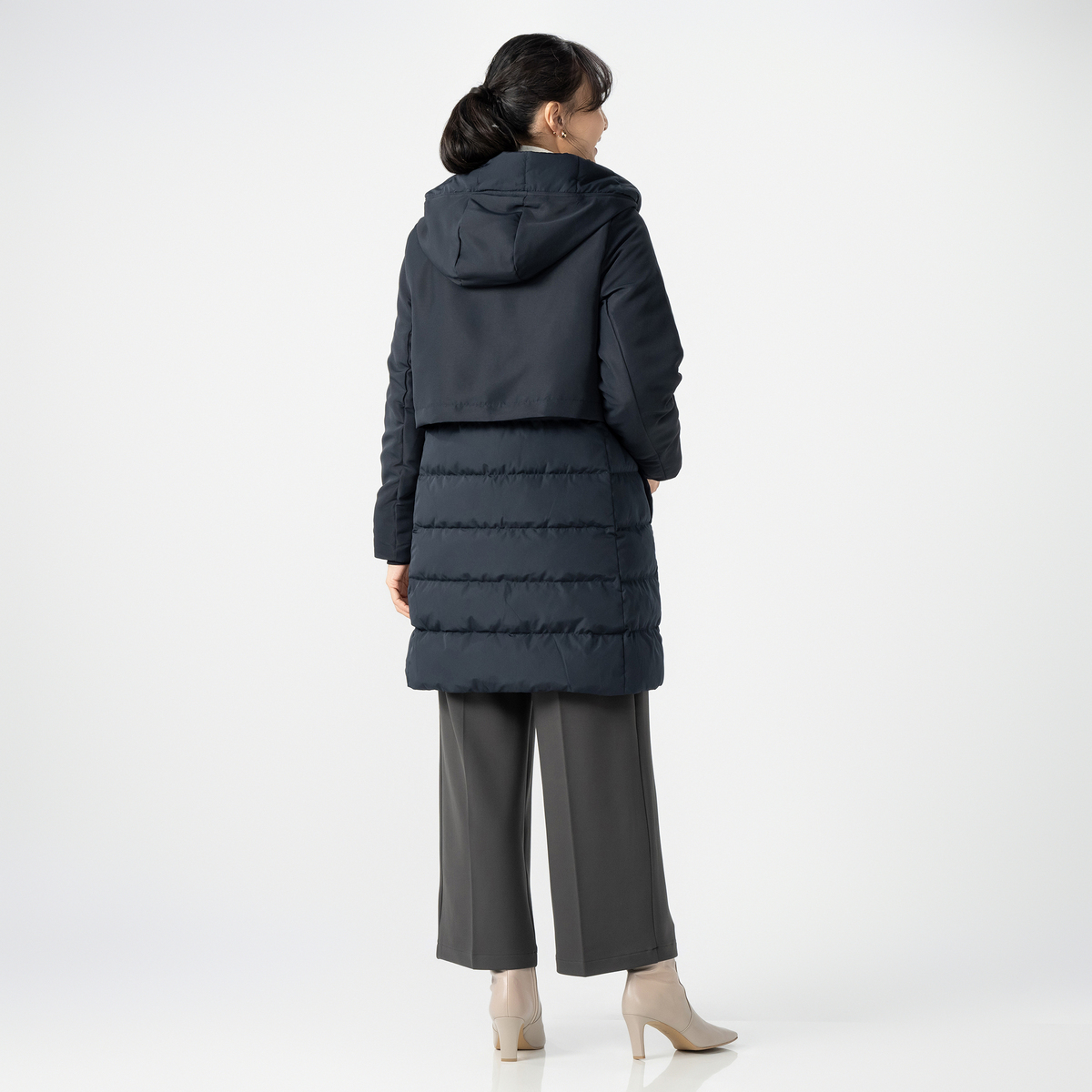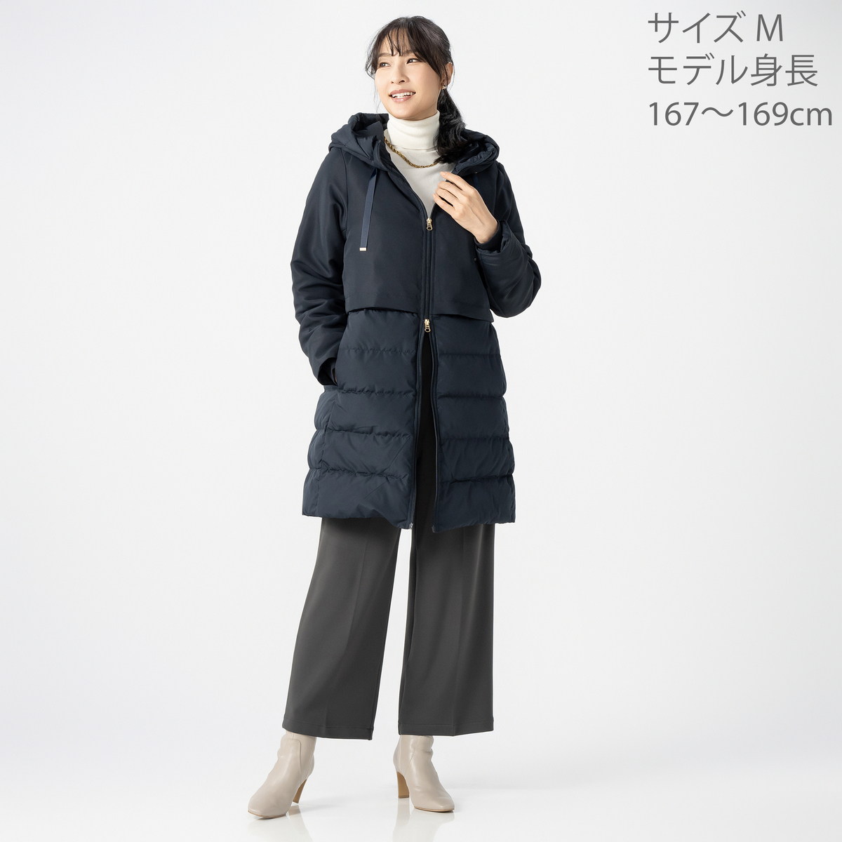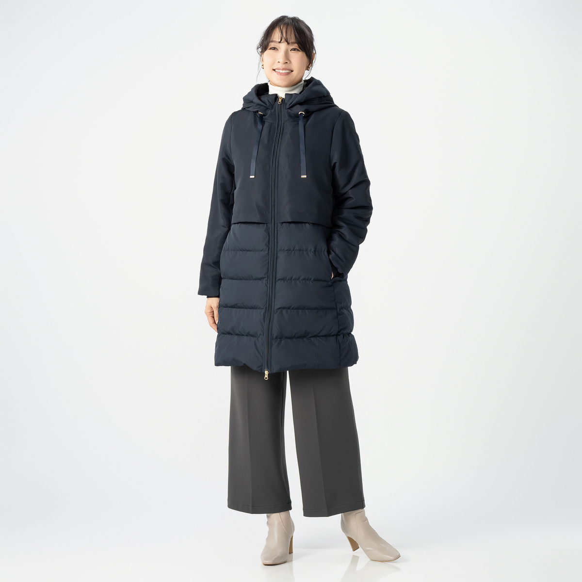 スタイリッシュなダウンコート。身頃にはあたたかいようにダウンを、袖とフードには中わたを使い、着ぶくれ感を抑えながら、すっきりとしたシルエットになるように設計しました。大人の冬の装いを上品に引き立て、毎日の外出を心地よくサポートします