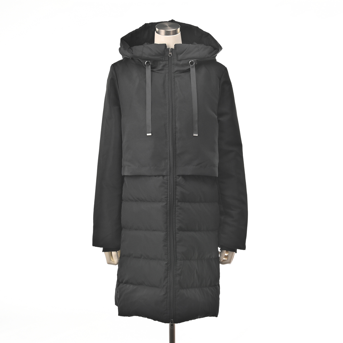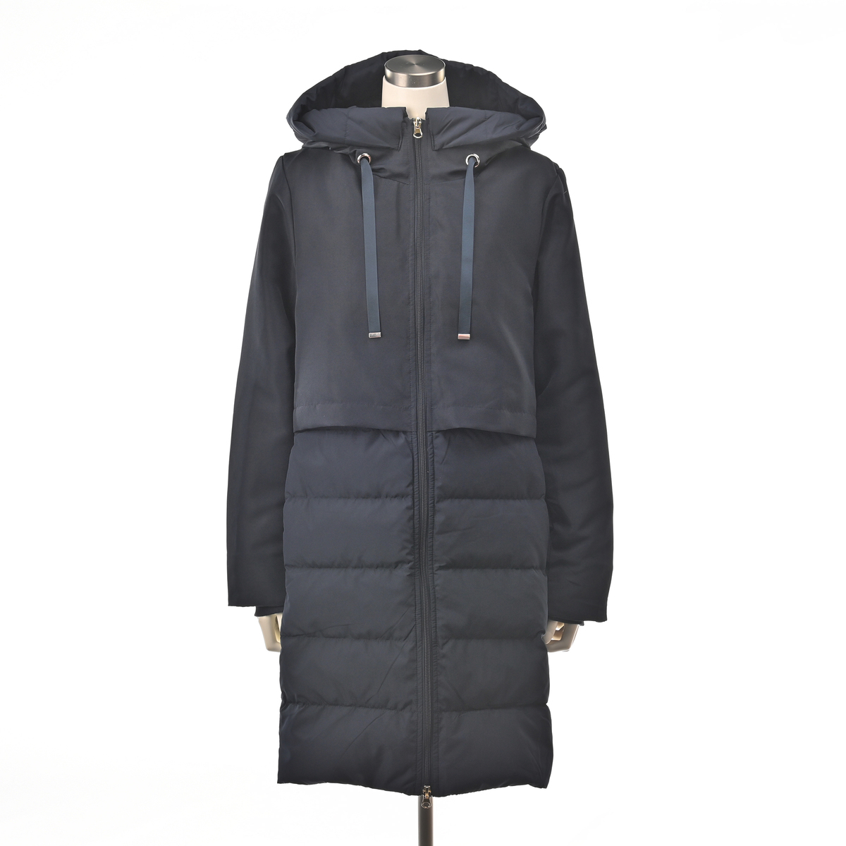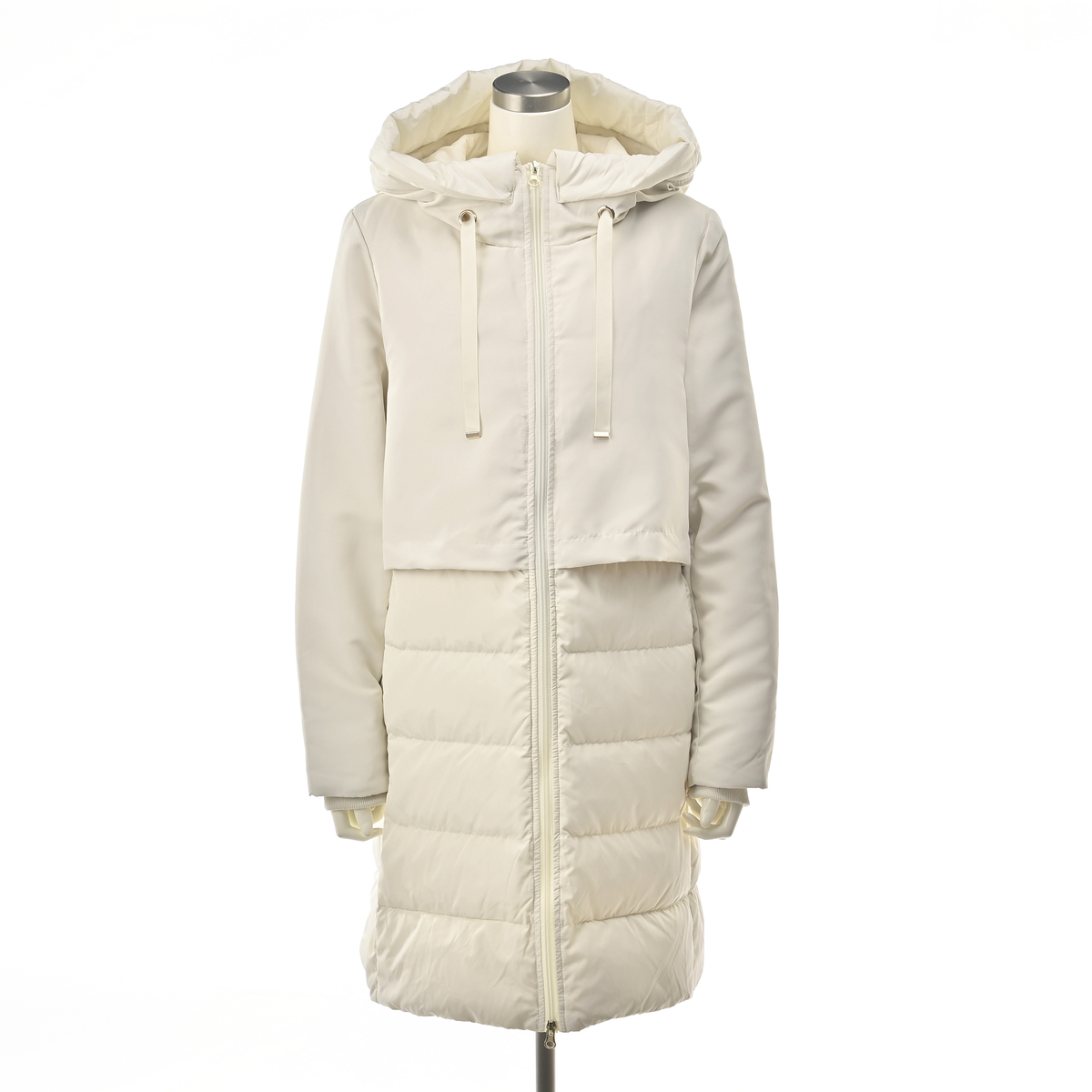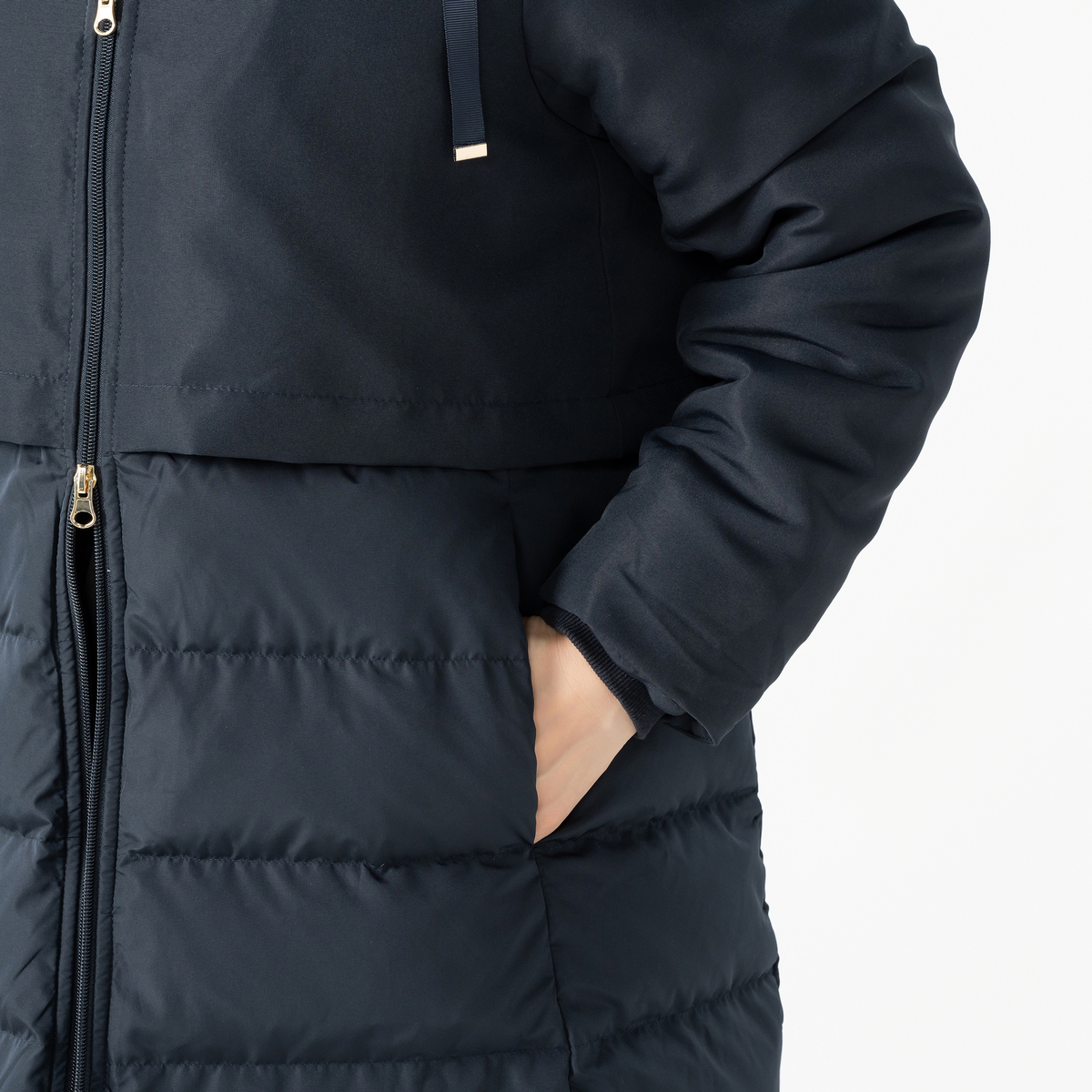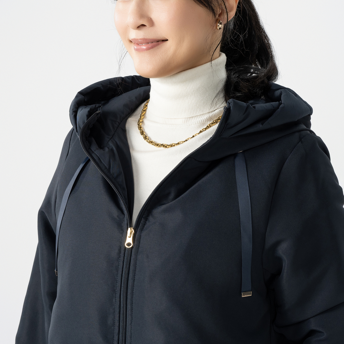 スタイリッシュなダウンコート。身頃にはあたたかいようにダウンを、袖とフードには中わたを使い、着ぶくれ感を抑えながら、すっきりとしたシルエットになるように設計しました。大人の冬の装いを上品に引き立て、毎日の外出を心地よくサポートします