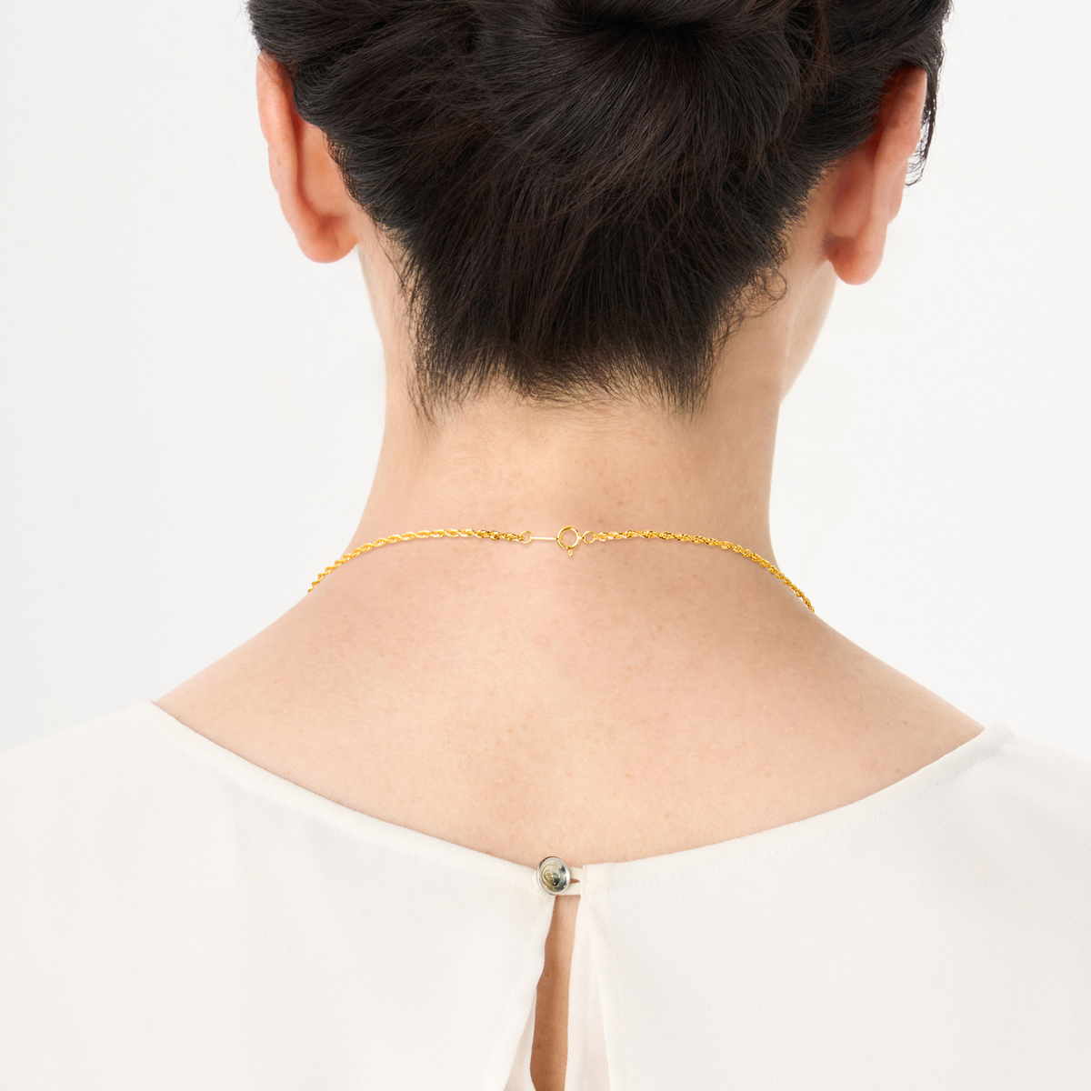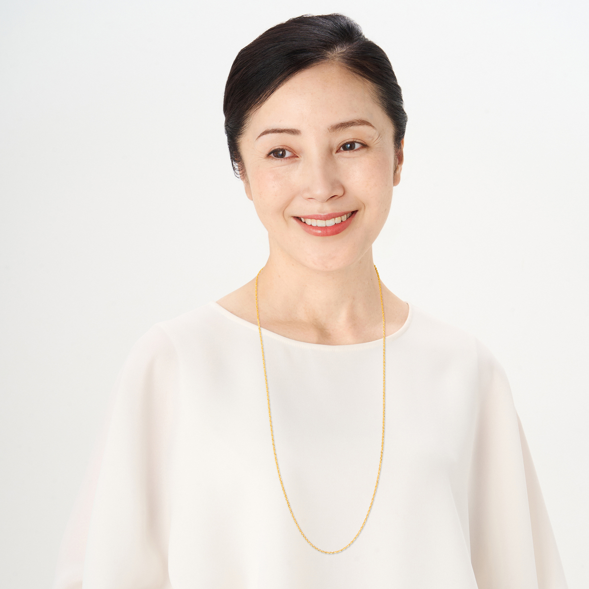 純金の美しい輝きが際立つネックレスです。密に編み上げることで形状が崩れることなく立体的なフォルムを保ち、贅沢な存在感を放ちます