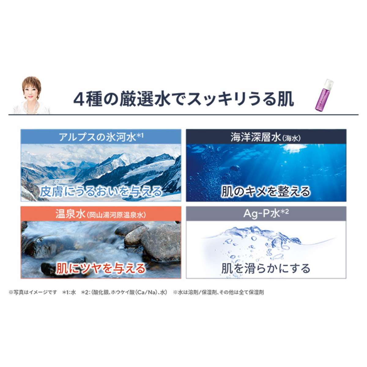 *6)岡山の湯原温泉水(温泉水)、アルプスの氷河水(水)、海洋深層水(海水)、Ag-P水(酸化銀、ホウケイ酸(Ca/Na)、水):水は溶剤/保湿剤、その他は全て保湿剤
