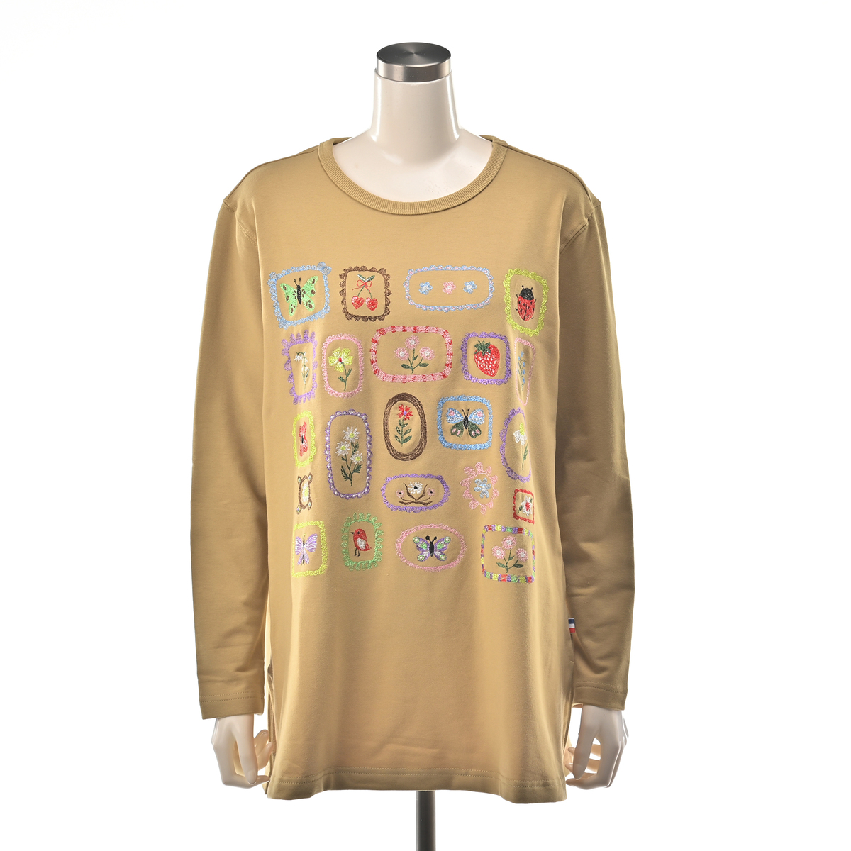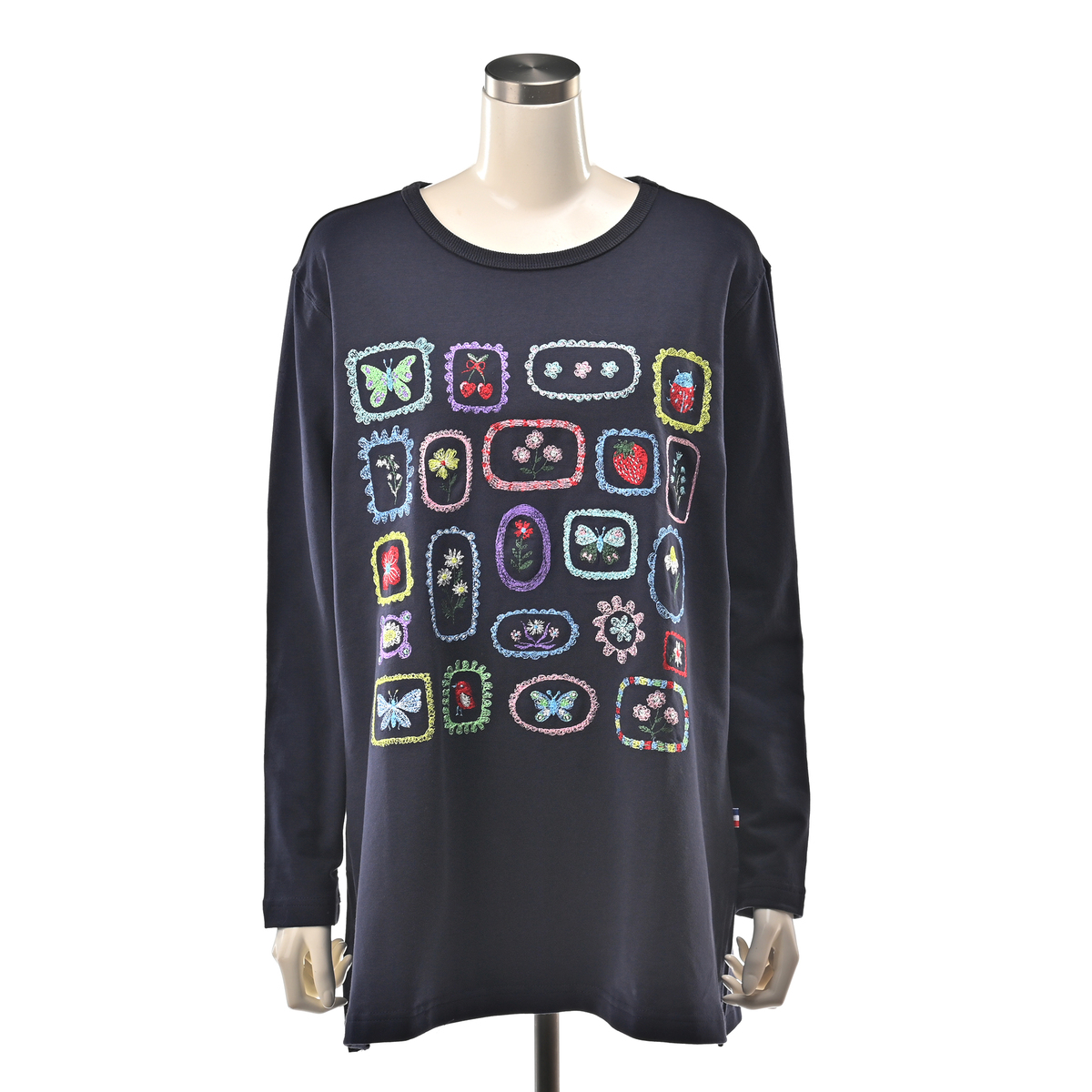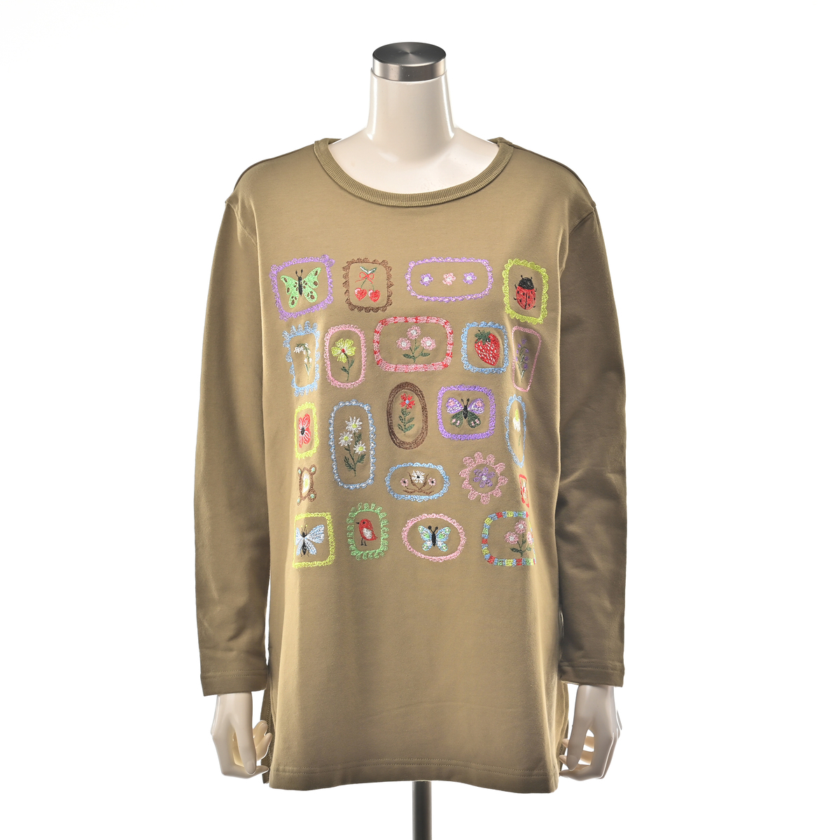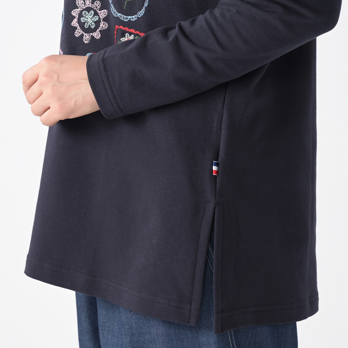 裏毛素材で仕立てたチュニック丈のトップスです。ヒップ下まで覆い、体型を上手にカモフラージュ。さまざまな図にカラフルな刺繍をあしらい、華やかな印象を演出します