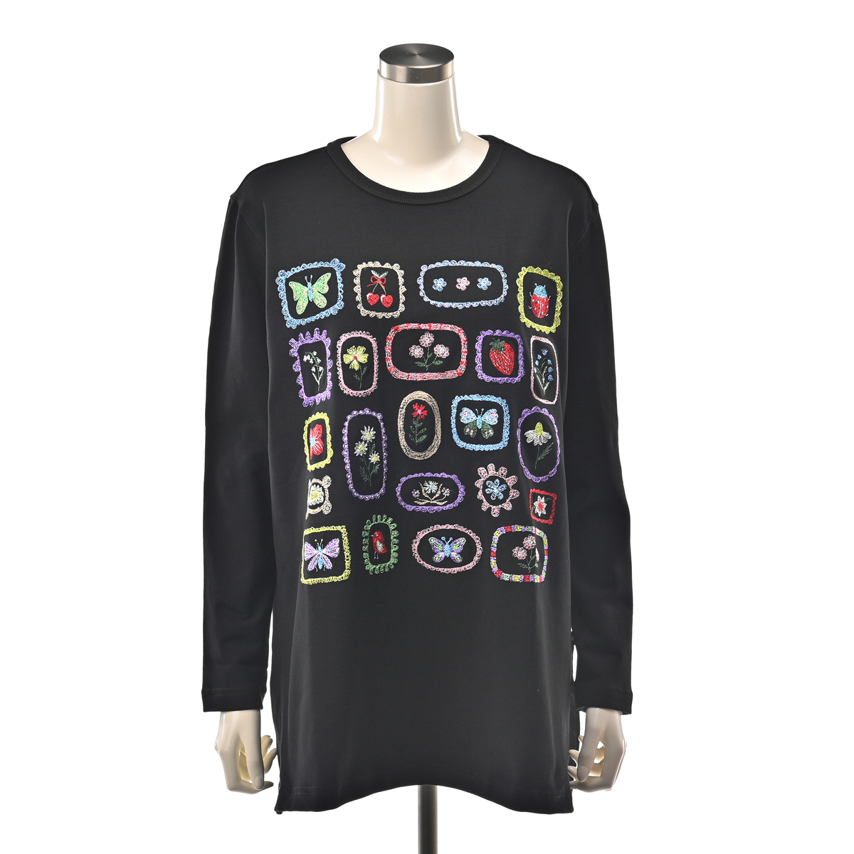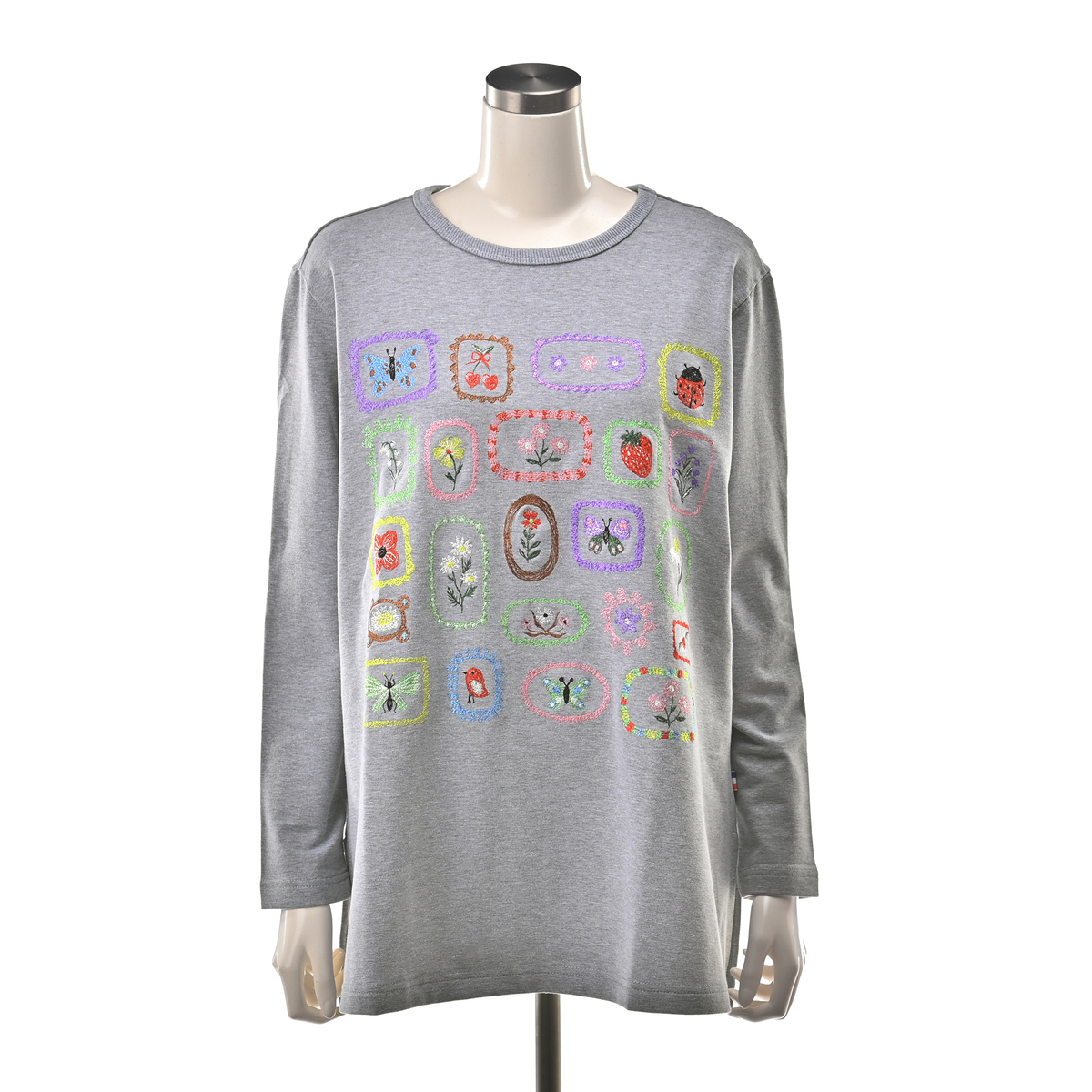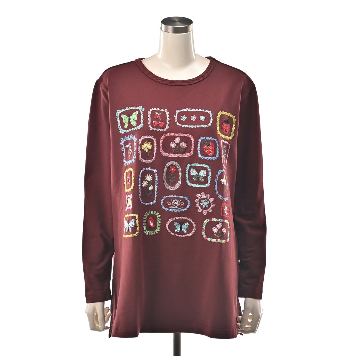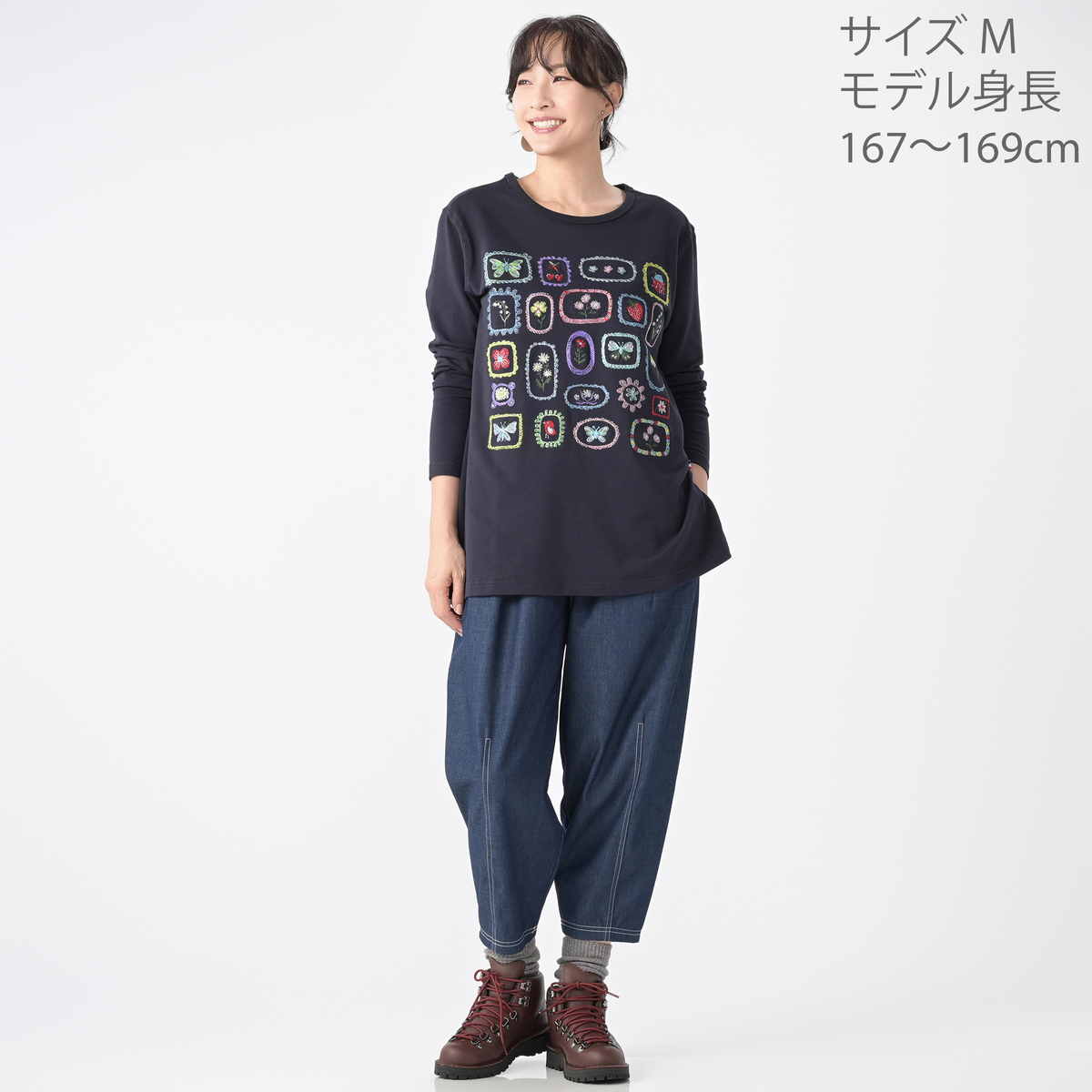 裏毛素材で仕立てたチュニック丈のトップスです。ヒップ下まで覆い、体型を上手にカモフラージュ。さまざまな図にカラフルな刺繍をあしらい、華やかな印象を演出します