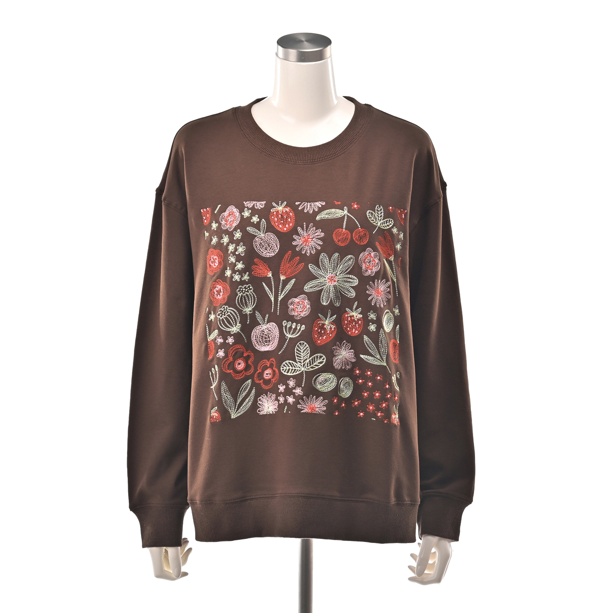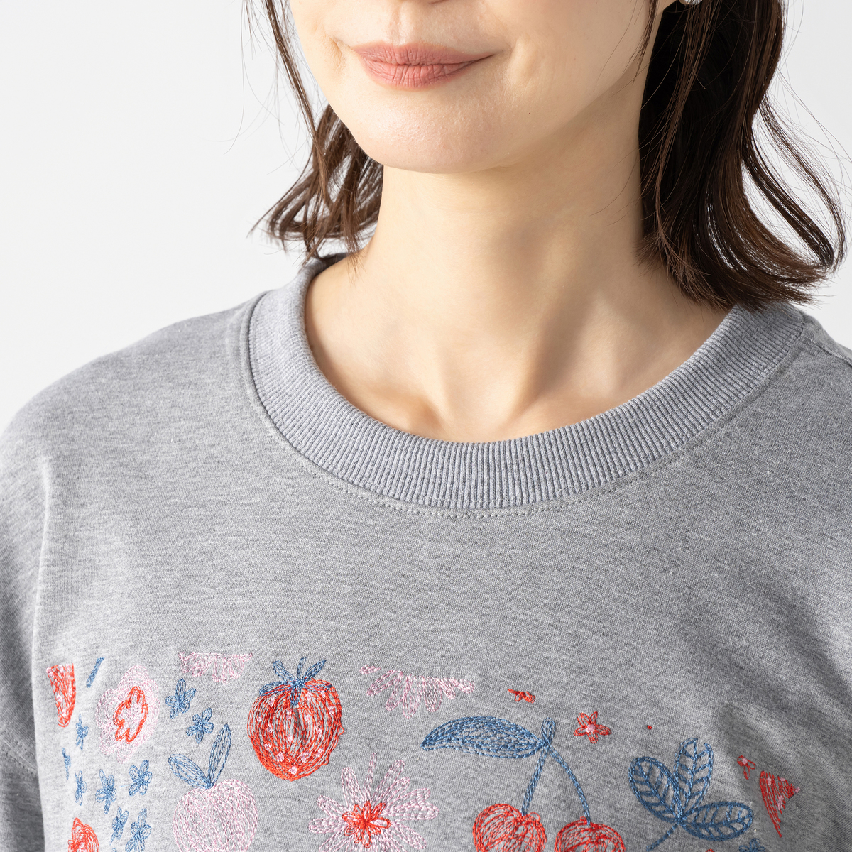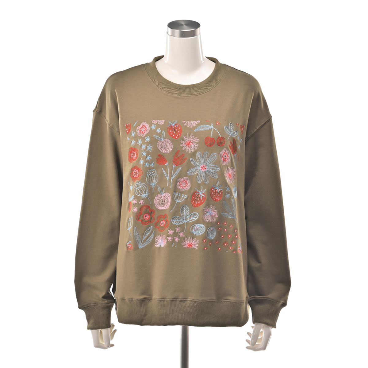 裏毛素材を使用したクルーネックタイプのスウェットです。ゆとりのあるシルエットで快適な着心地。大きめの図案に刺繍を施し、胸元を華やかに彩ります