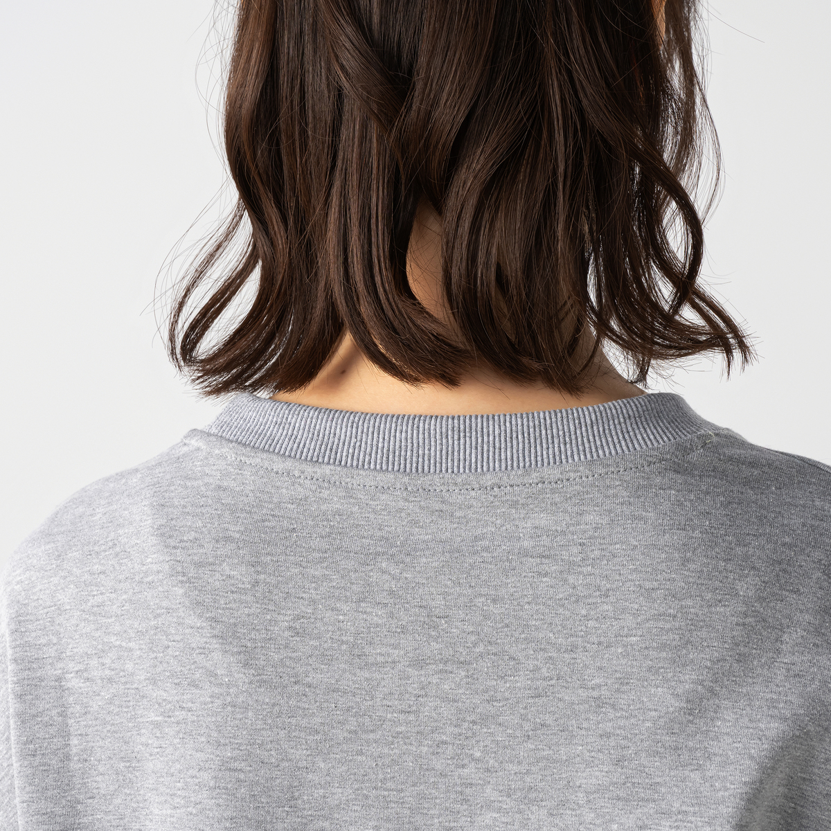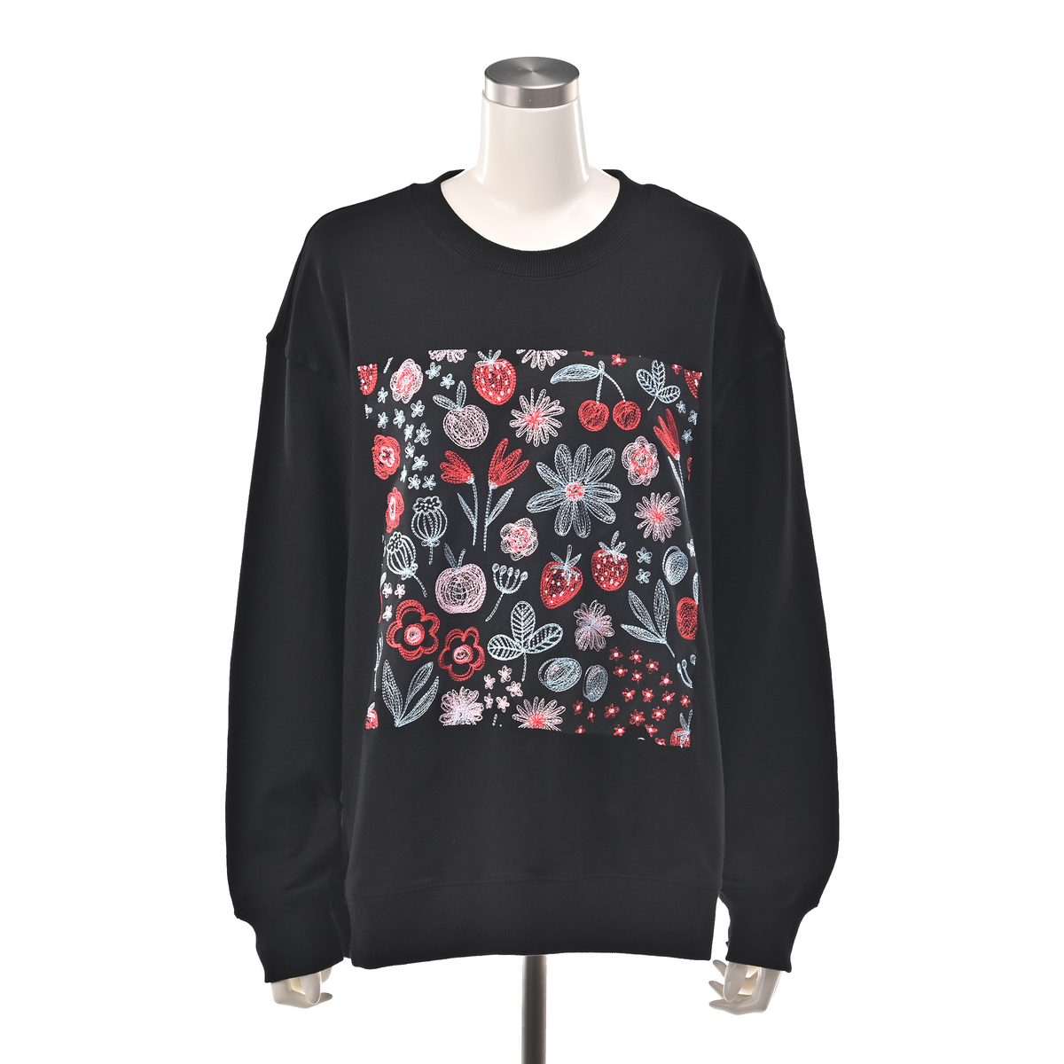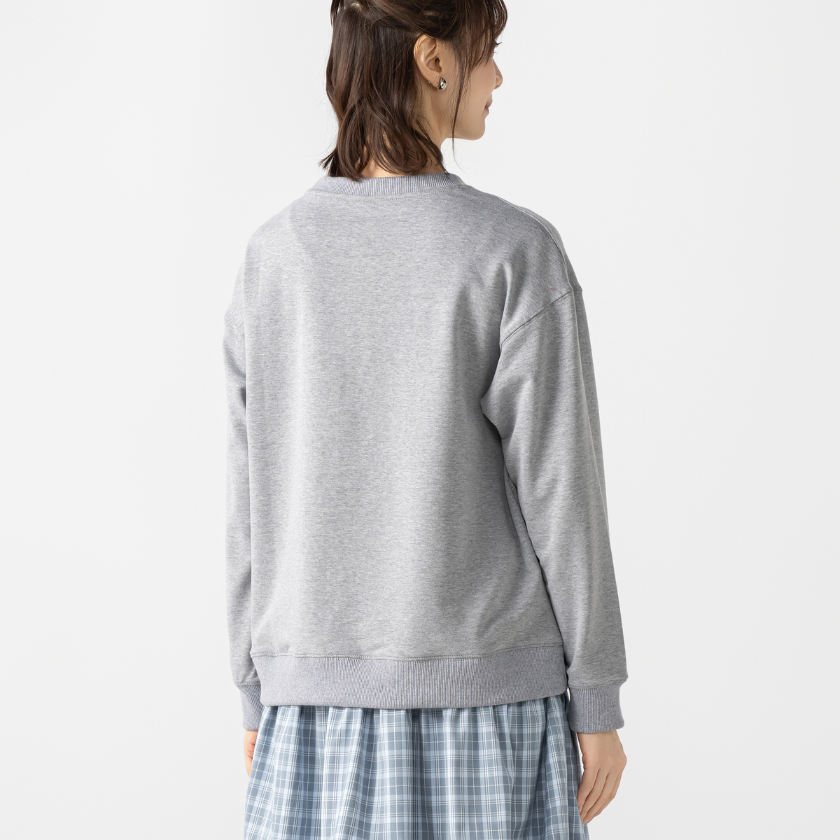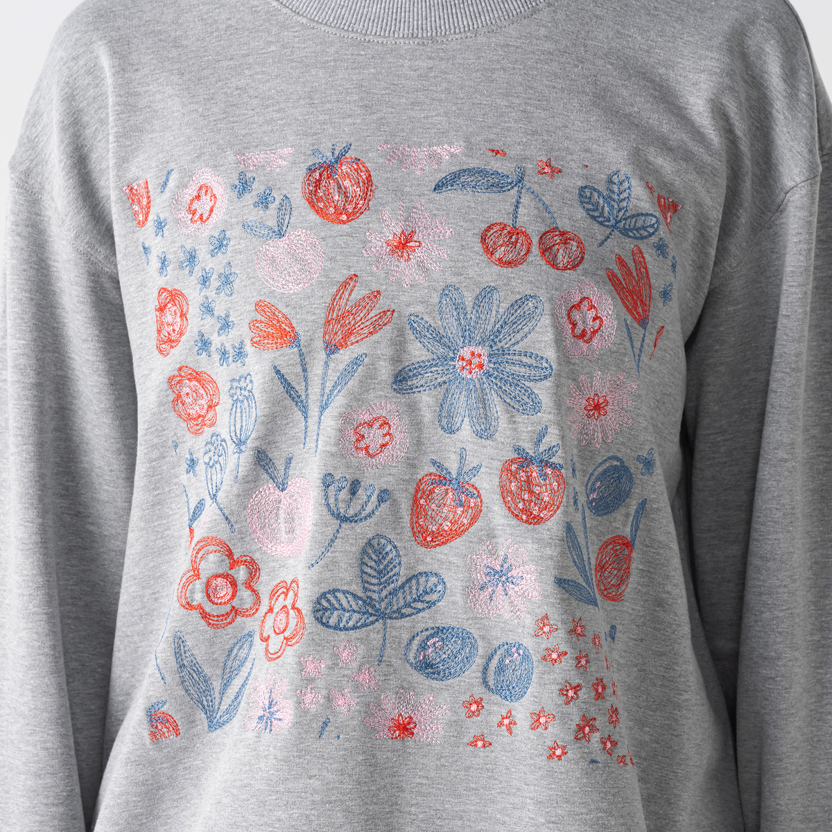 裏毛素材を使用したクルーネックタイプのスウェットです。ゆとりのあるシルエットで快適な着心地。大きめの図案に刺繍を施し、胸元を華やかに彩ります