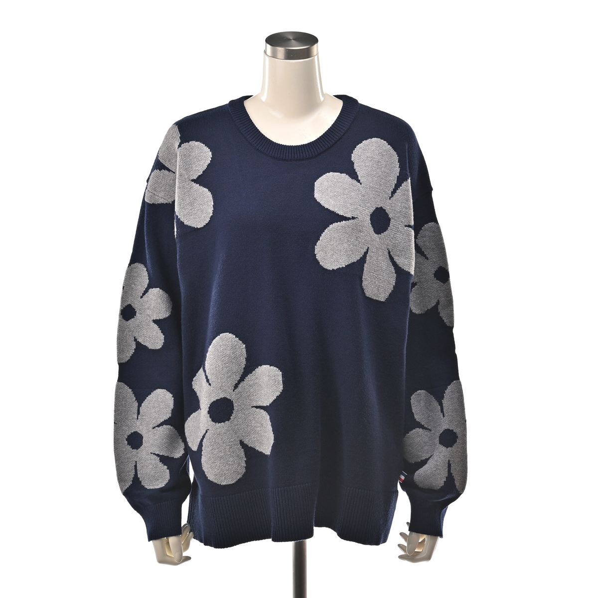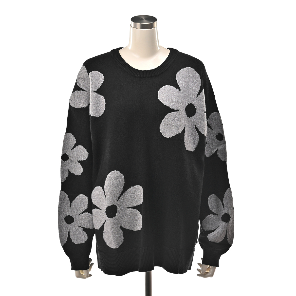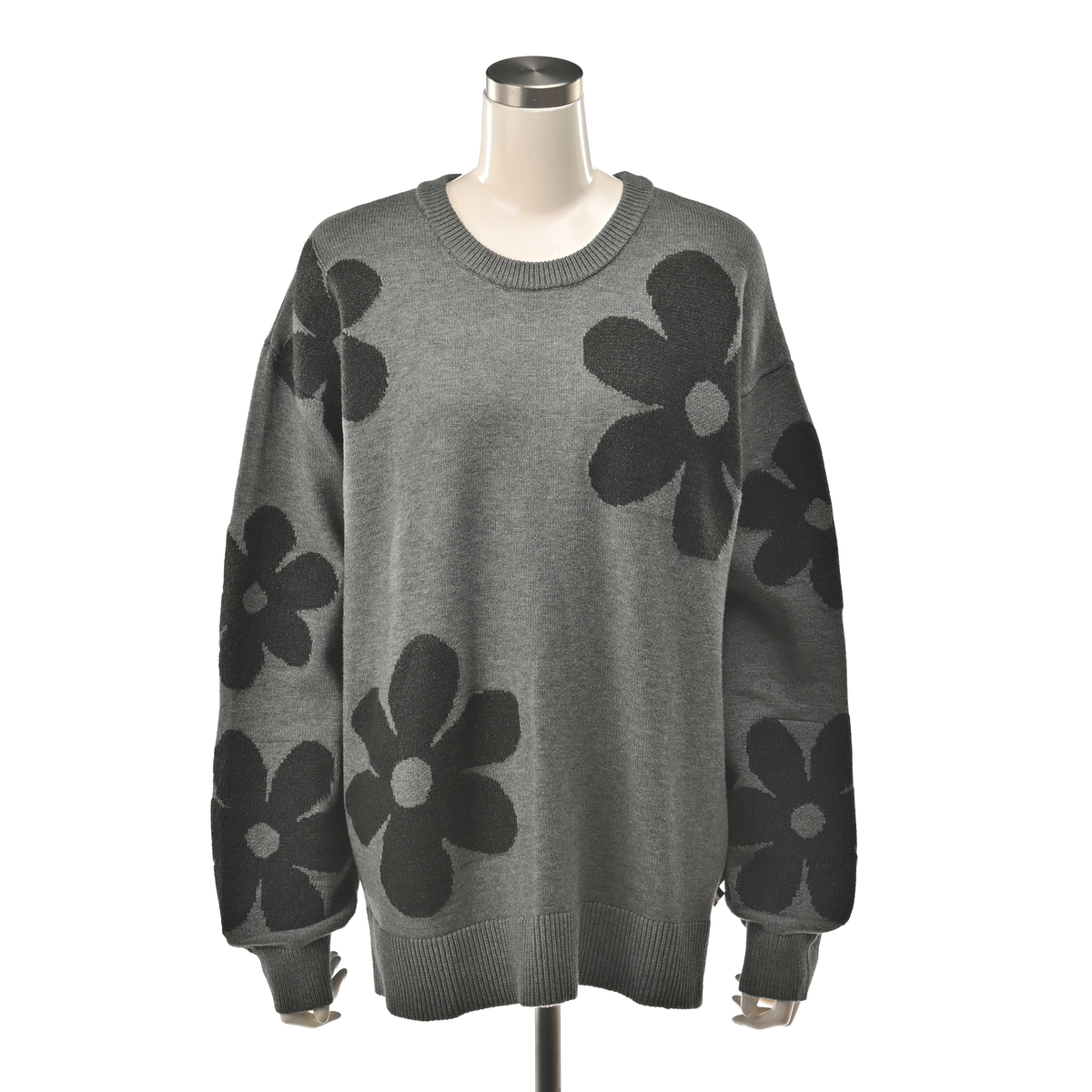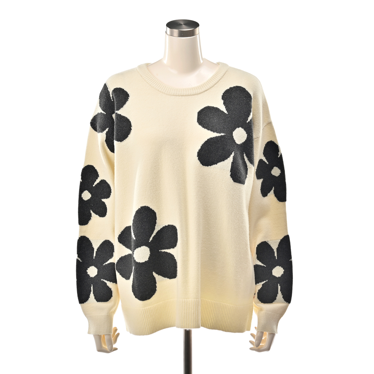 大きな花柄を編み込んだクルーネックニット。ゆったりした着心地で、大人可愛い印象に仕上げています。コーディネートを若々しく見せたい時にも活躍します