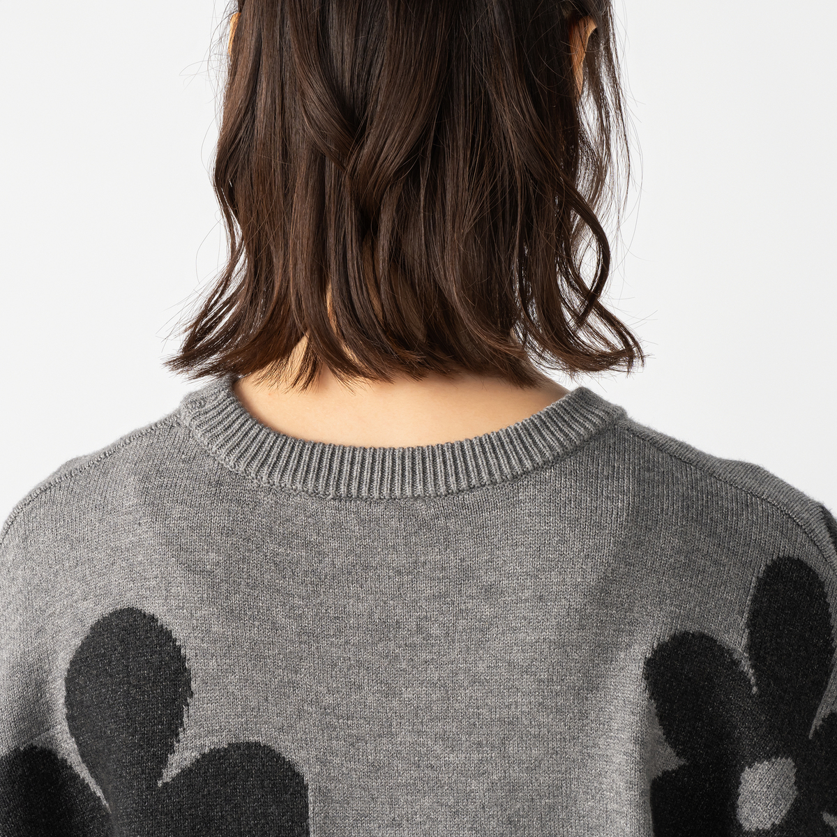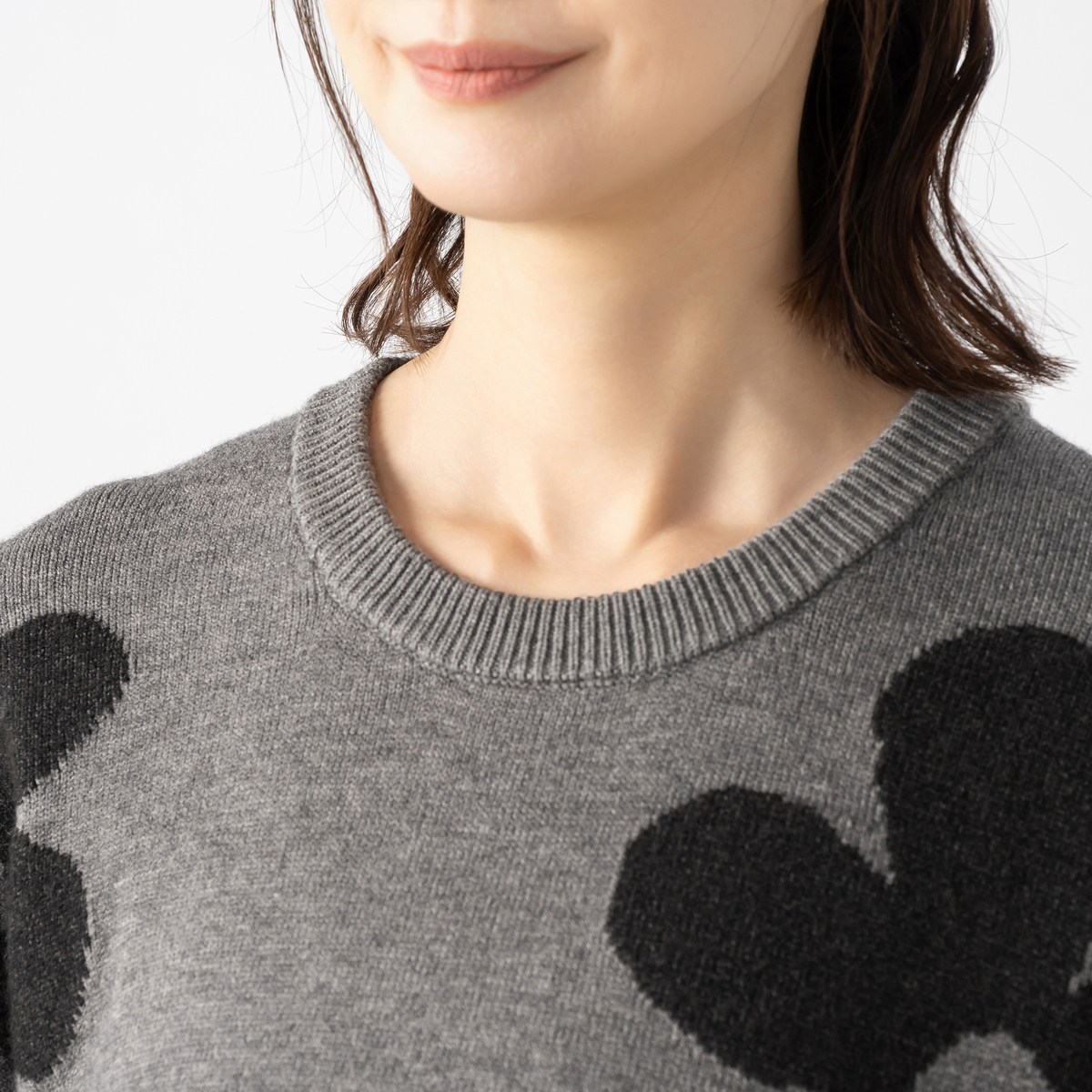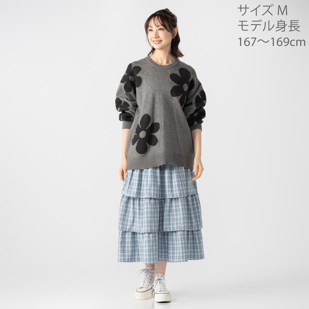 大きな花柄を編み込んだクルーネックニット。ゆったりした着心地で、大人可愛い印象に仕上げています。コーディネートを若々しく見せたい時にも活躍します