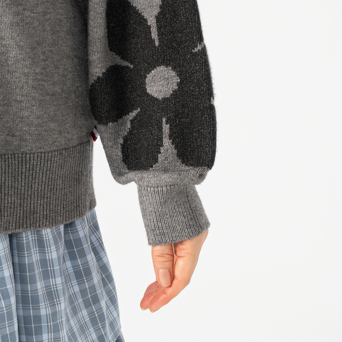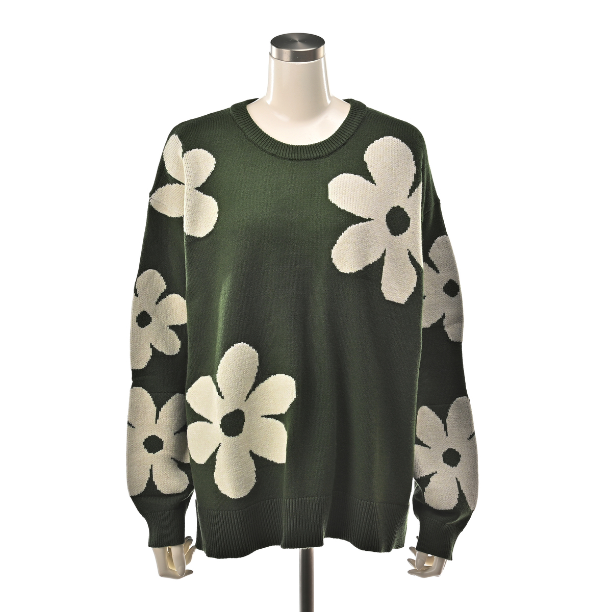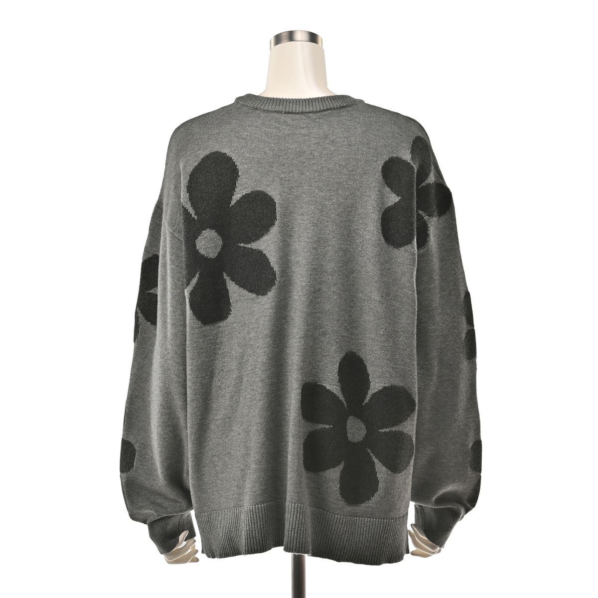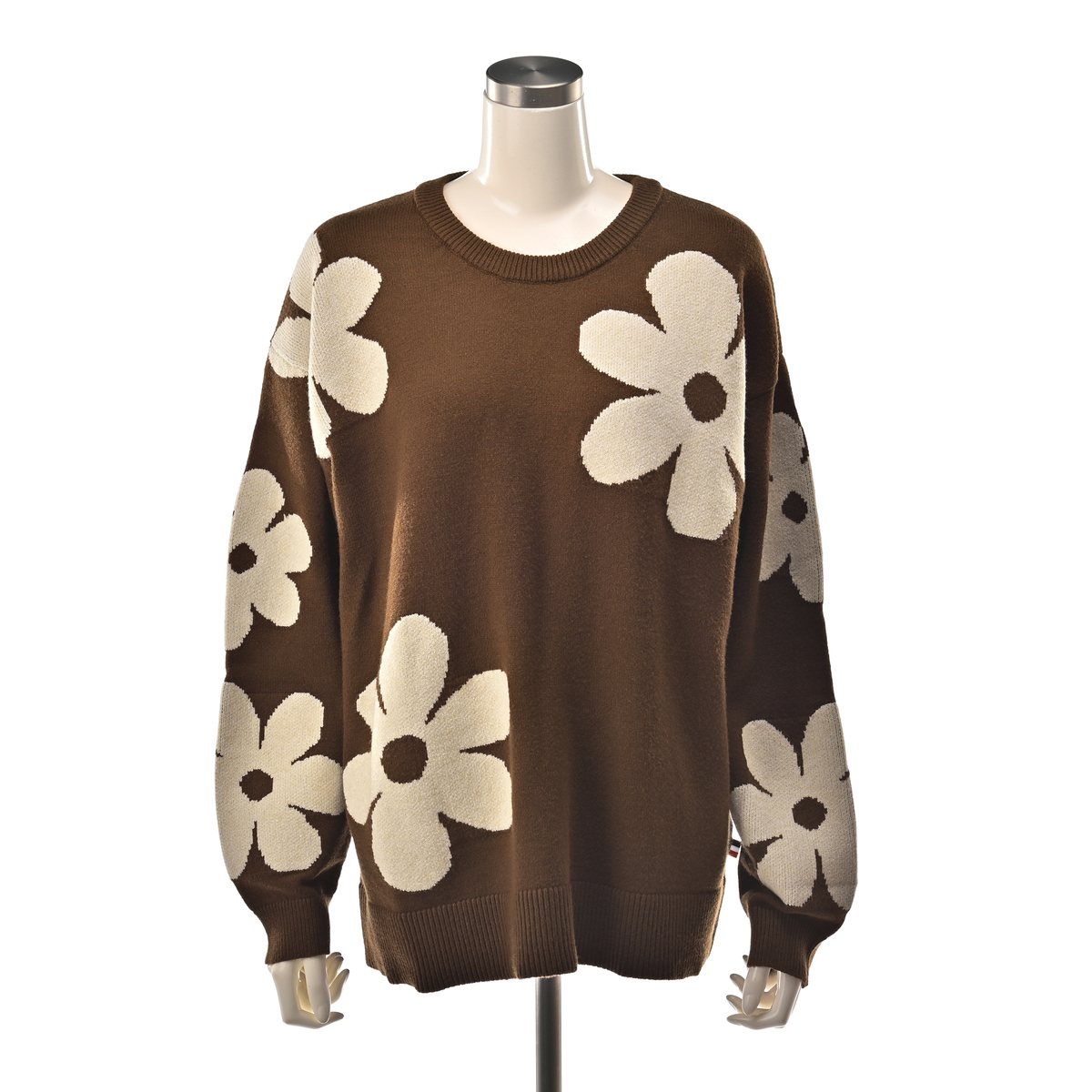 大きな花柄を編み込んだクルーネックニット。ゆったりした着心地で、大人可愛い印象に仕上げています。コーディネートを若々しく見せたい時にも活躍します
