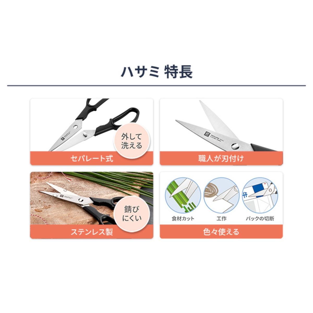 [サイズ] 縦20.5×横7.0×厚さ1.4cm [重量] 90g [材質] ブレード部:ハイカーボンステンレス鋼 ハンドル部:グラスファイバー強化ポリアミド樹脂 [取り外し方] ・ハサミを広げる ・ネジ部分をひねって外す ※元に戻すときは、ネジ部分を合わせてはめ込み、ハサミを閉じる [注意事項] ※使用不可:取っ手取外し、漂白剤、食器洗い機 ※鋭利な刃付けを施しておりますので、お取扱いには十分にご注意下さい ※ご使用後はサビ防止のため、乾いた布等で汚れを拭き取り、十分に乾燥させてから収納してください ※サビや変色の原因となりますので、醤油、塩等の調味料や水に浸けないようにご注意下さい ※刃こぼれの原因になりますので、肉、魚の骨等硬いものにはご使用にならないでください ※食器洗い乾燥機使用不可 【中国製】