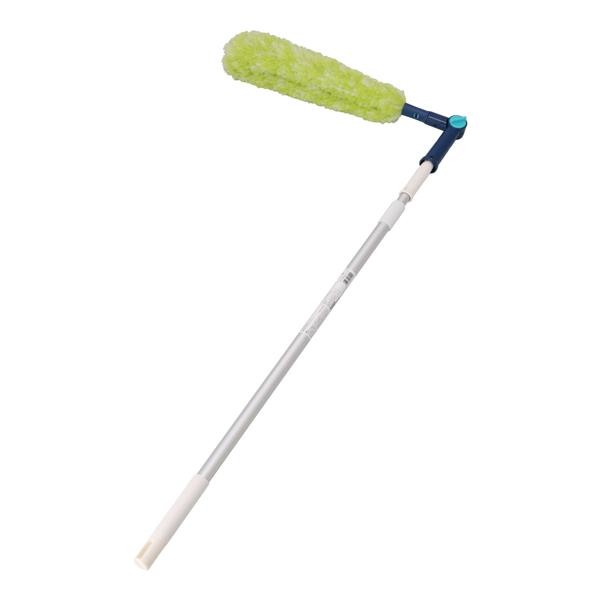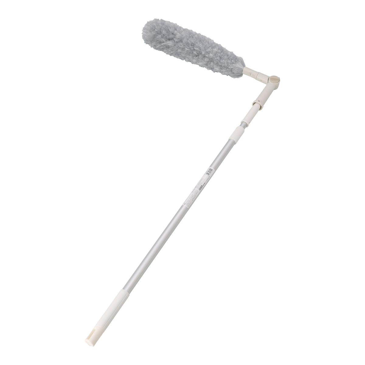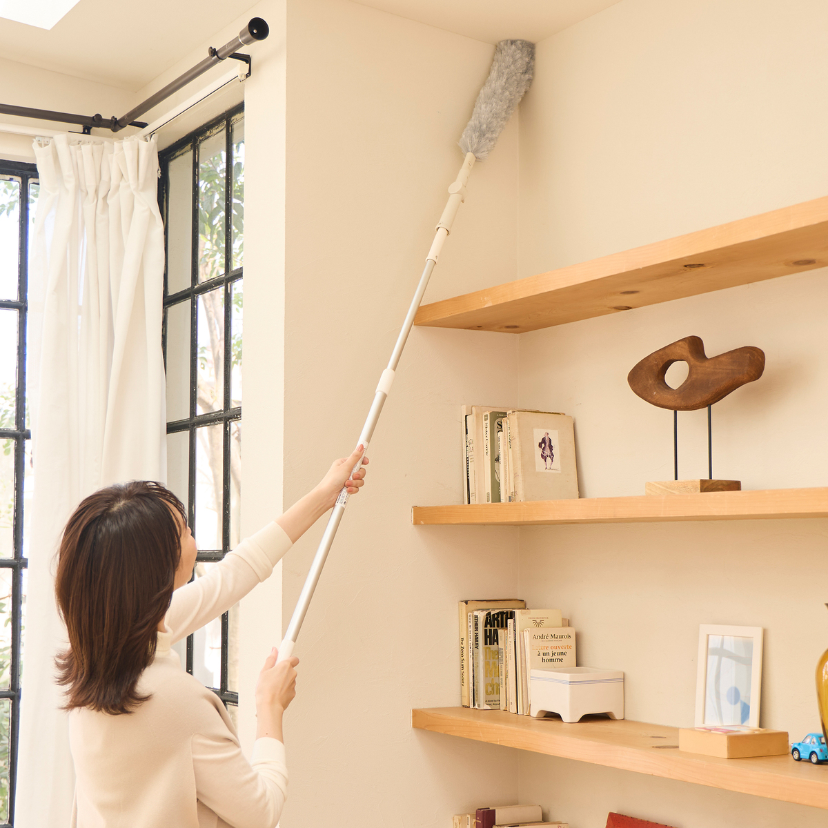導電繊維の働きで静電気を除去。ホコリを取りやすくするとともに、ホコリの再付着を抑えます。ヘッドが180°動き、ハンドルは約97.5cm〜161cmまで伸縮可能なスリムタイプ。棚上などの見えない箇所にも届きます