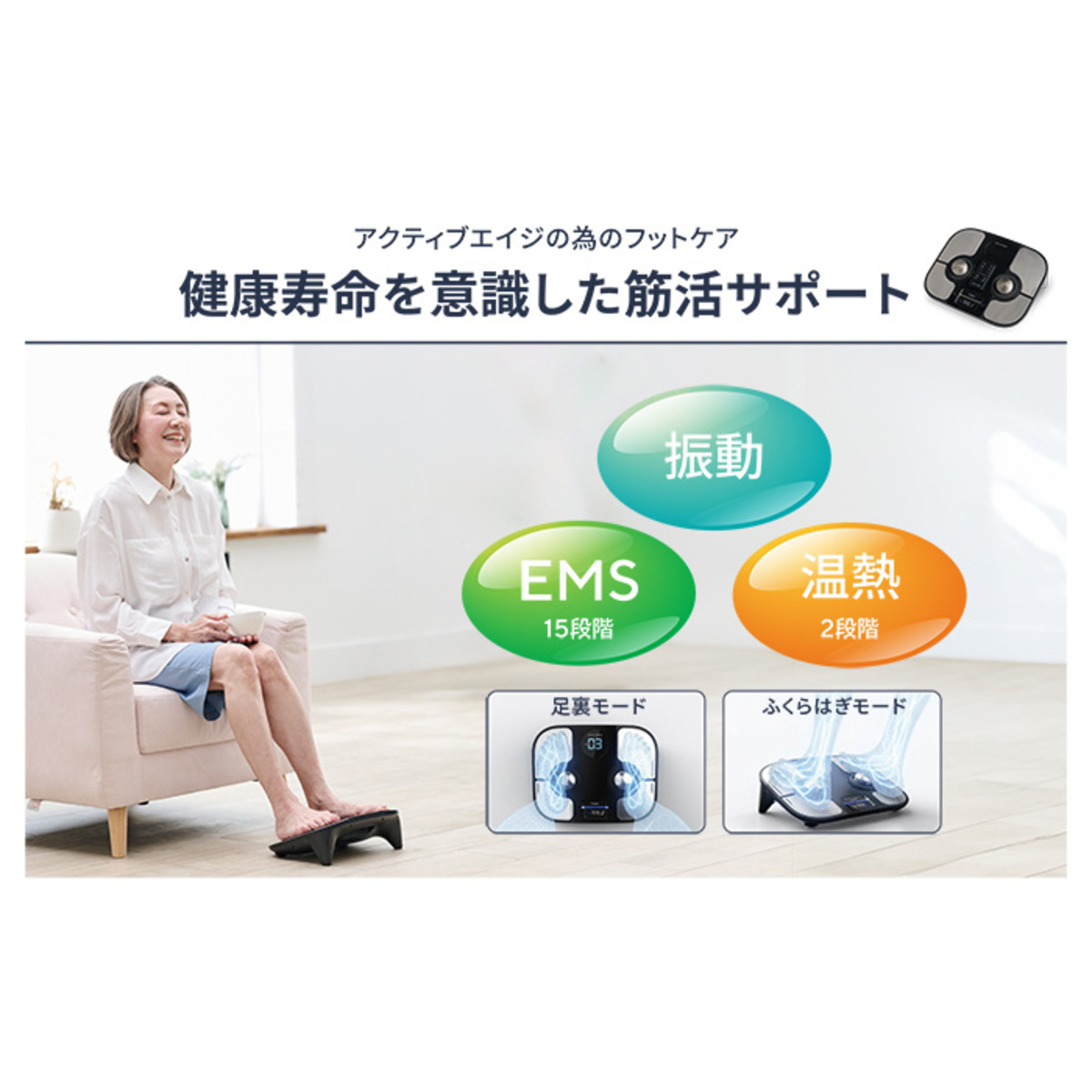 EMS、温熱、振動の3つの機能を搭載したフットケア機器です。EMSを単独で使用したり、他の機能と組合せたりと、さまざまな使い方が可能。座ったままのトレーニング*なので、テレビや本を楽しみながら続けやすいのも魅力です