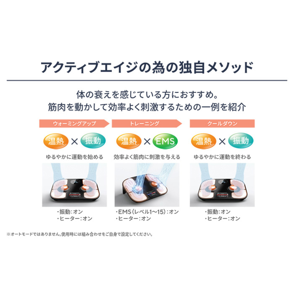 EMS機能は2つのモードを搭載。足裏モードは足裏の前後のプレートの間でEMSが機能し、足部の内在筋を集中的に、ふくらはぎモードは脚を通して左右のプレート間でEMSが機能し、足裏からふくらはぎまでをトレーニングします。温熱機能は温度を2段階から選択可能。振動機能は1分間に約5000回の振動刺激で足裏をケアします